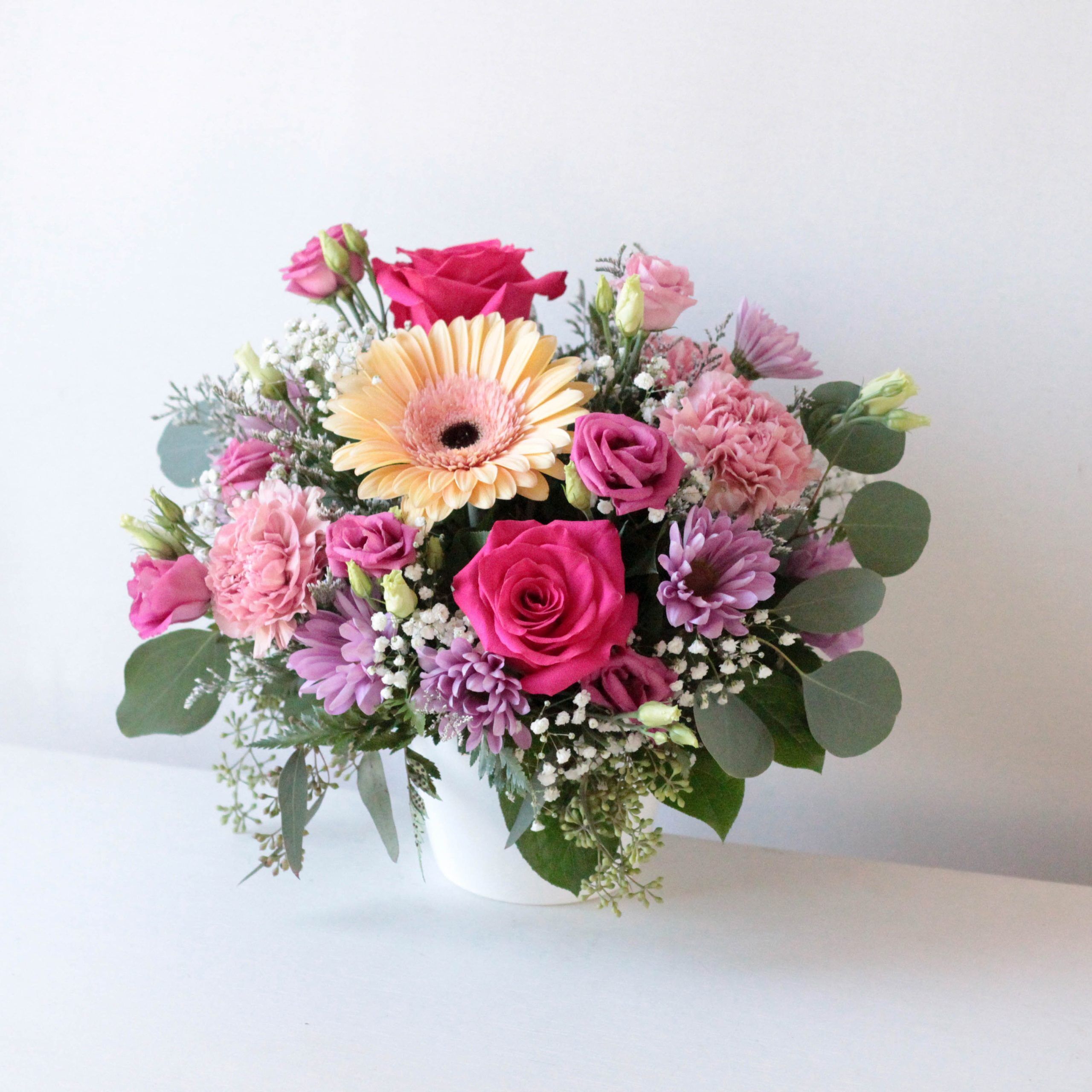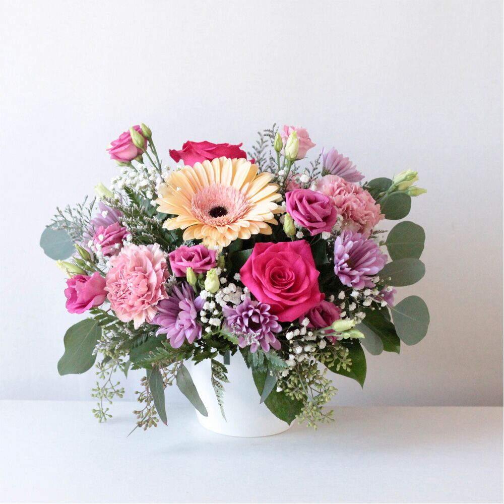 Delivered in a white ceramic pot; Arrangement measures approx. 13″ W x 12″ H