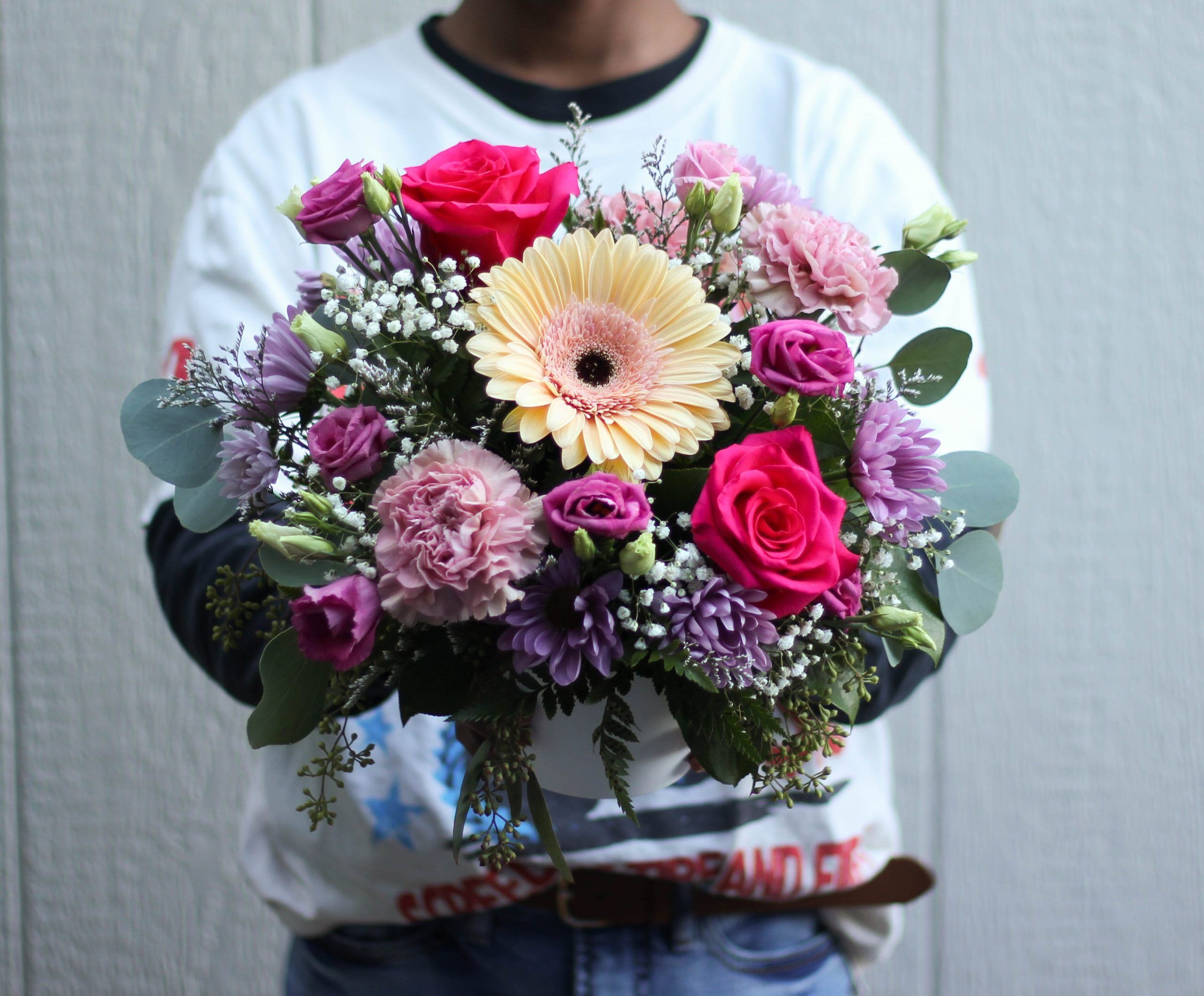 Nestled in a bed of seeded eucalyptus and seasonal fillers.