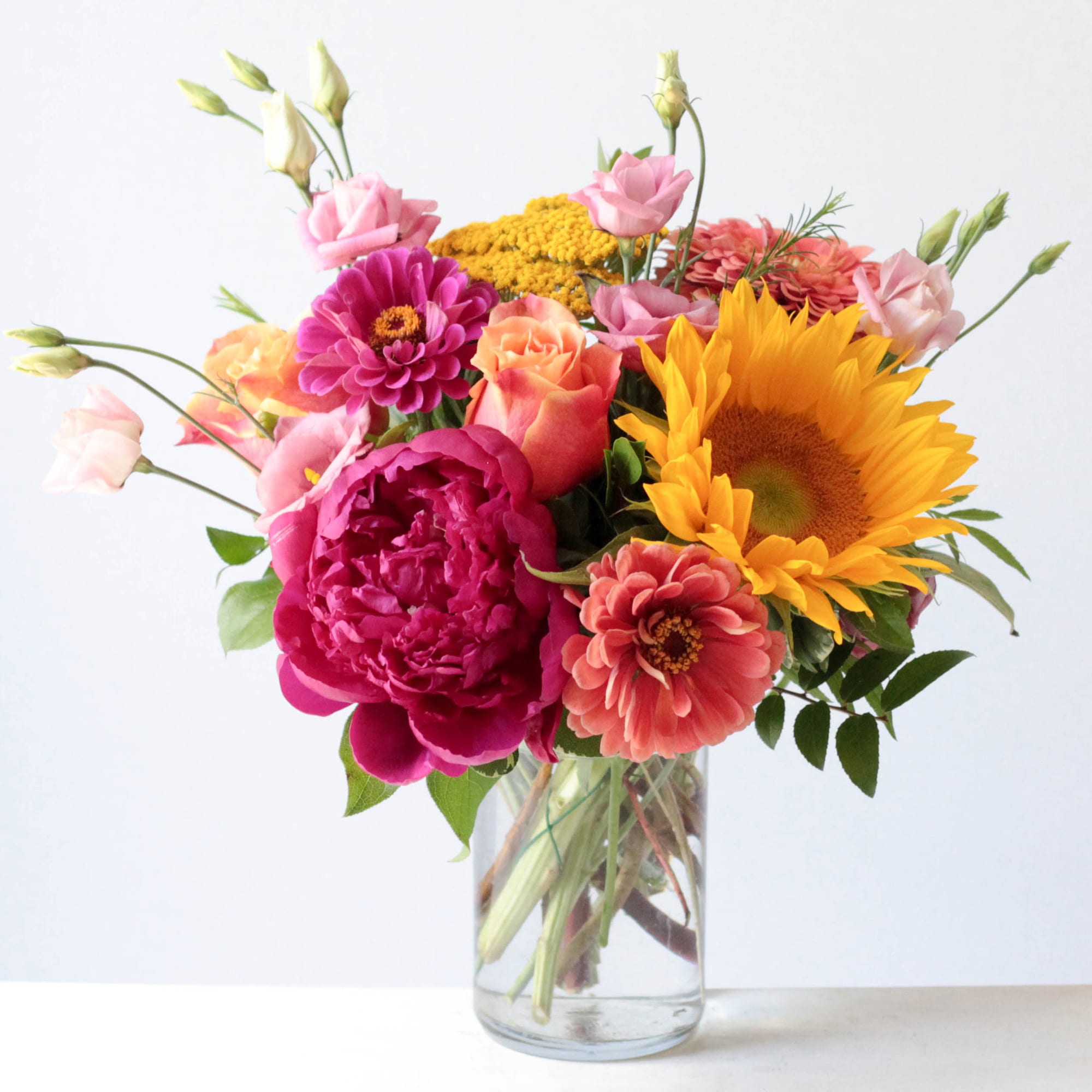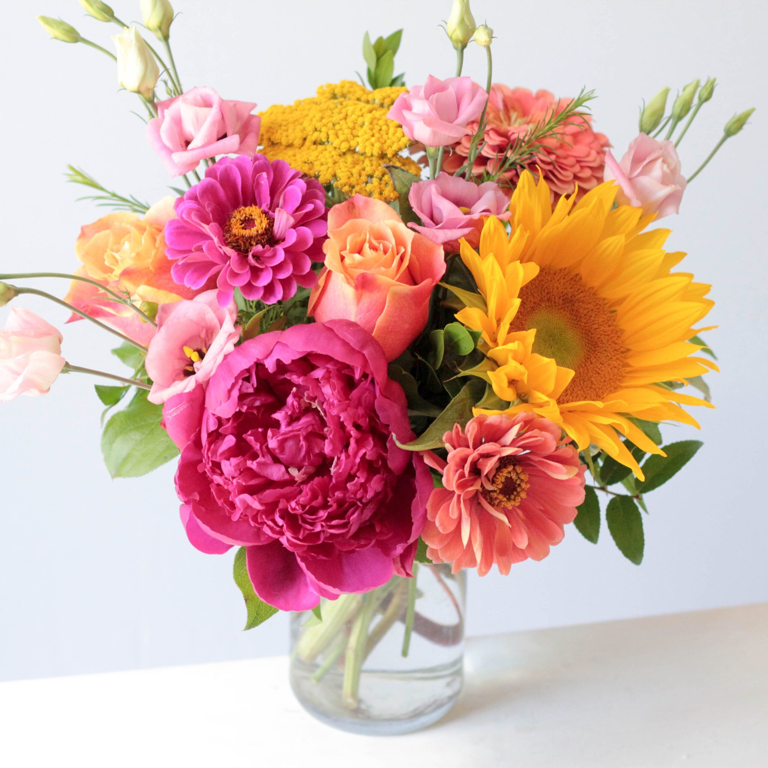 A pretty assortment, featuring a GORGEOUS Peony supported by other coordinating seasonal blooms, in a shorter round style.