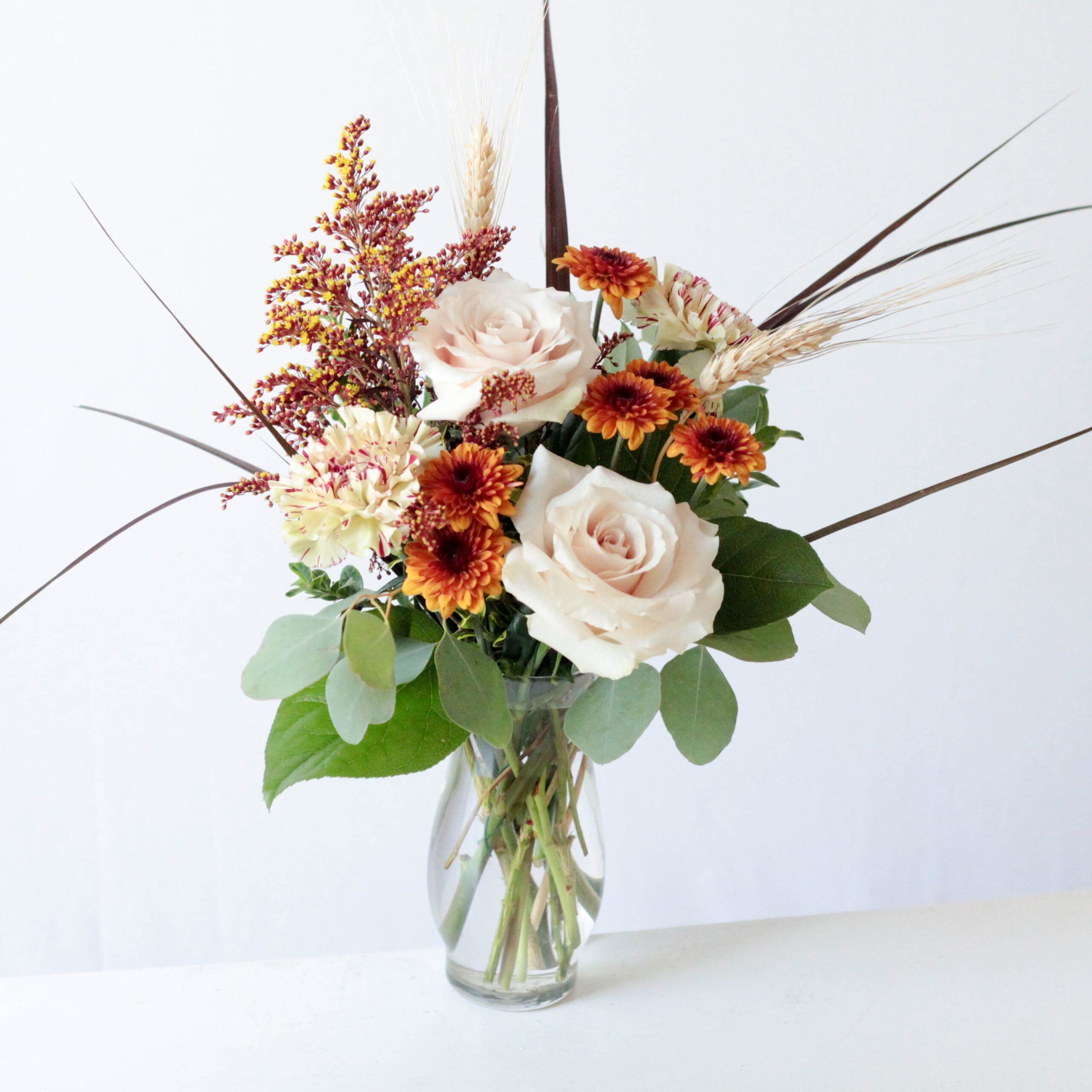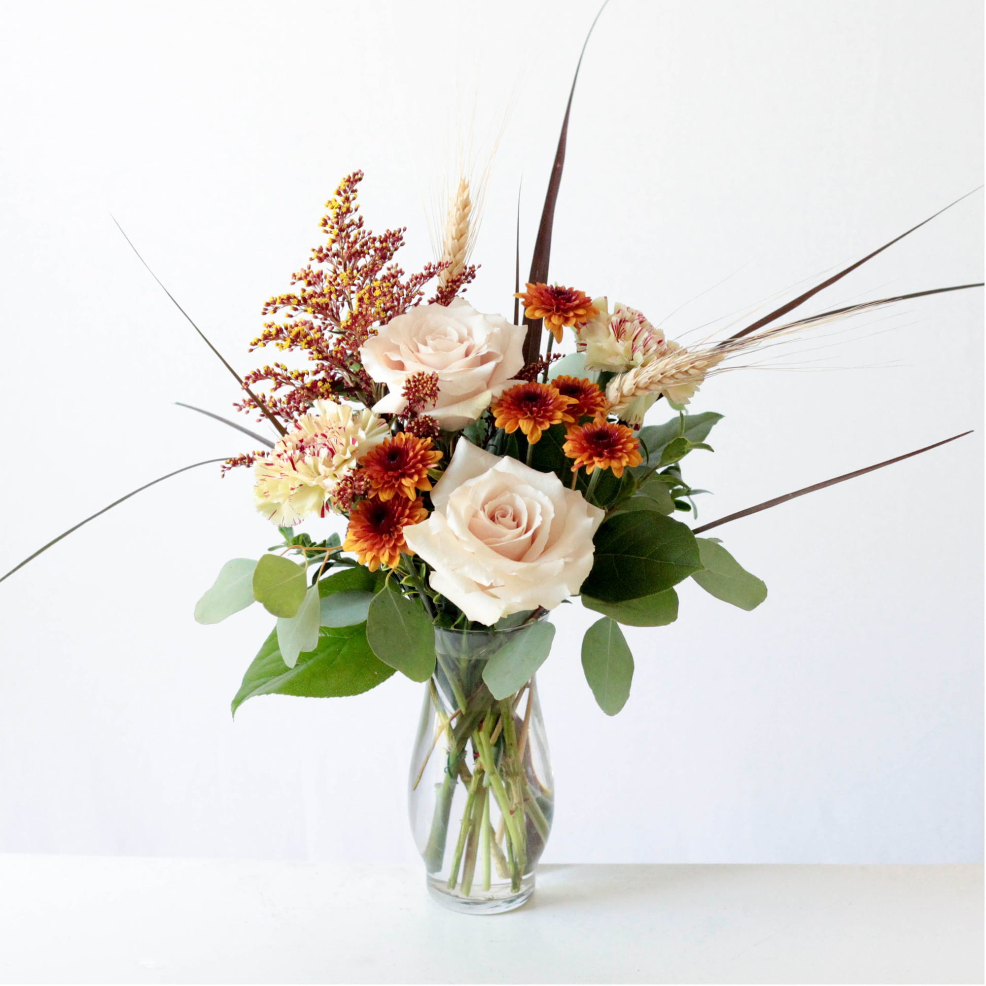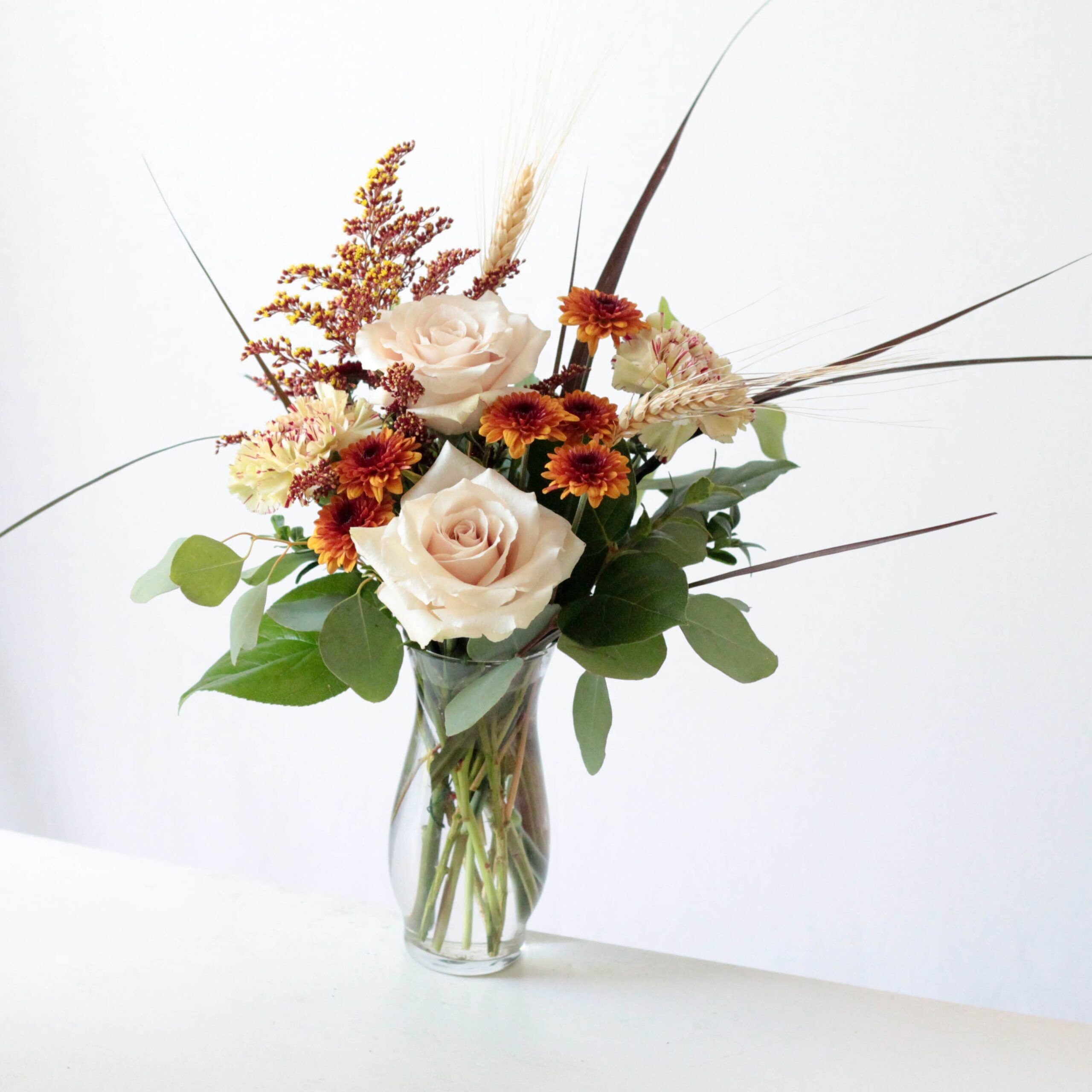 A fresh bouquet of assorted seasonal fresh cuts arranged in a clear glass vase.