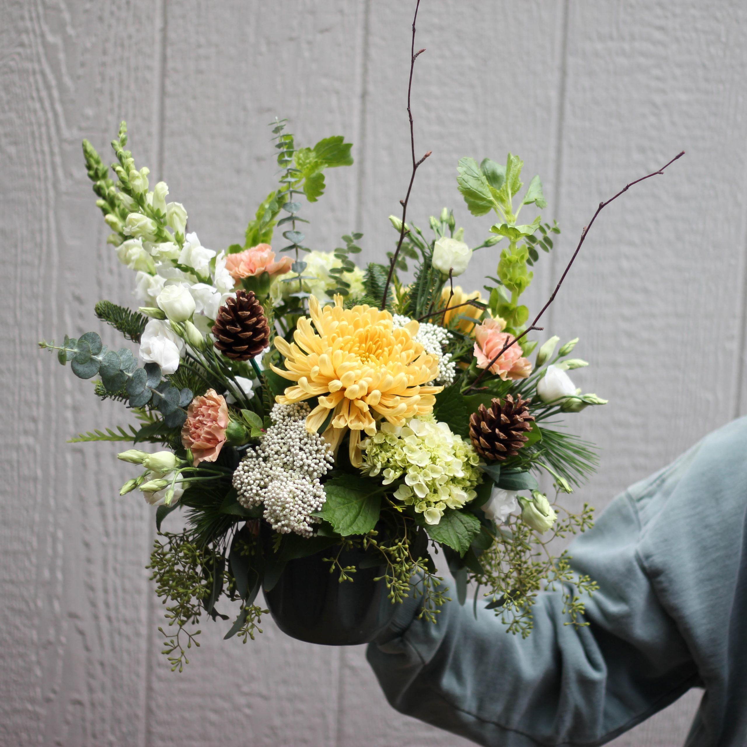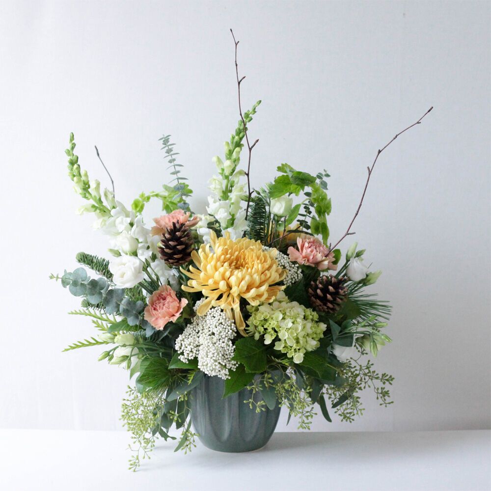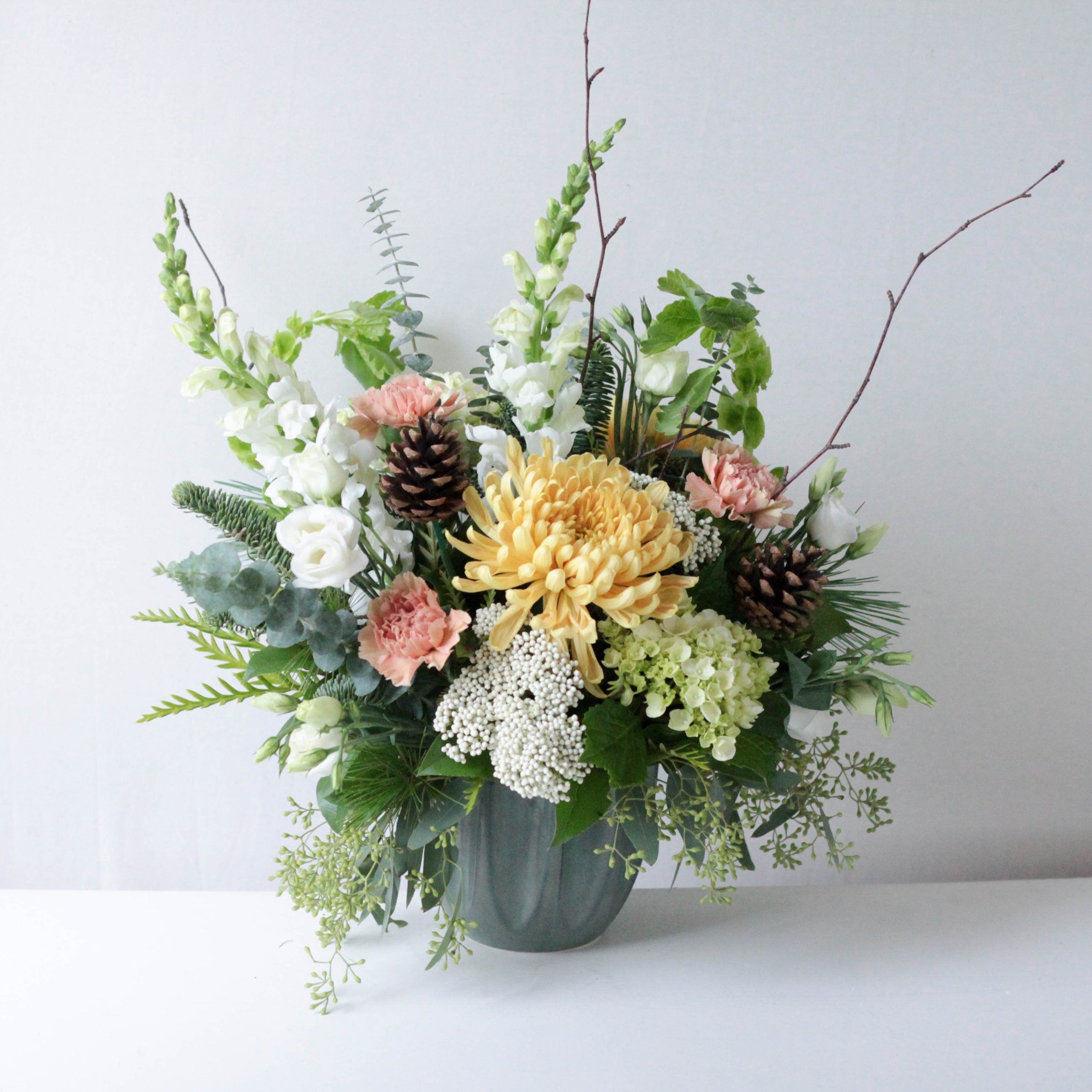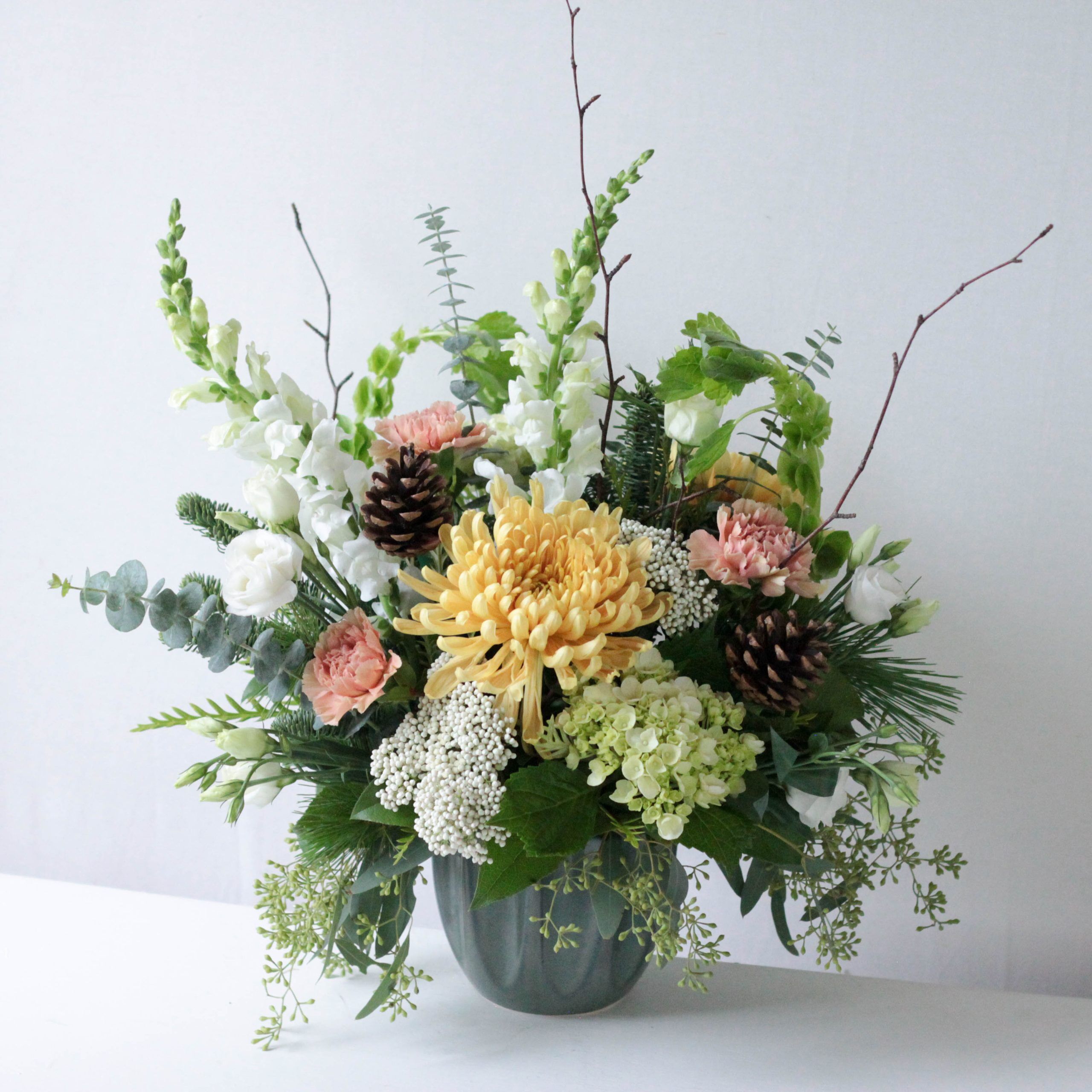 An abundant display of mini green hydrangea, golden mums, snapdragons, bells of Ireland, carnations and lisianthus. Surrounded by seasonal greenery, filler flowers and birch branches for accent.