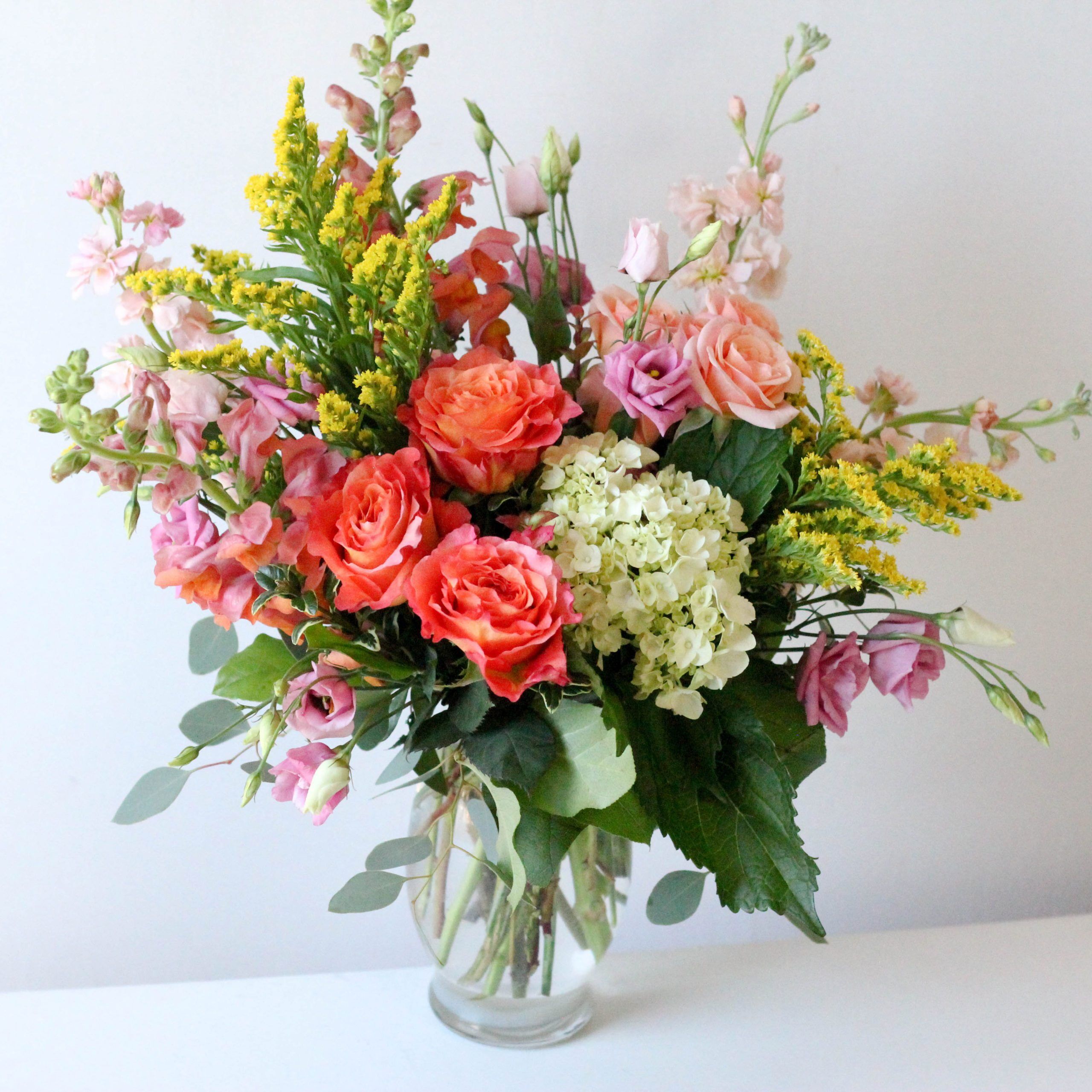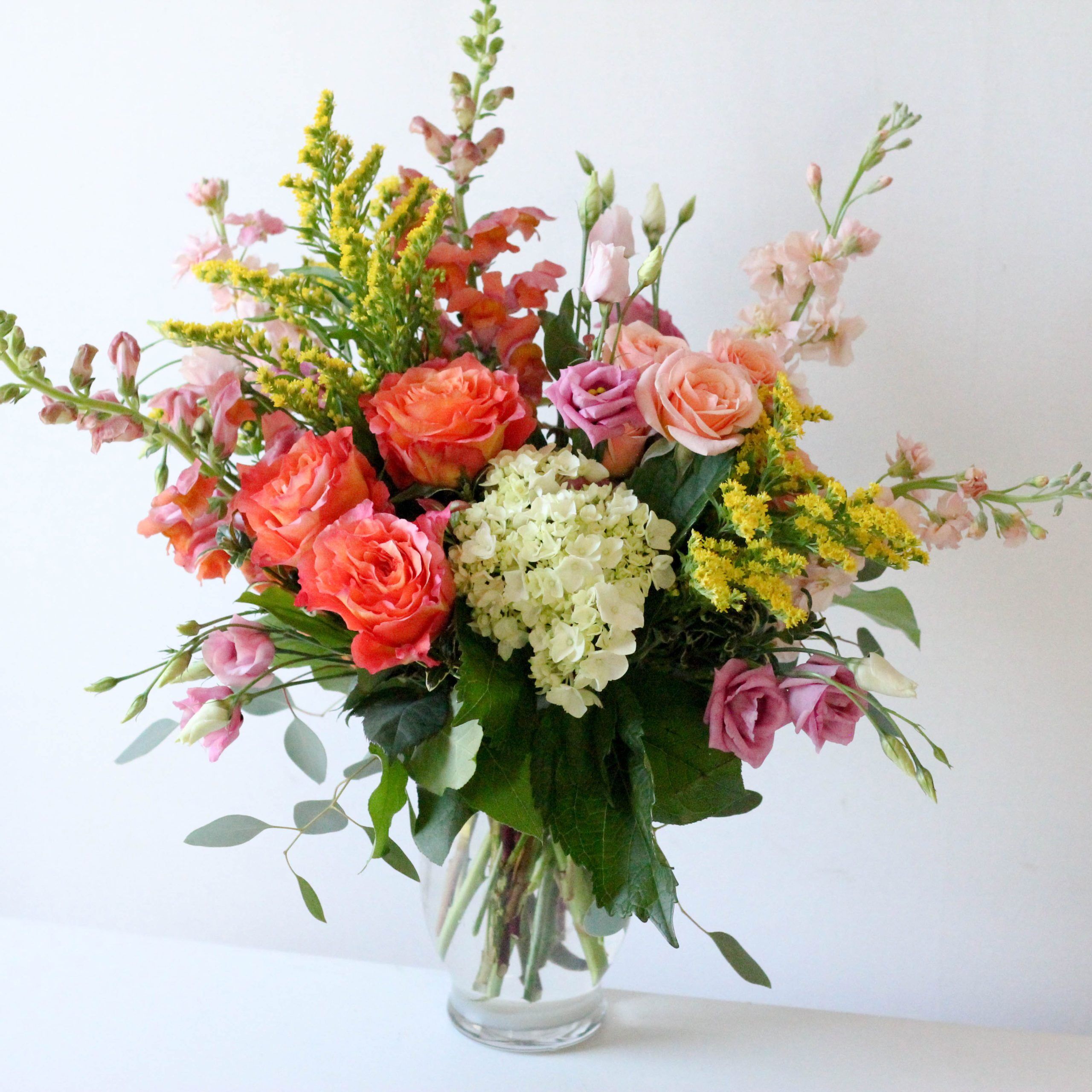Roses, mini green hydrangea, spray roses, fragrant stock and coordinating fillers and greens.