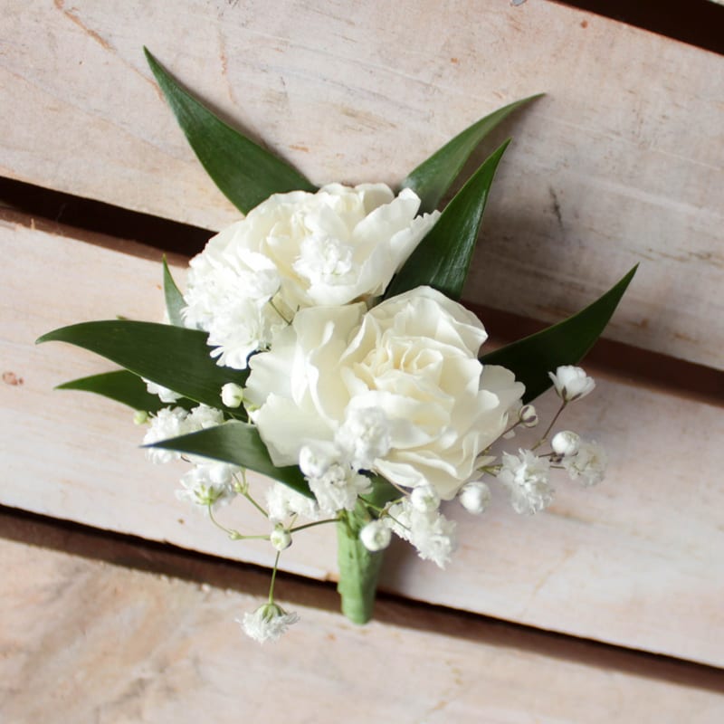 Two pixie carnations accented by greens and filler. Attachment pins are included.
