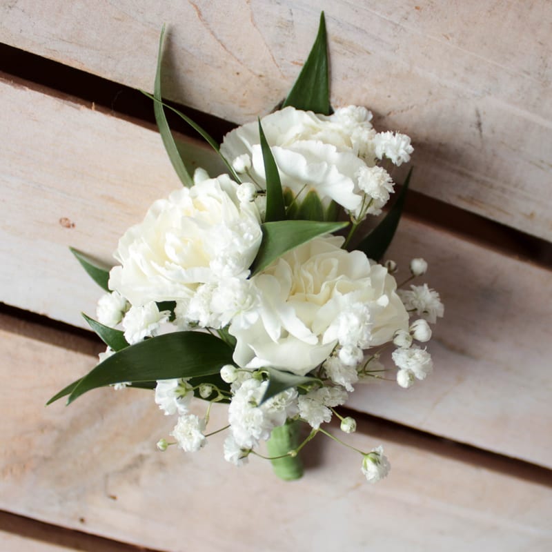 Three pixie carnations accented by greens and filler. Attachment pins are included.