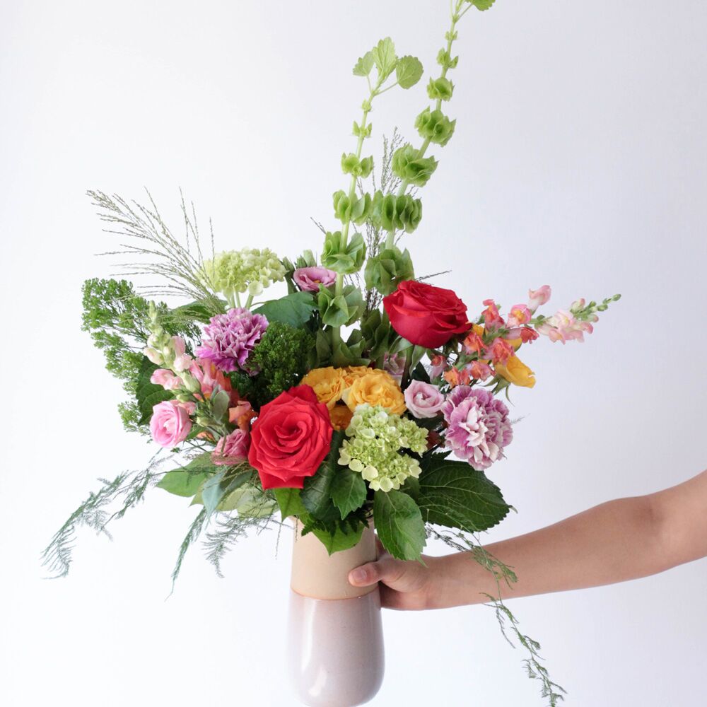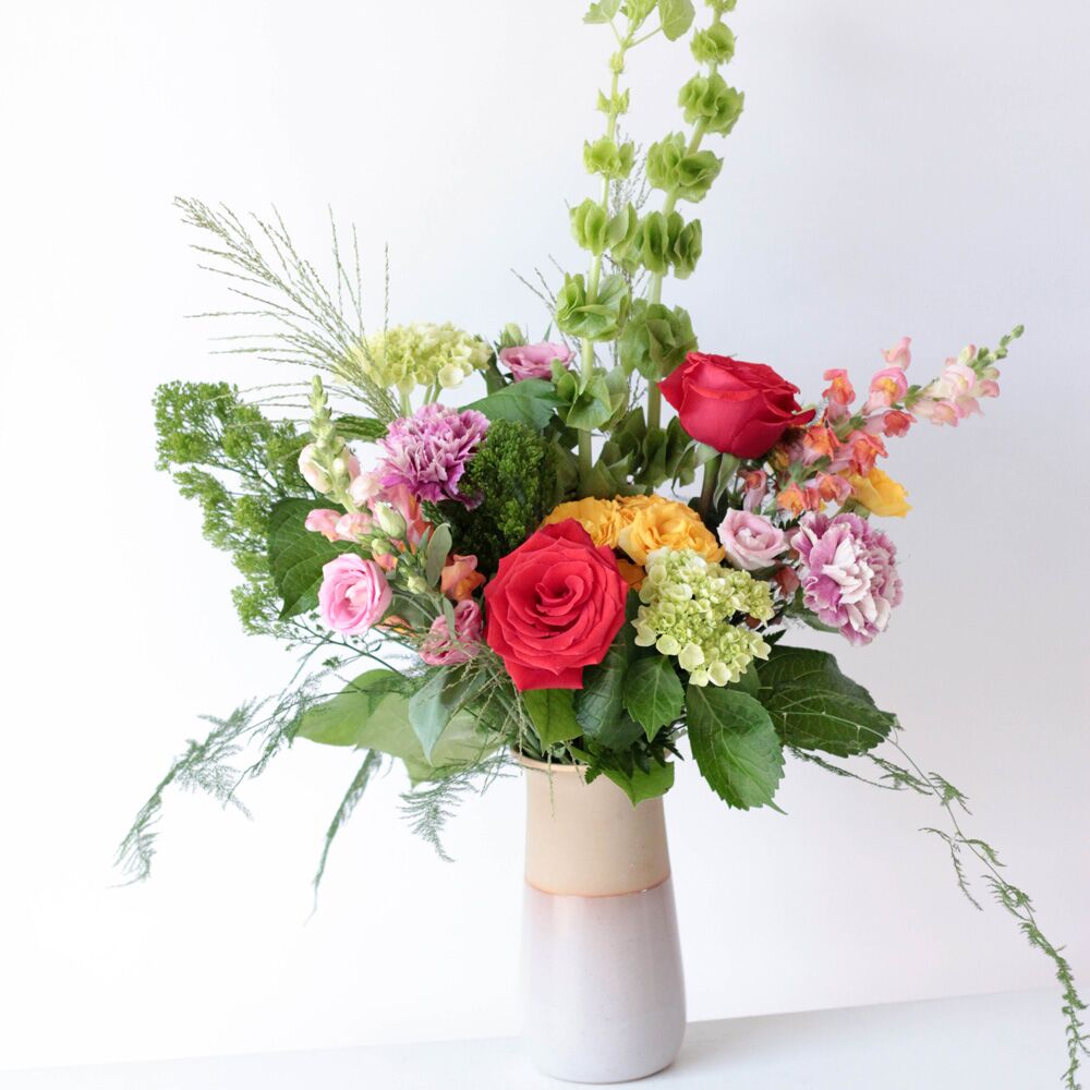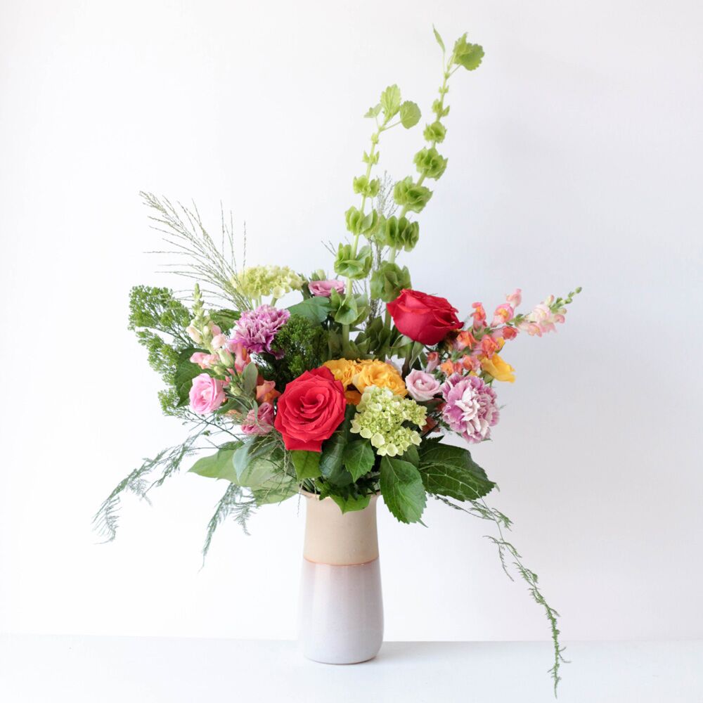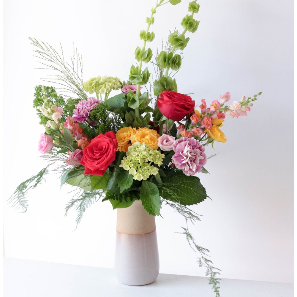 A lush and vibrant design that brings together romance, texture, and timeless beauty. This fresh flower arrangement features Nina roses, delicate spray roses, mini green hydrangea, graceful bells of Ireland, elegant snapdragons, charming carnations, and soft lisianthus, all styled in a classic Warren vase.