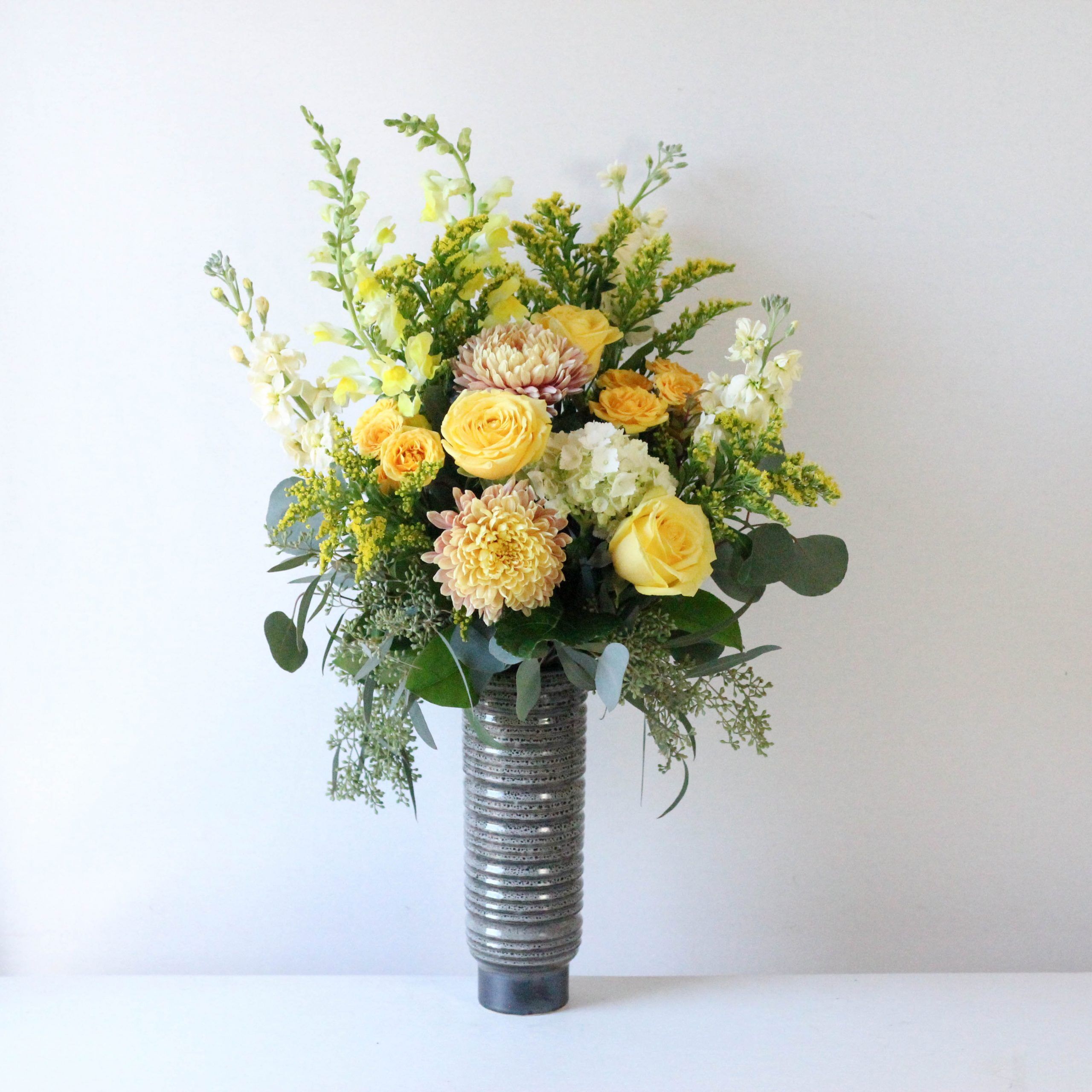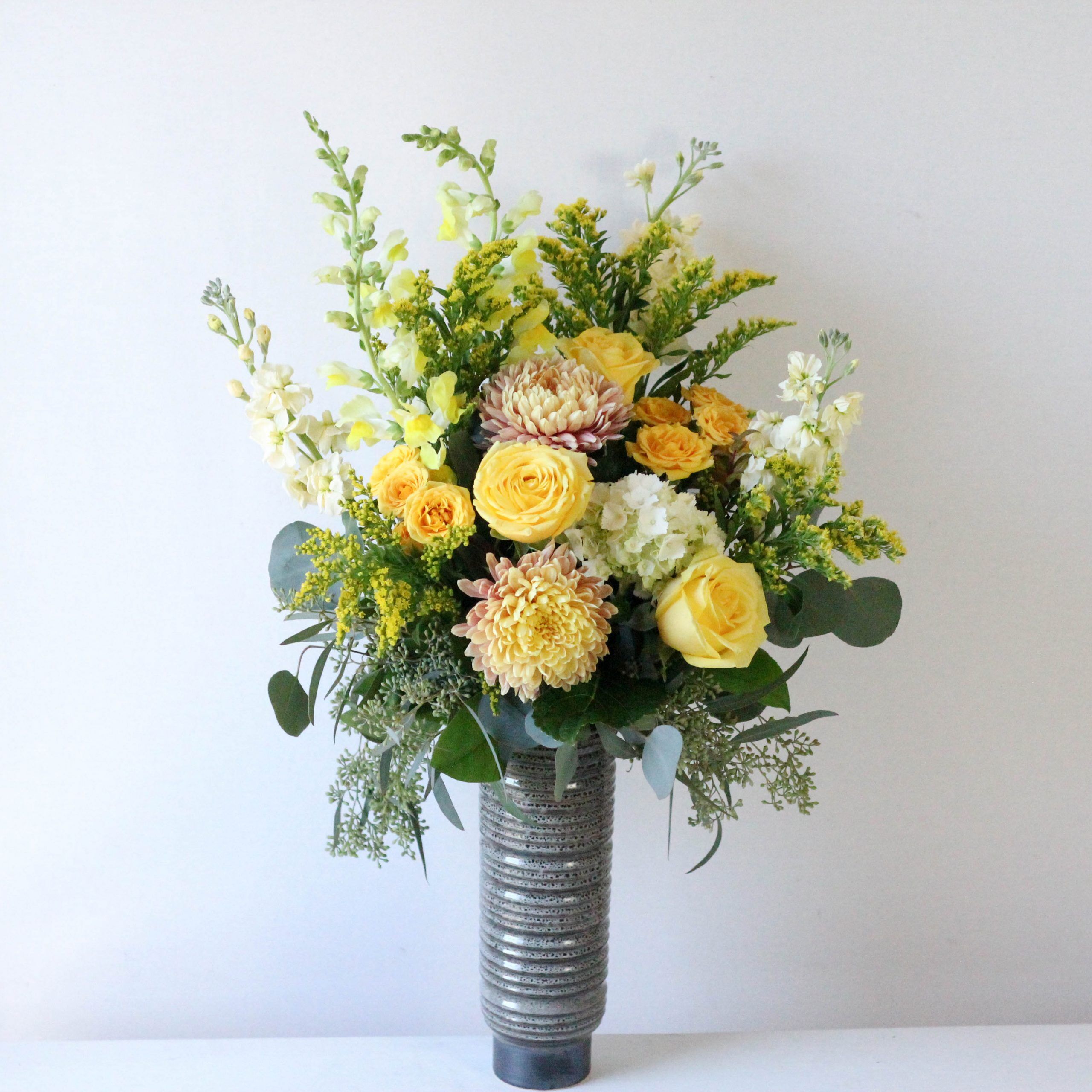 Fresh roses, snapdragons, mums, mini green hydrangea and fragrant stock are artfully arranged in a unique Larson vase.