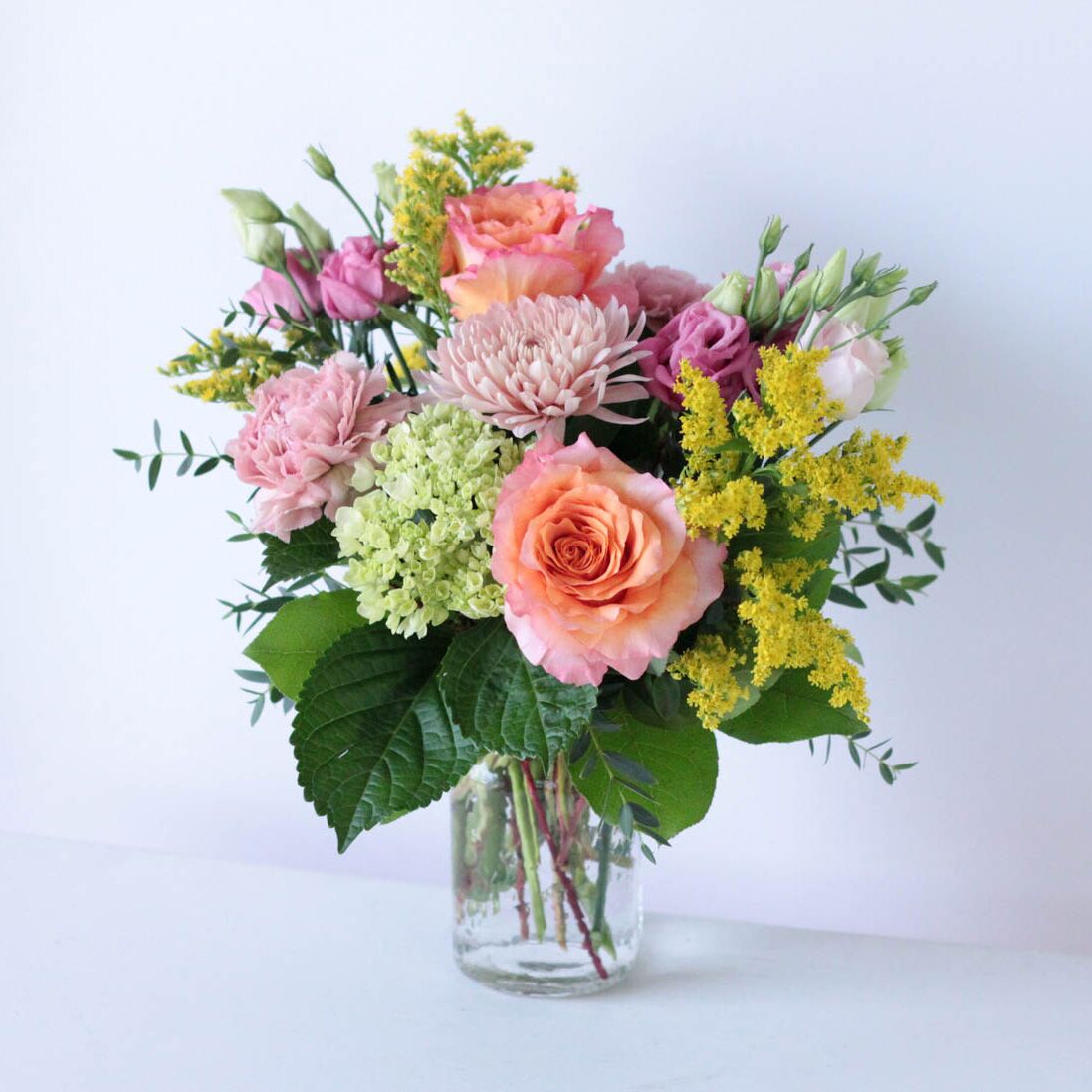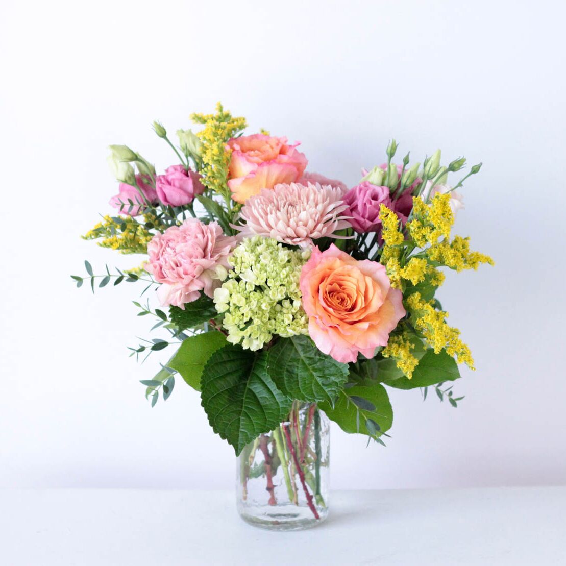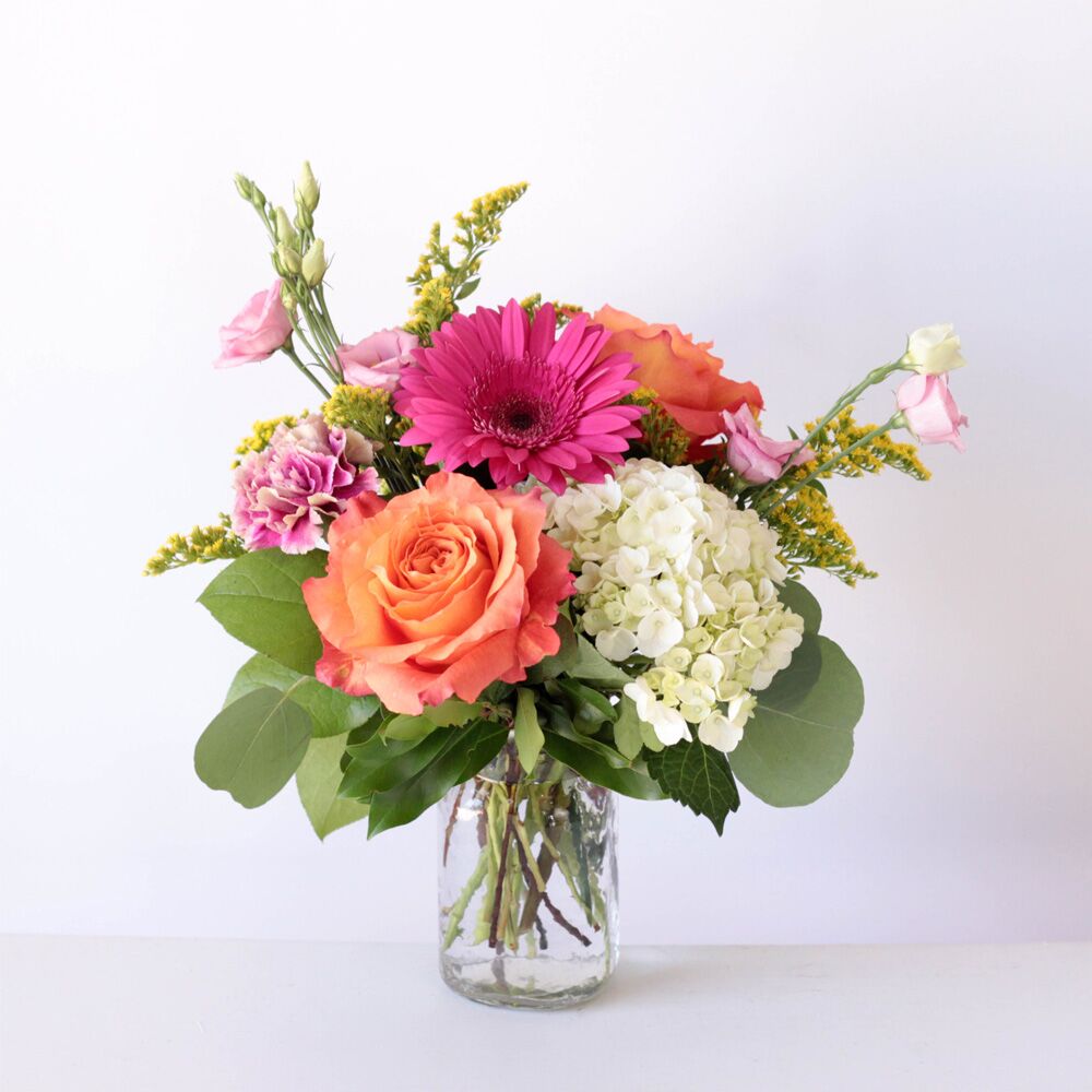 Roses, a Gerbera daisy, a mini green hydrangea, carnations, lisianthus, and a bright filler flower are arranged in a clear glass vase.