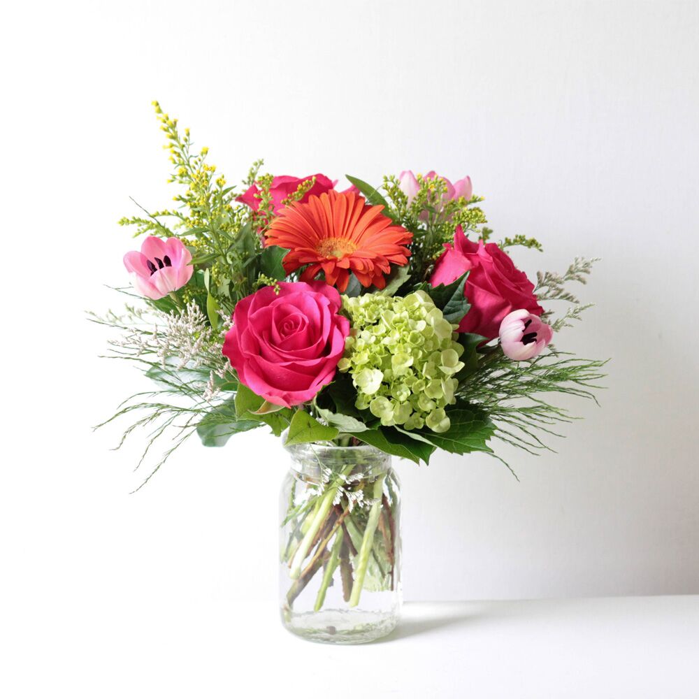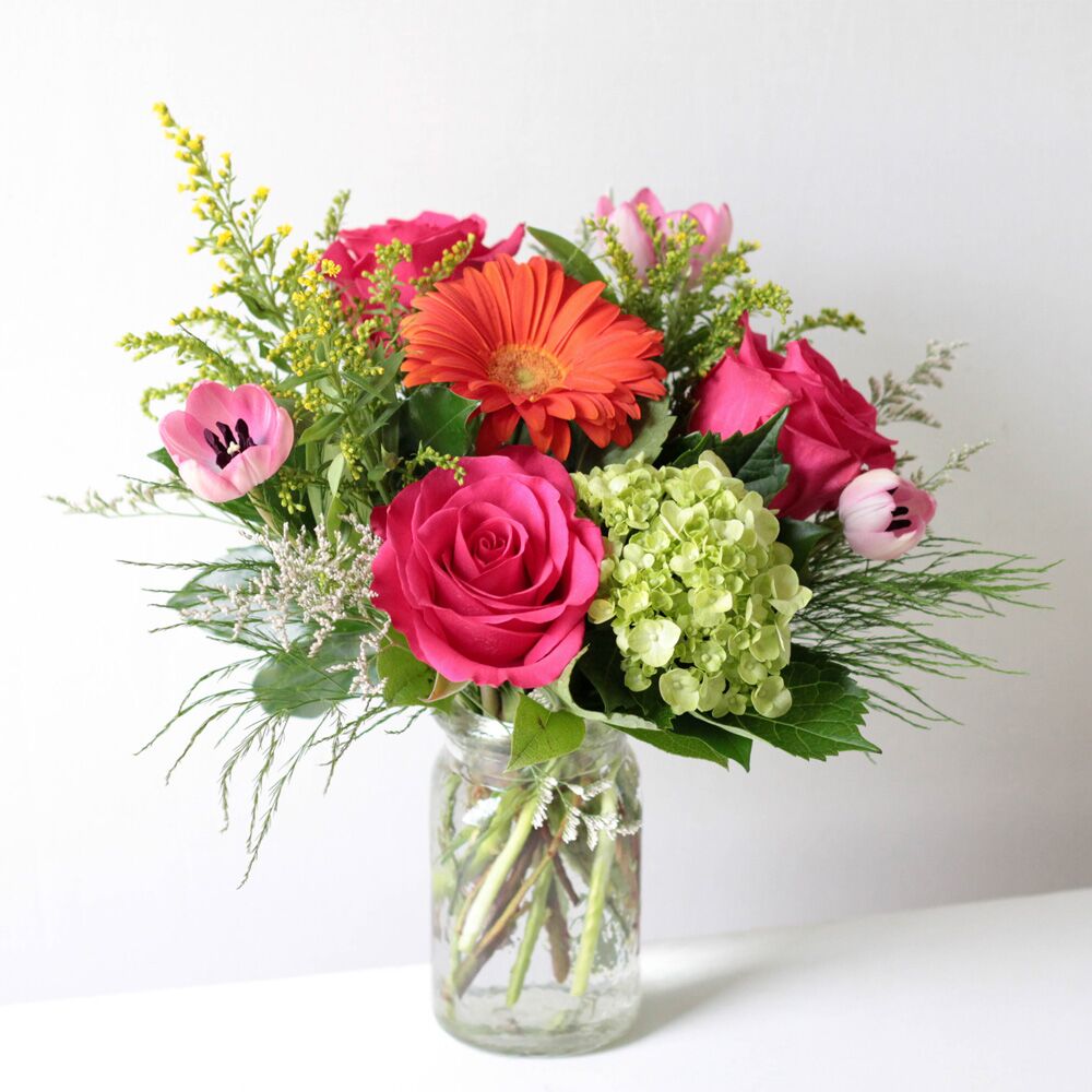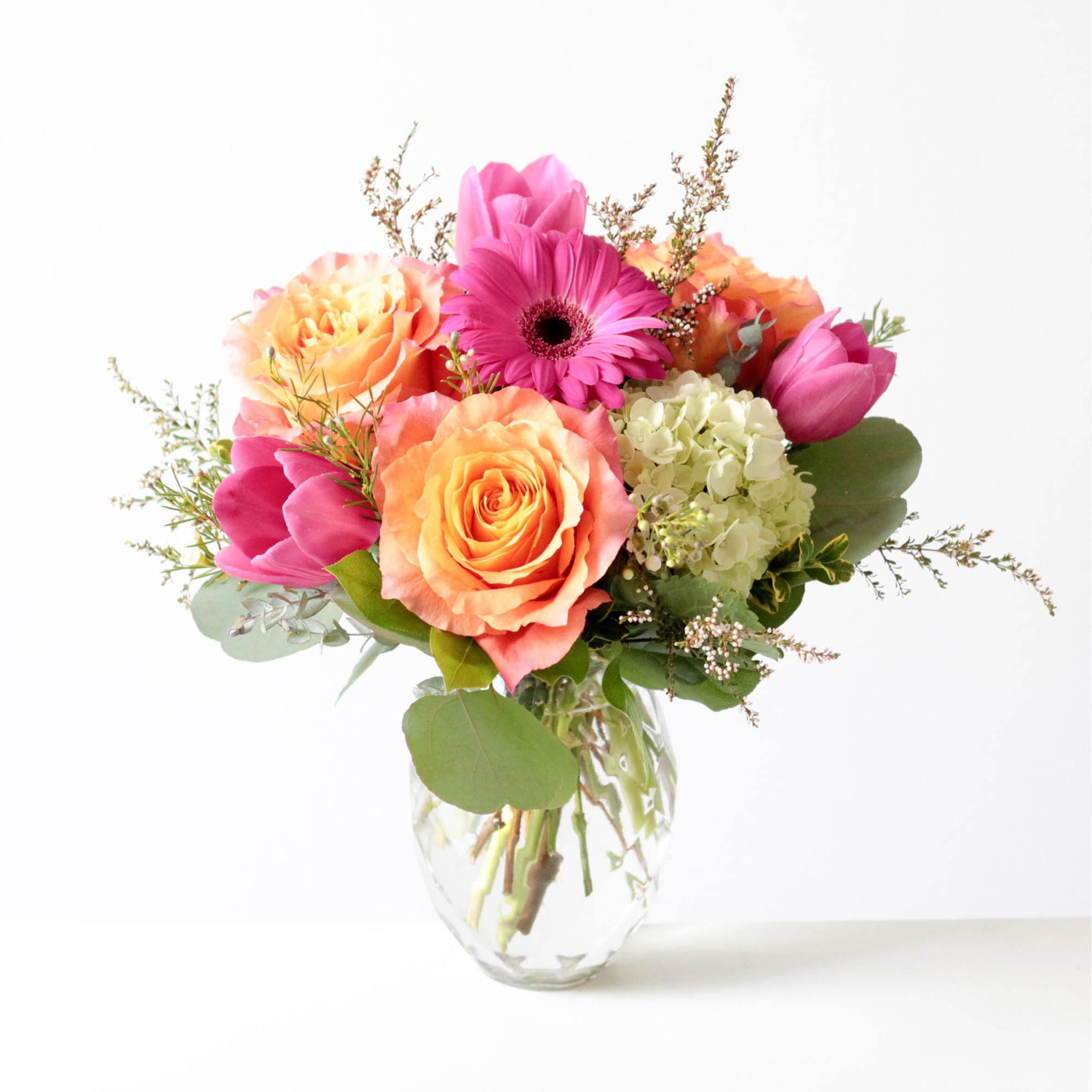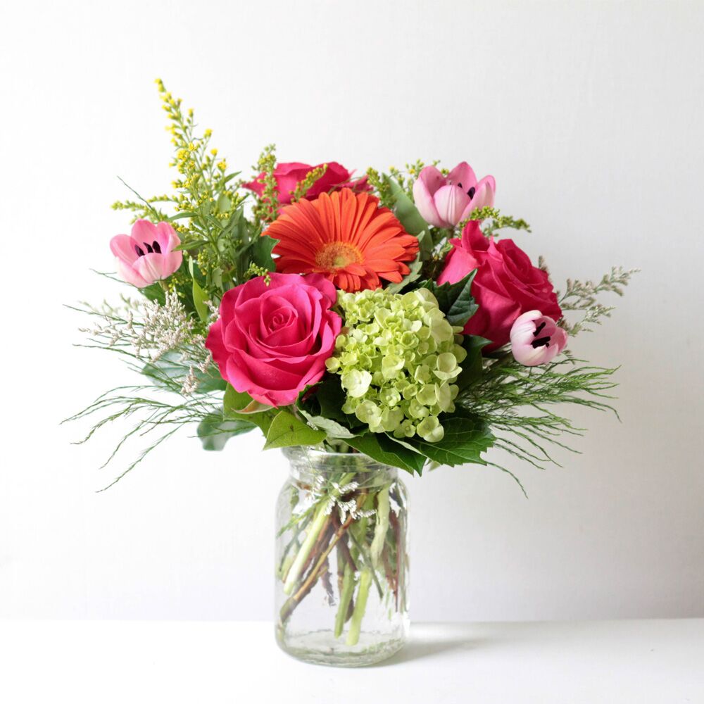 Tulips, roses, a Gerbera daisy and mini green hydrangea are arranged in a clear glass vase.