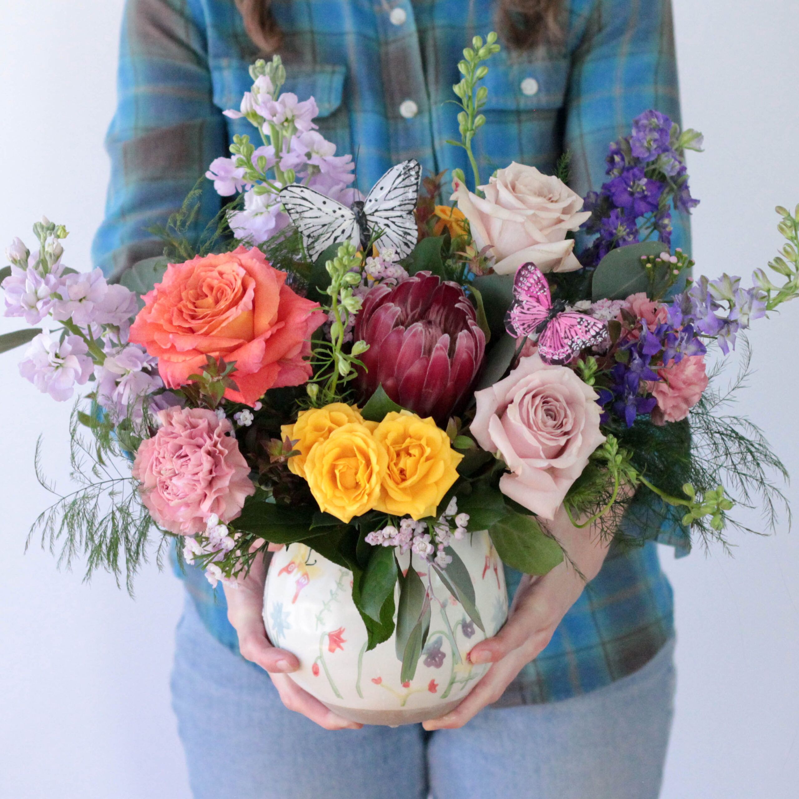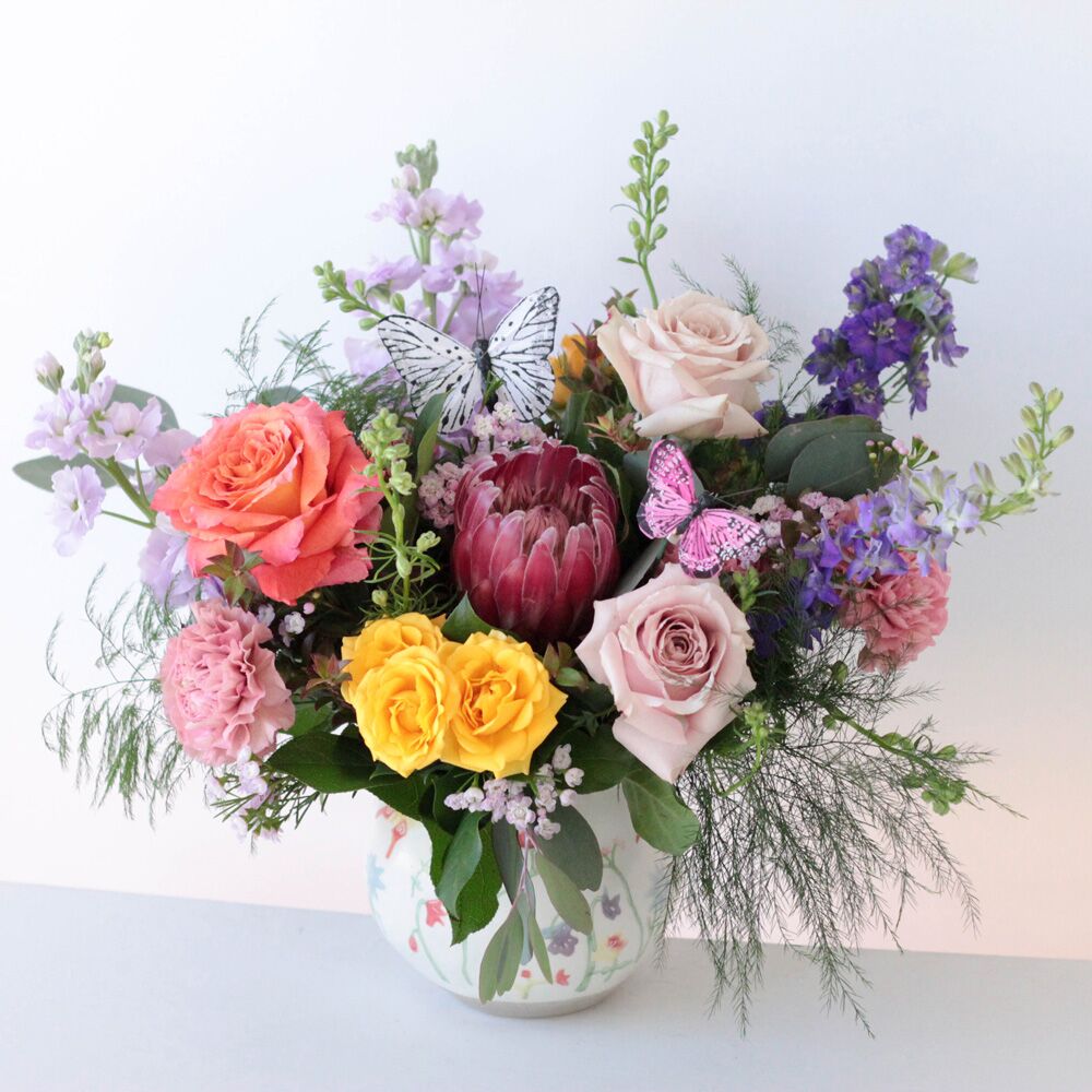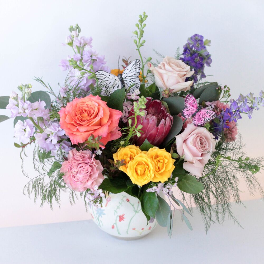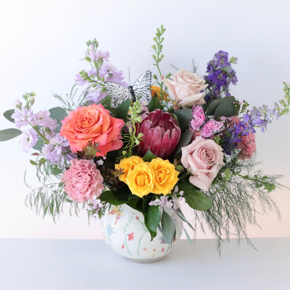 A cheerful garden-inspired arrangement featuring roses, carnations, protea, and seasonal blooms, accented with playful butterflies. Perfect for brightening any space.