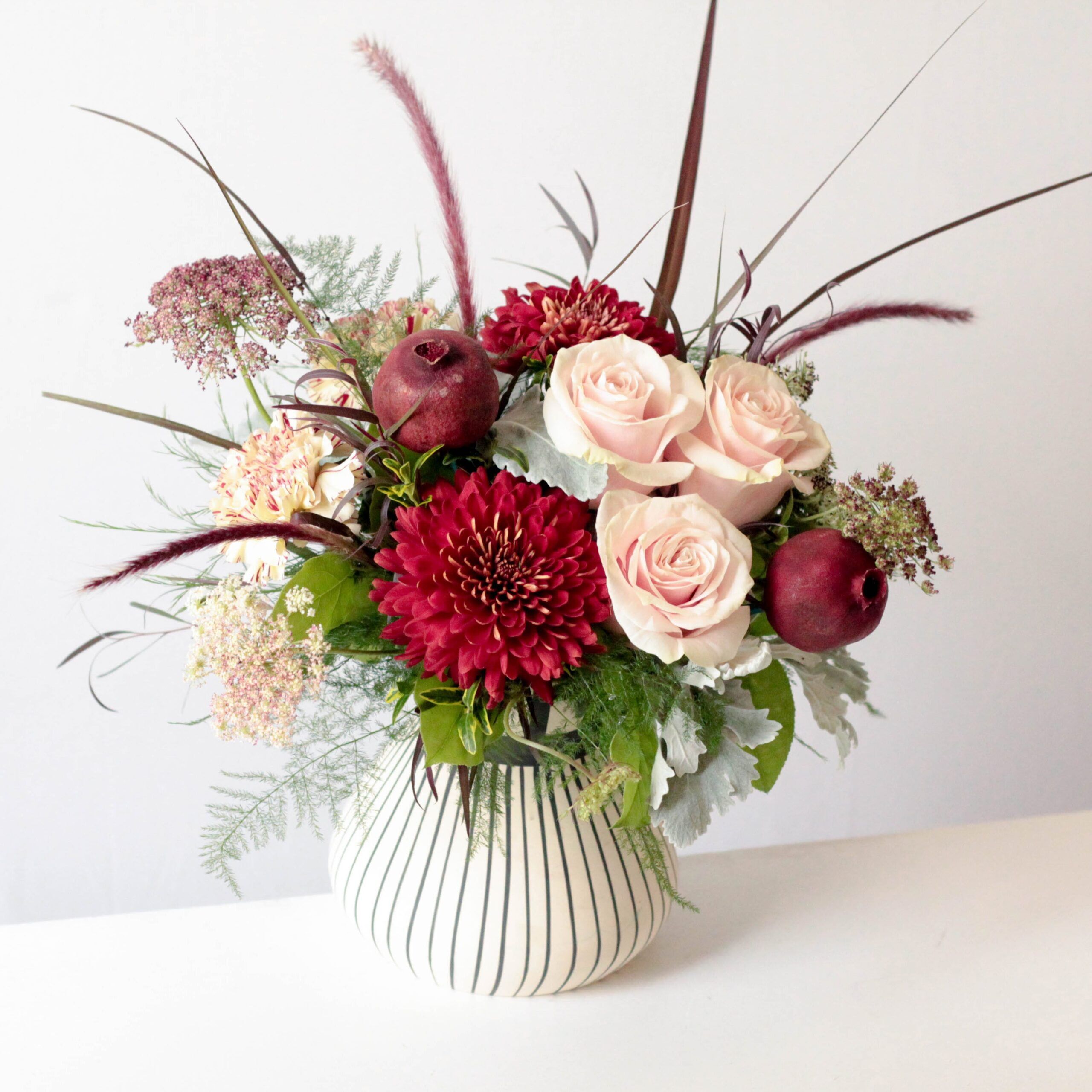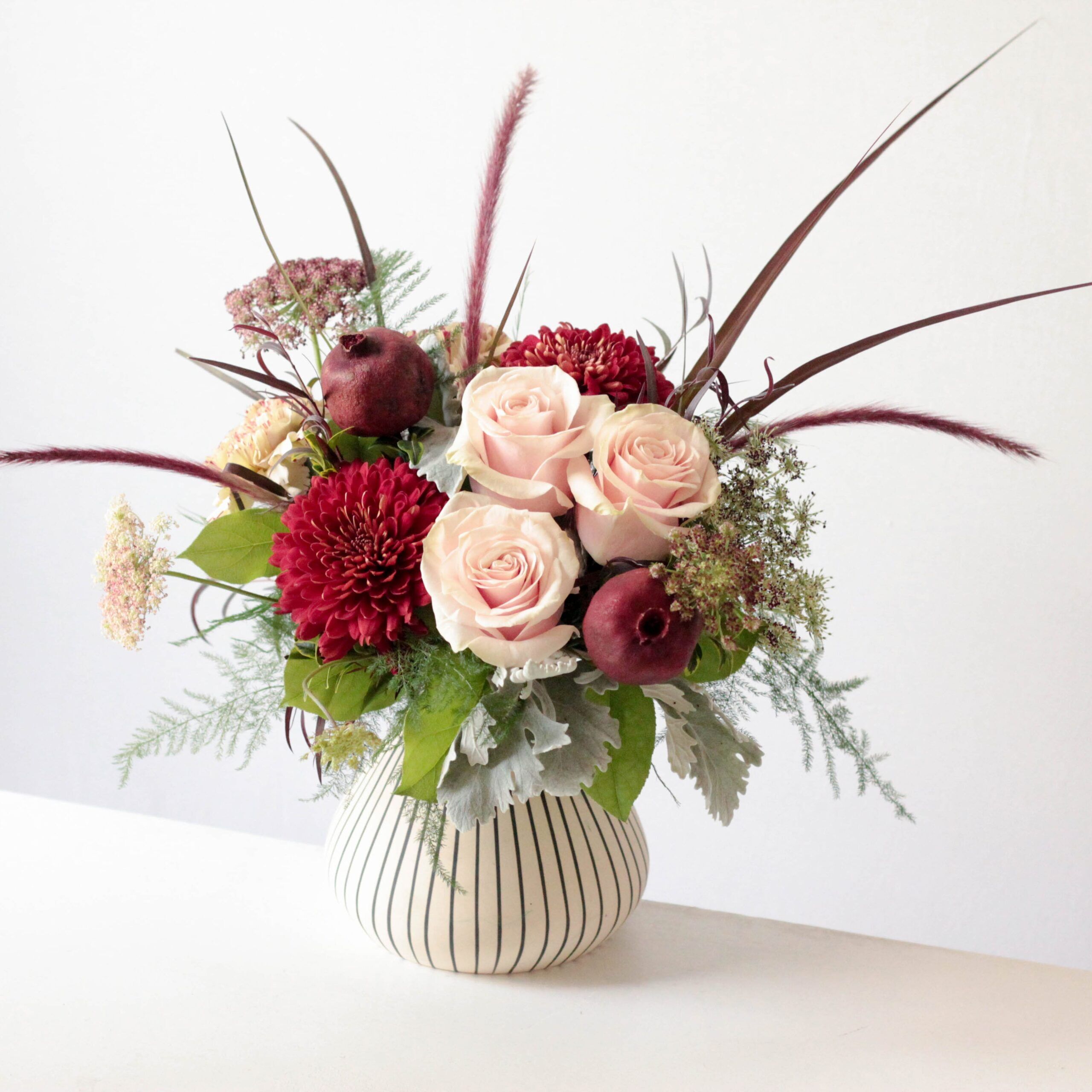 Beautiful light roses are off set by deep crimsons, lively textures of fall greens and adorned by dried pods.