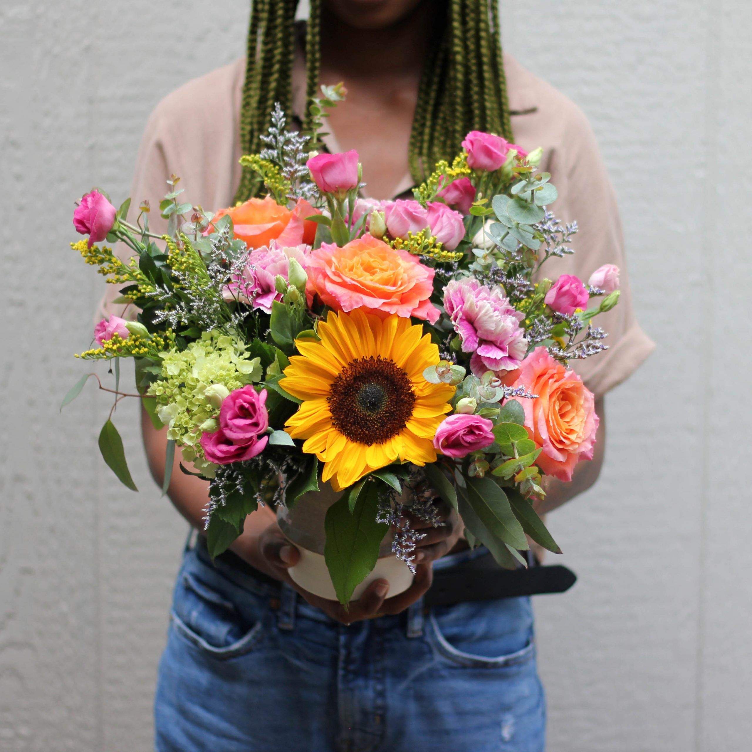 A golden sunflower as bright as the sun is haloed by three beautiful Free Spirit roses and other coordinating summery blooms.