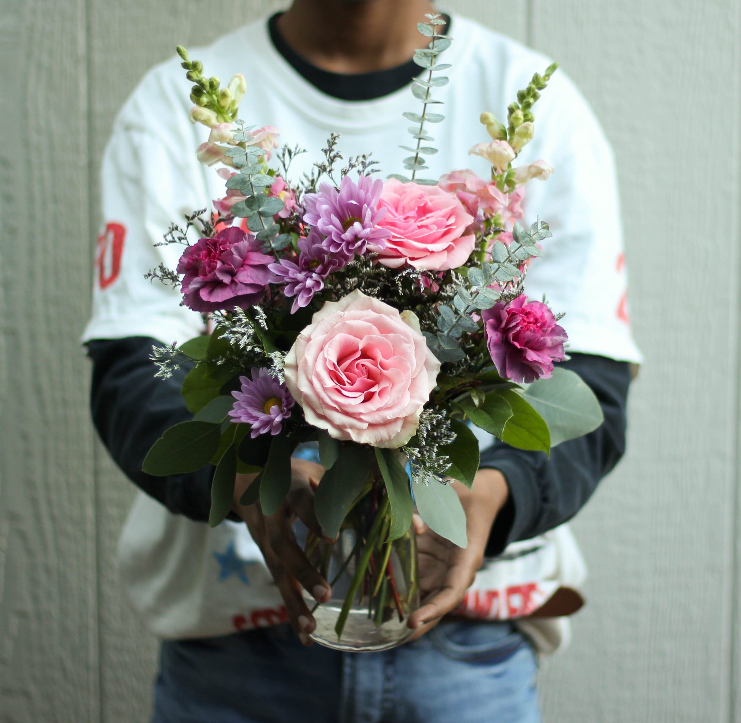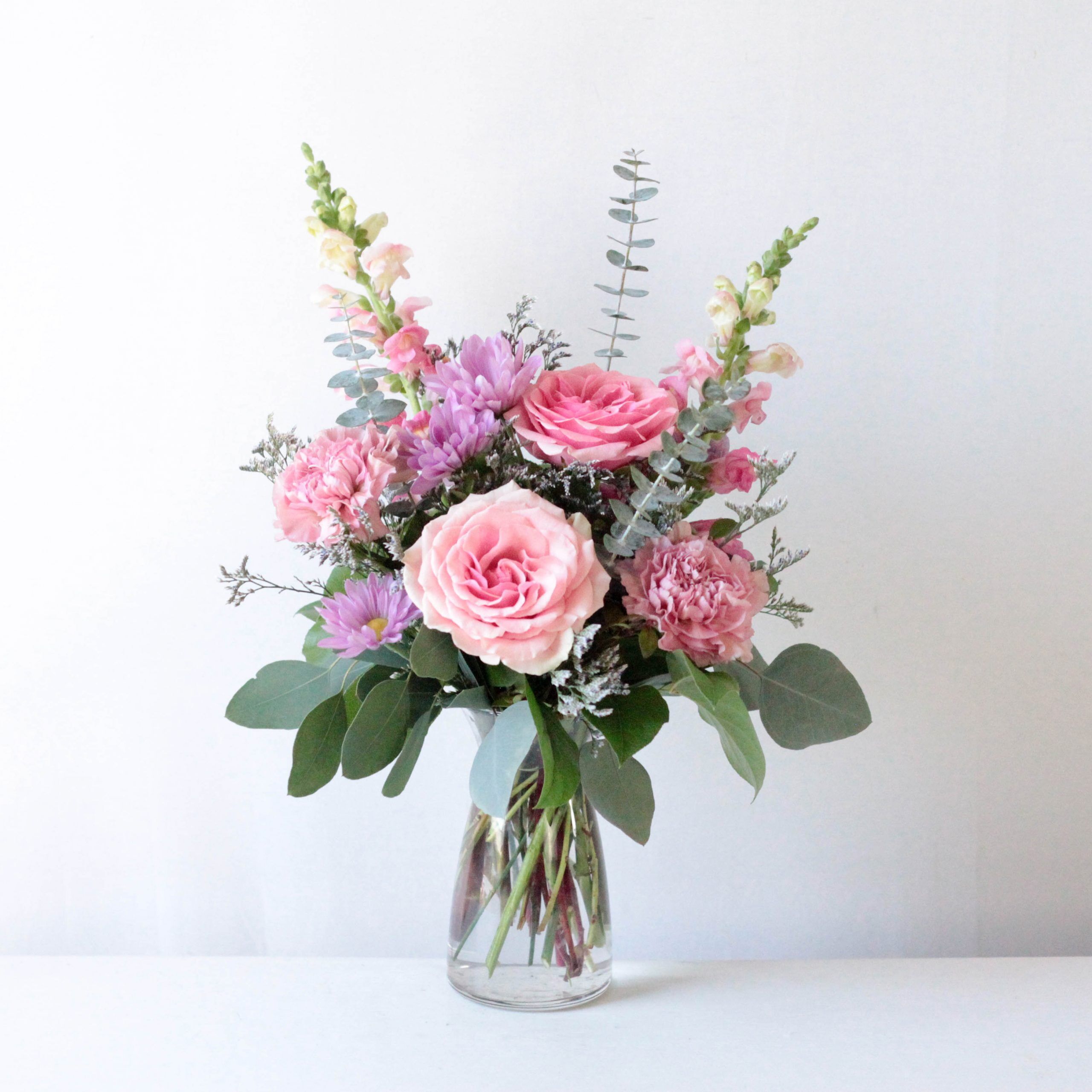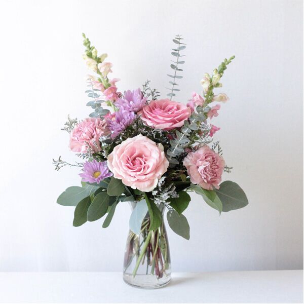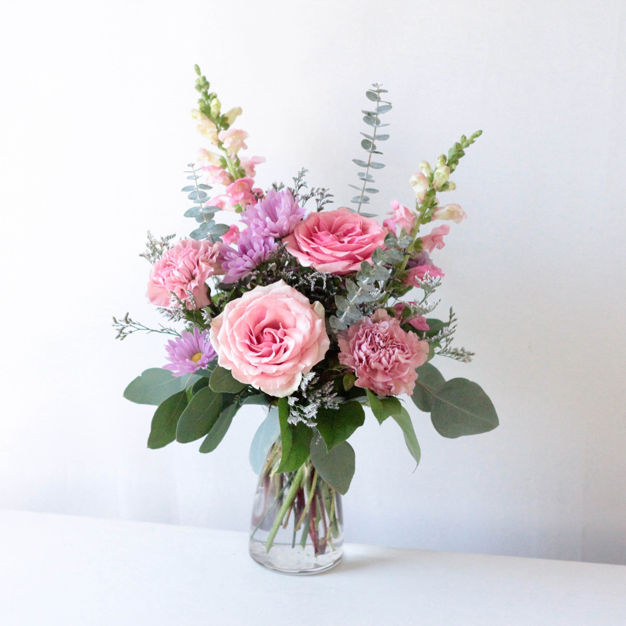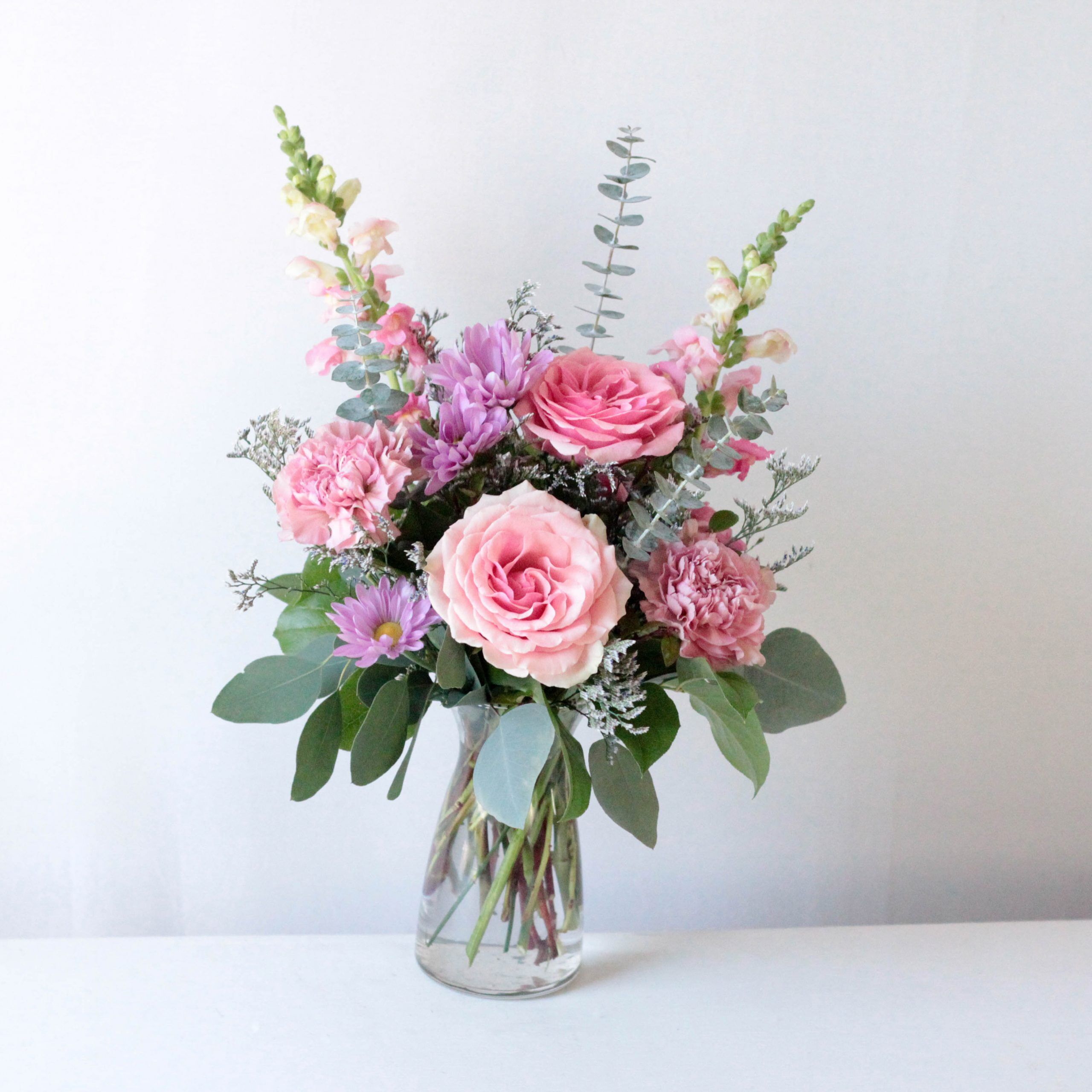 A delightful pink-hued bouquet of roses, carnations, daisies and snapdragons.