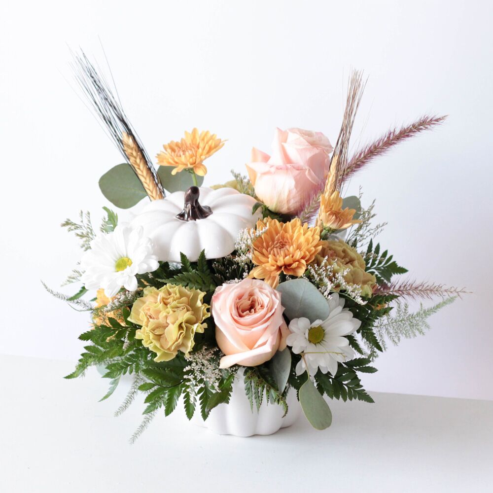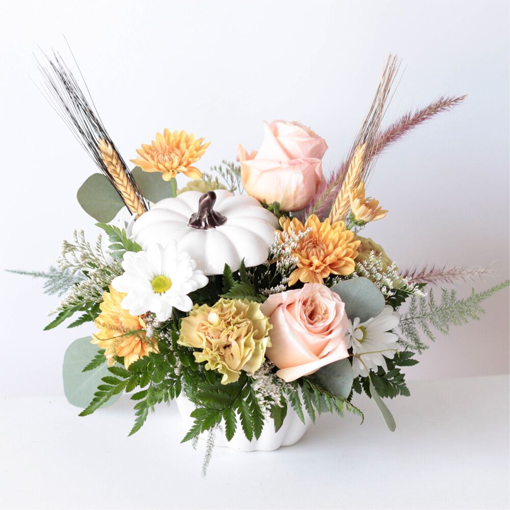 Delivered in a white ceramic pumpkin with matching lid; Arrangement measures approx. 10″ W x 9″ H