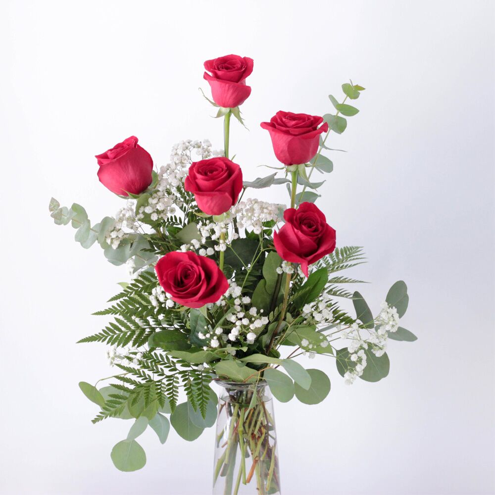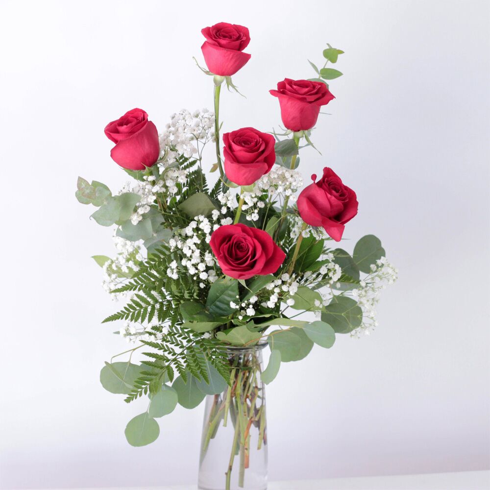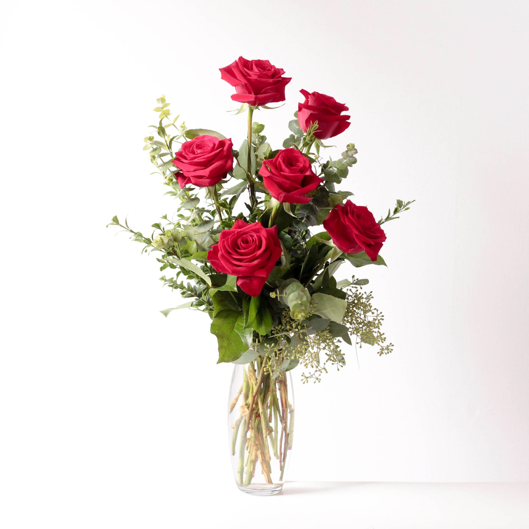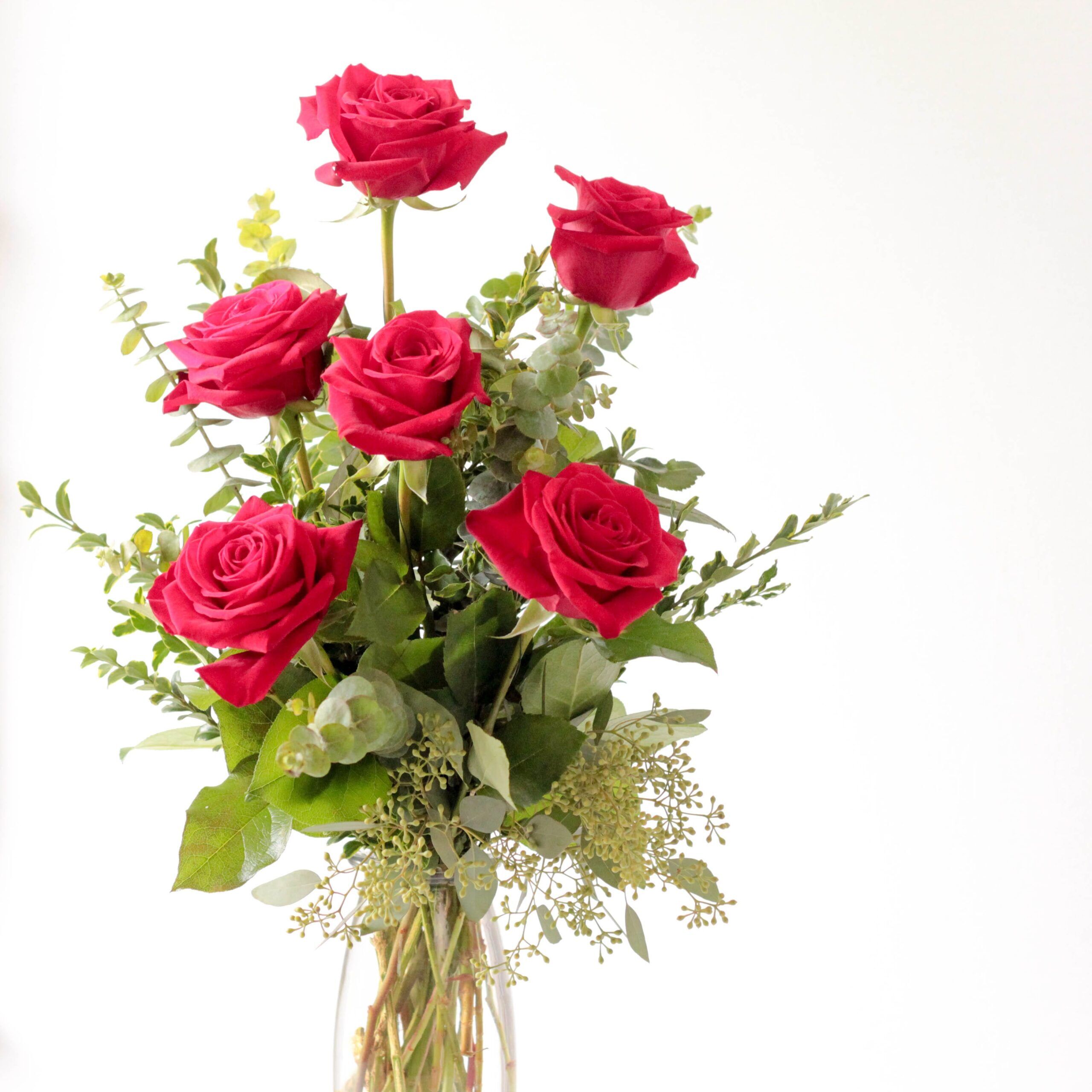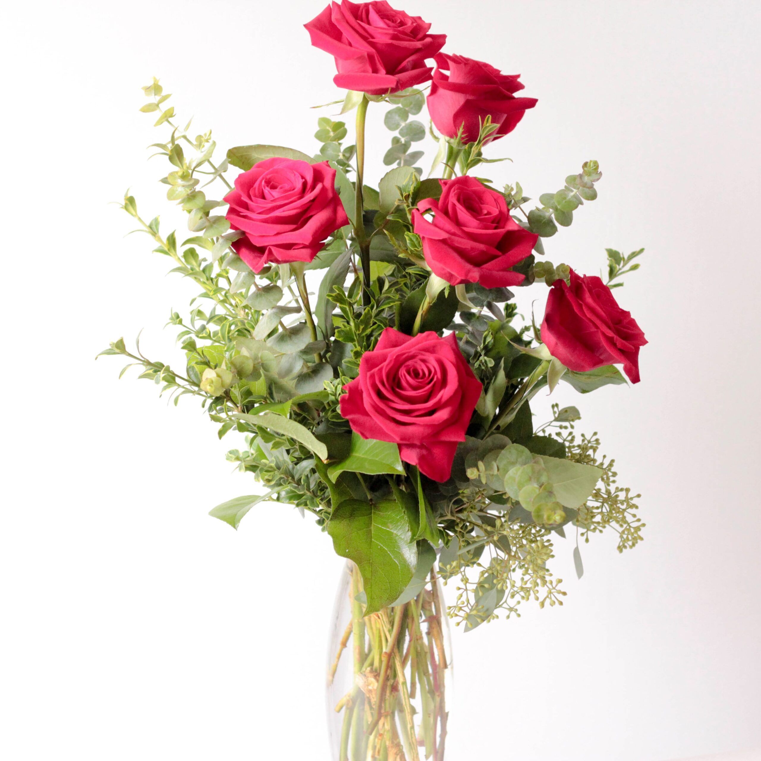 Six beautiful red roses accented by assorted greens and eucalyptus.