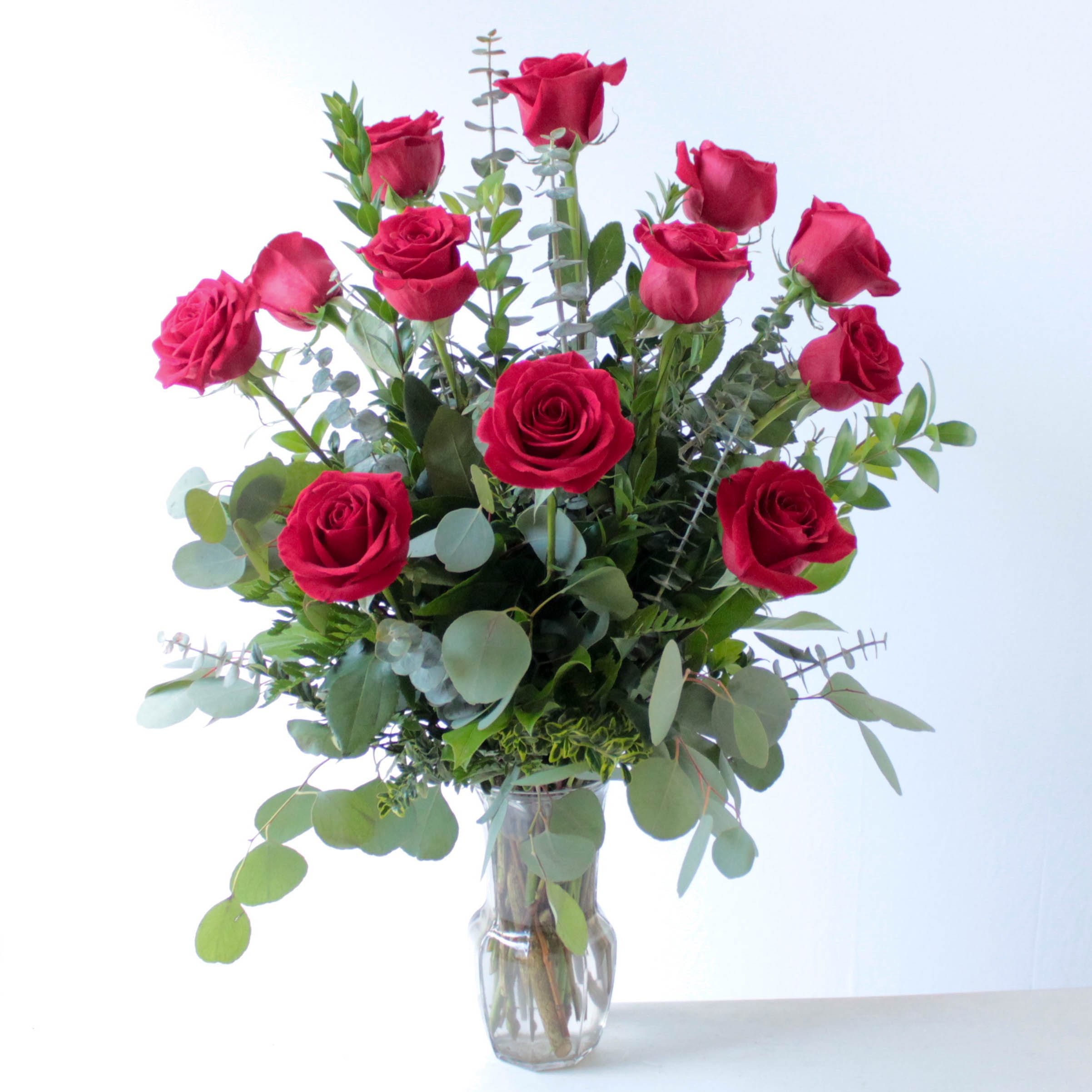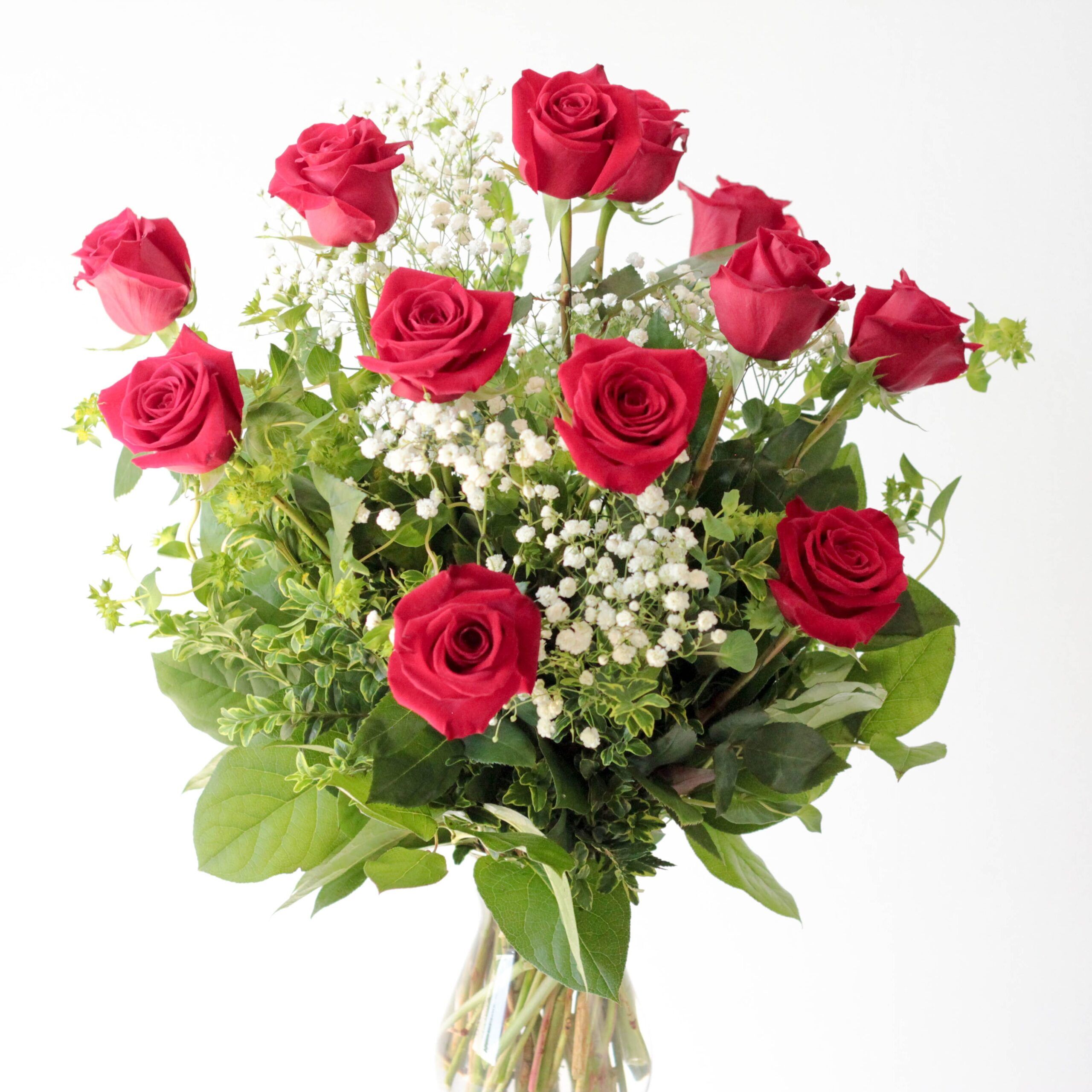 Twelve long-stemmed, large headed red design roses arranged with greens, babies’ breath and buplereum in a clear glass vase.