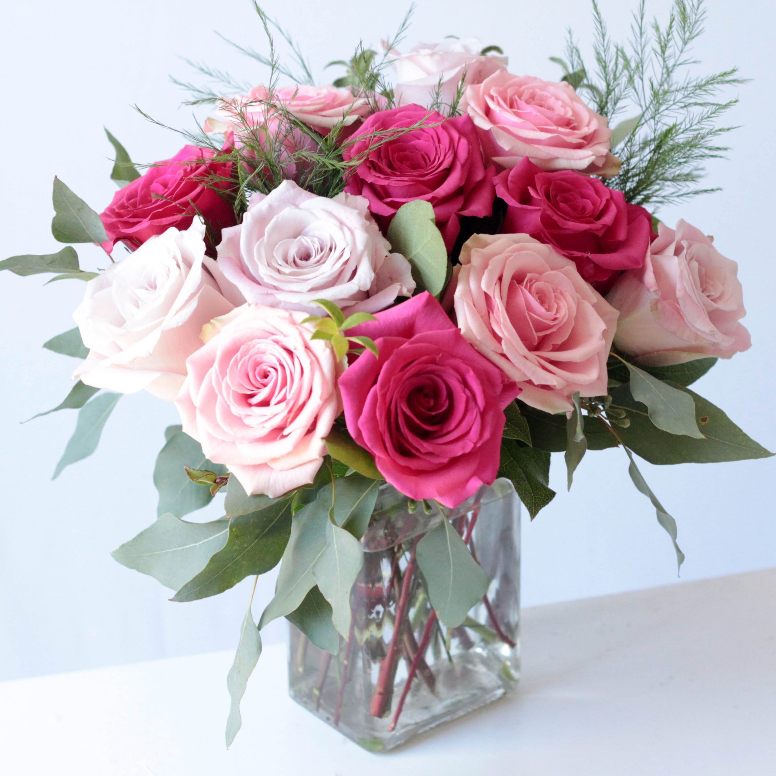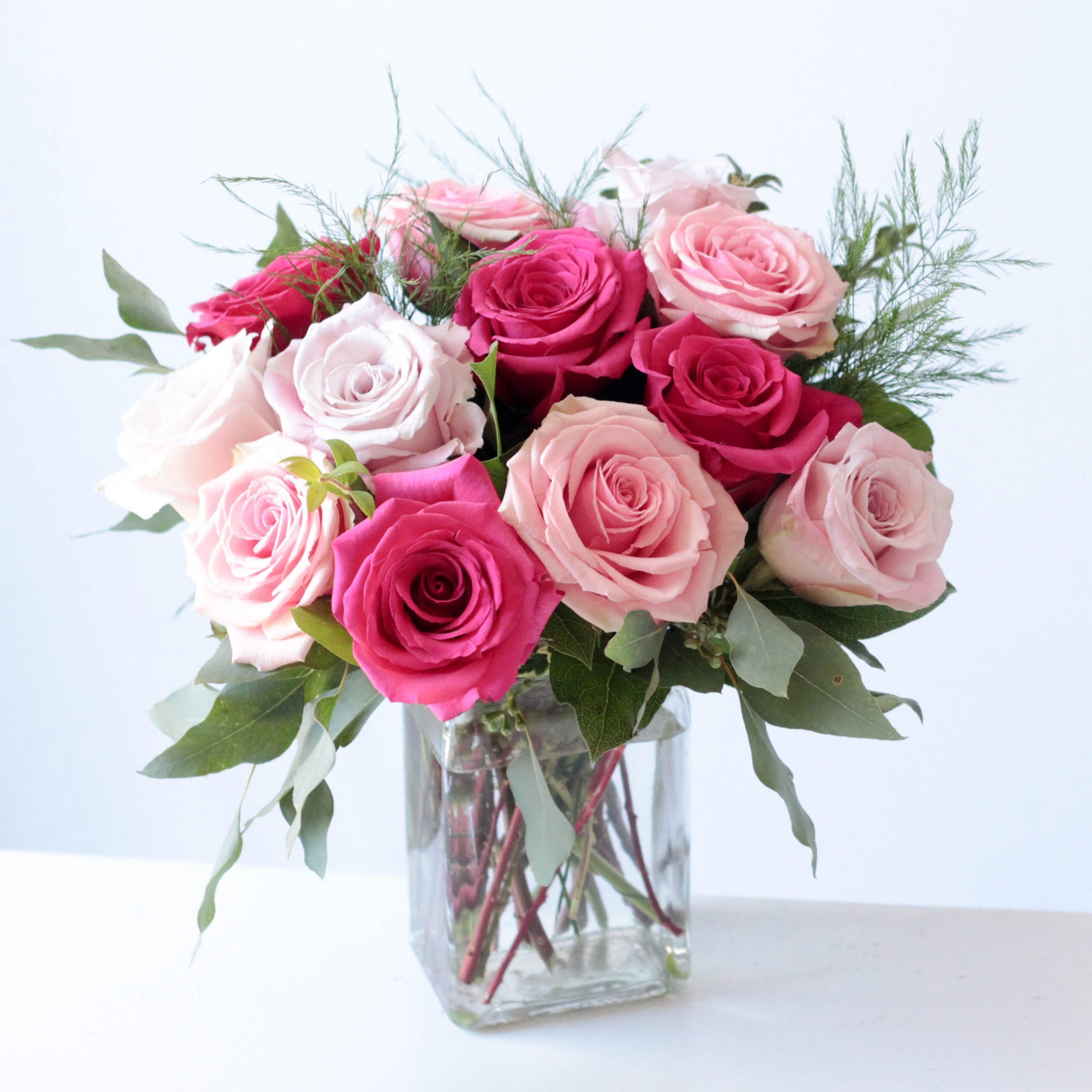 Twelve roses in red OR shades of pink are artfully arranged in an understated clear glass vase.