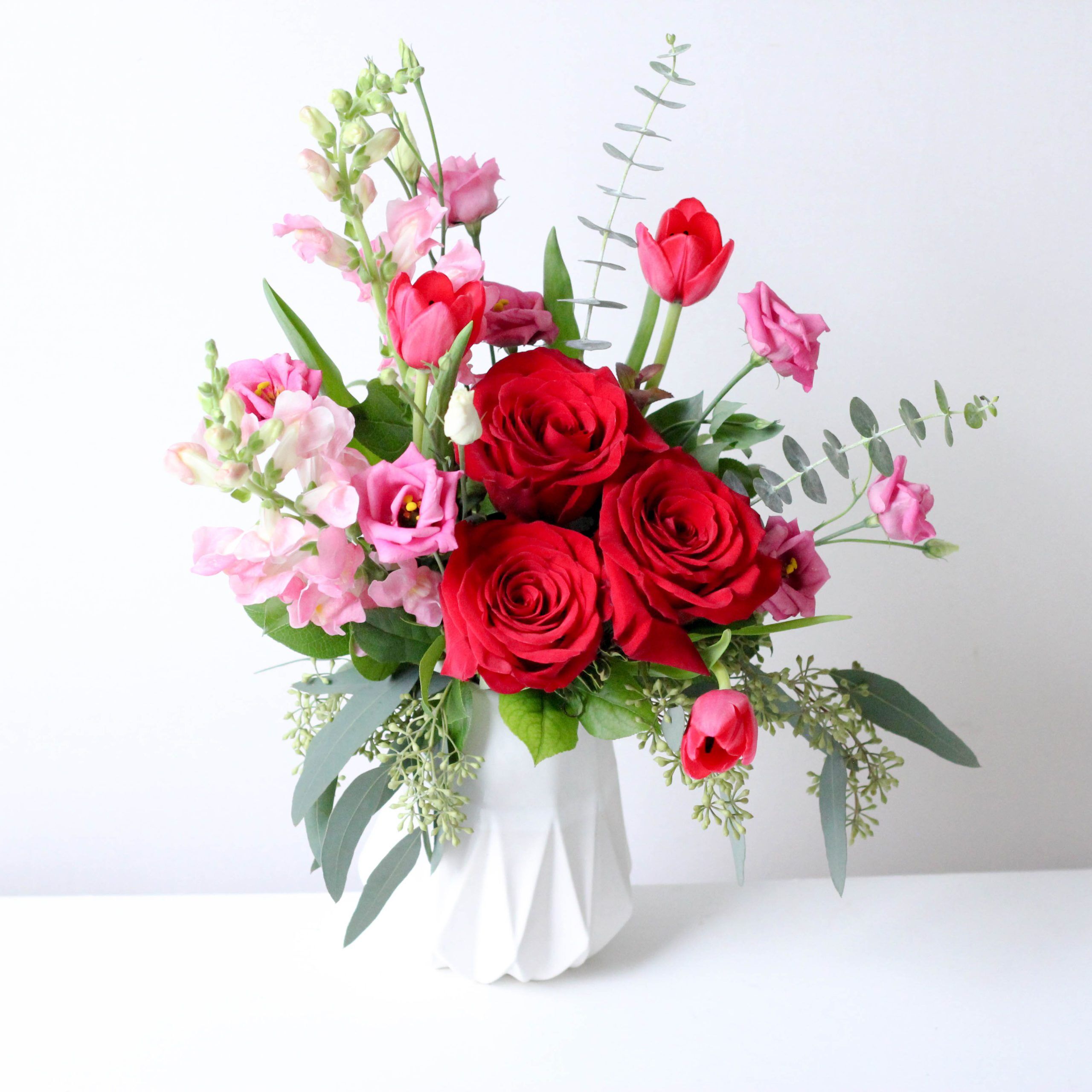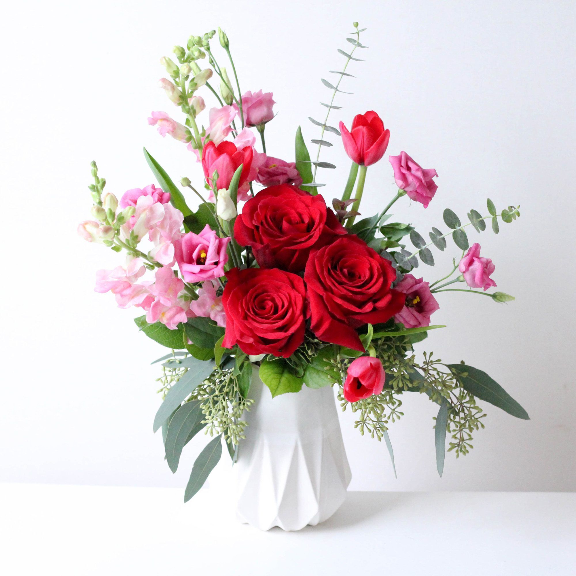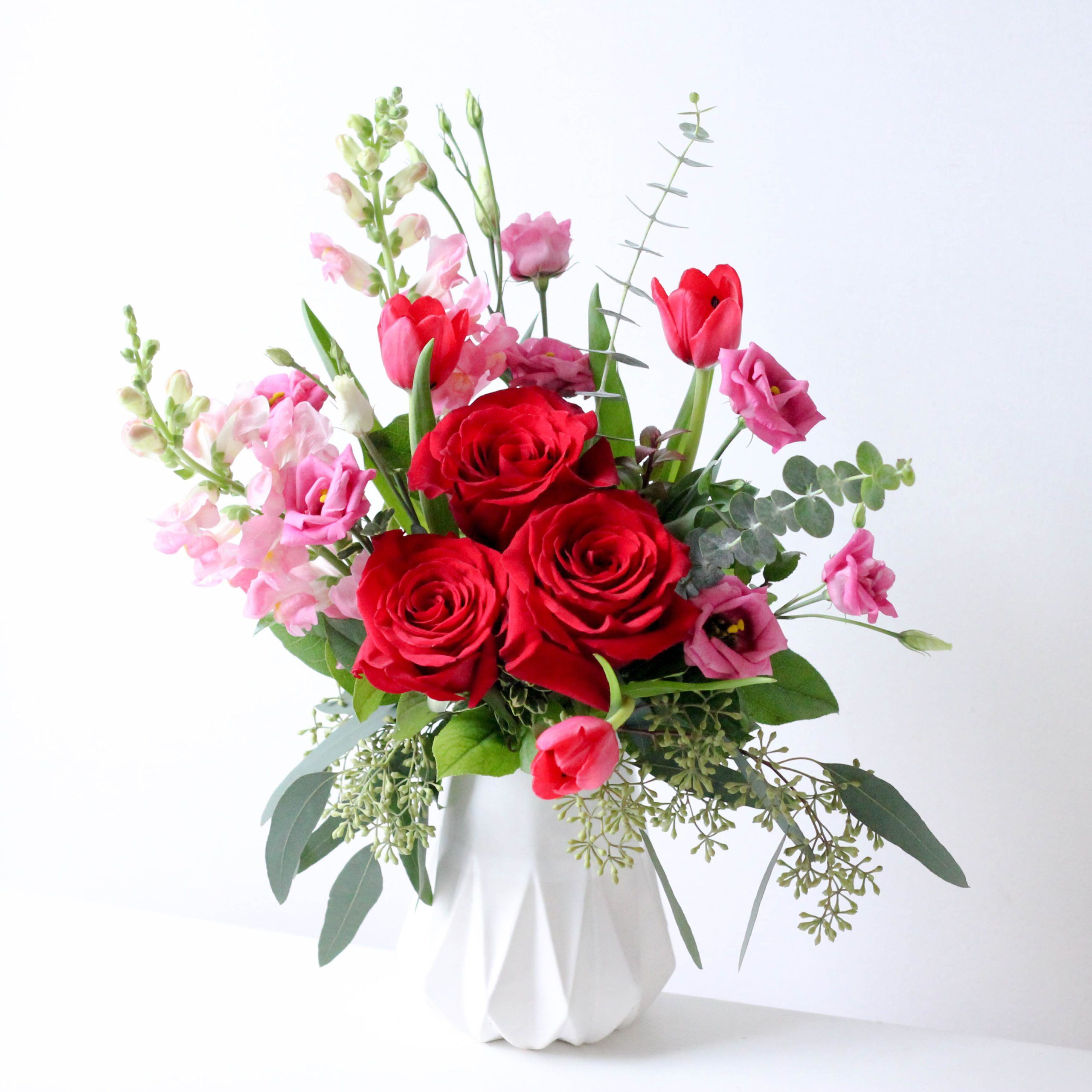 Three red roses are highlighted by tulips, snapdragons and lisianthus in a one-of-a-kind white, ceramic Teco vase.
