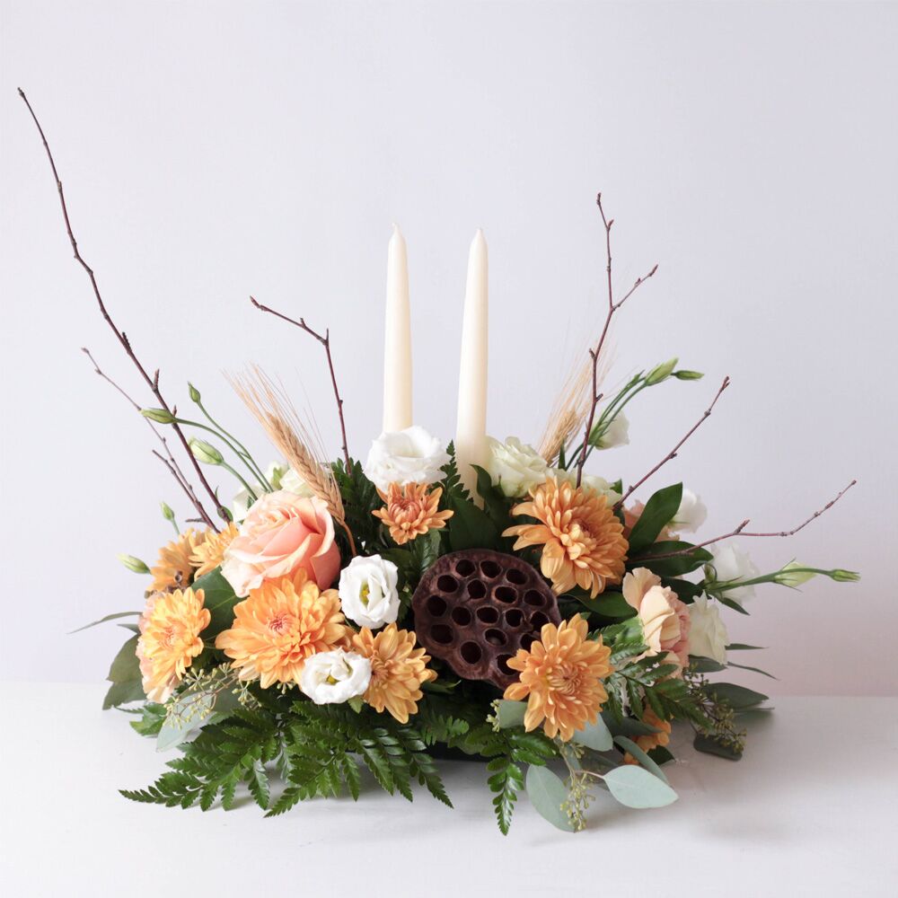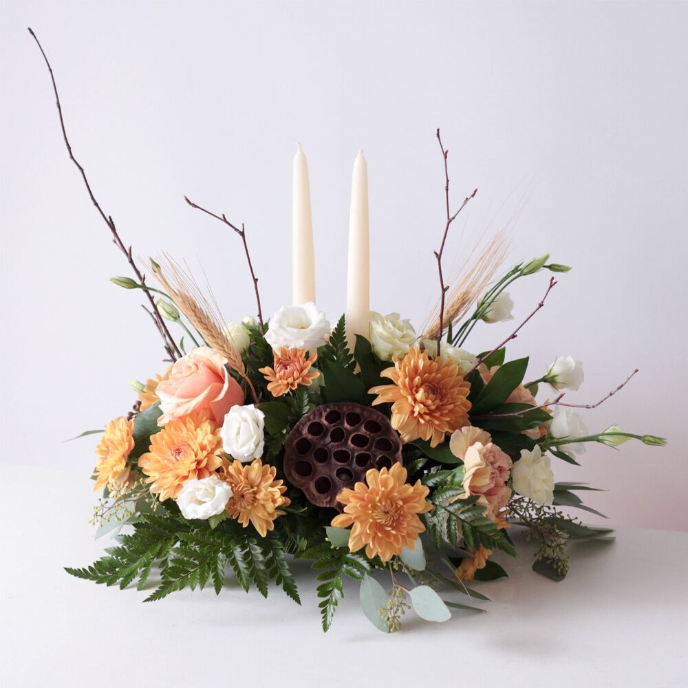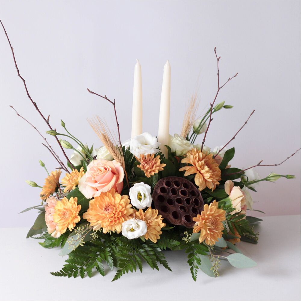 This centerpiece measures approx. 15″ W x 9″ H and is delivered with two off-white taper candles