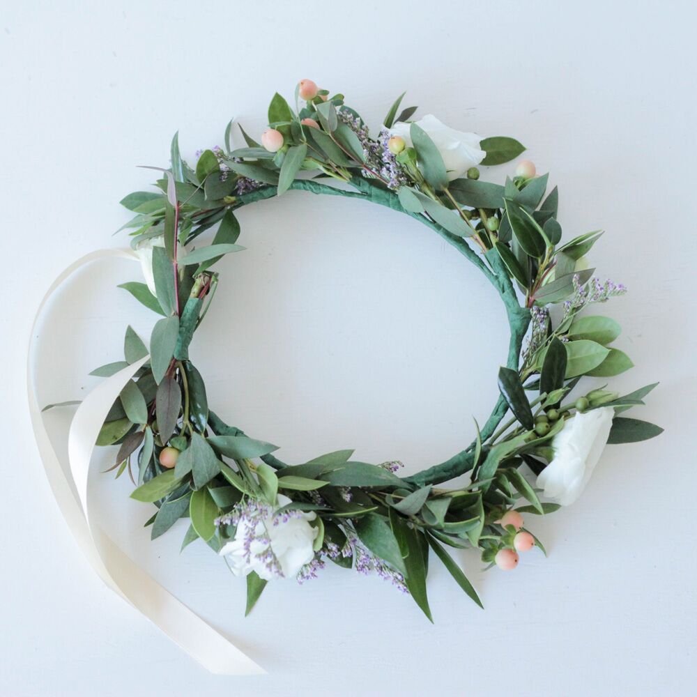 A sweet floral crown designed with mixed flowers or babies breath and greenery, ribbon included.