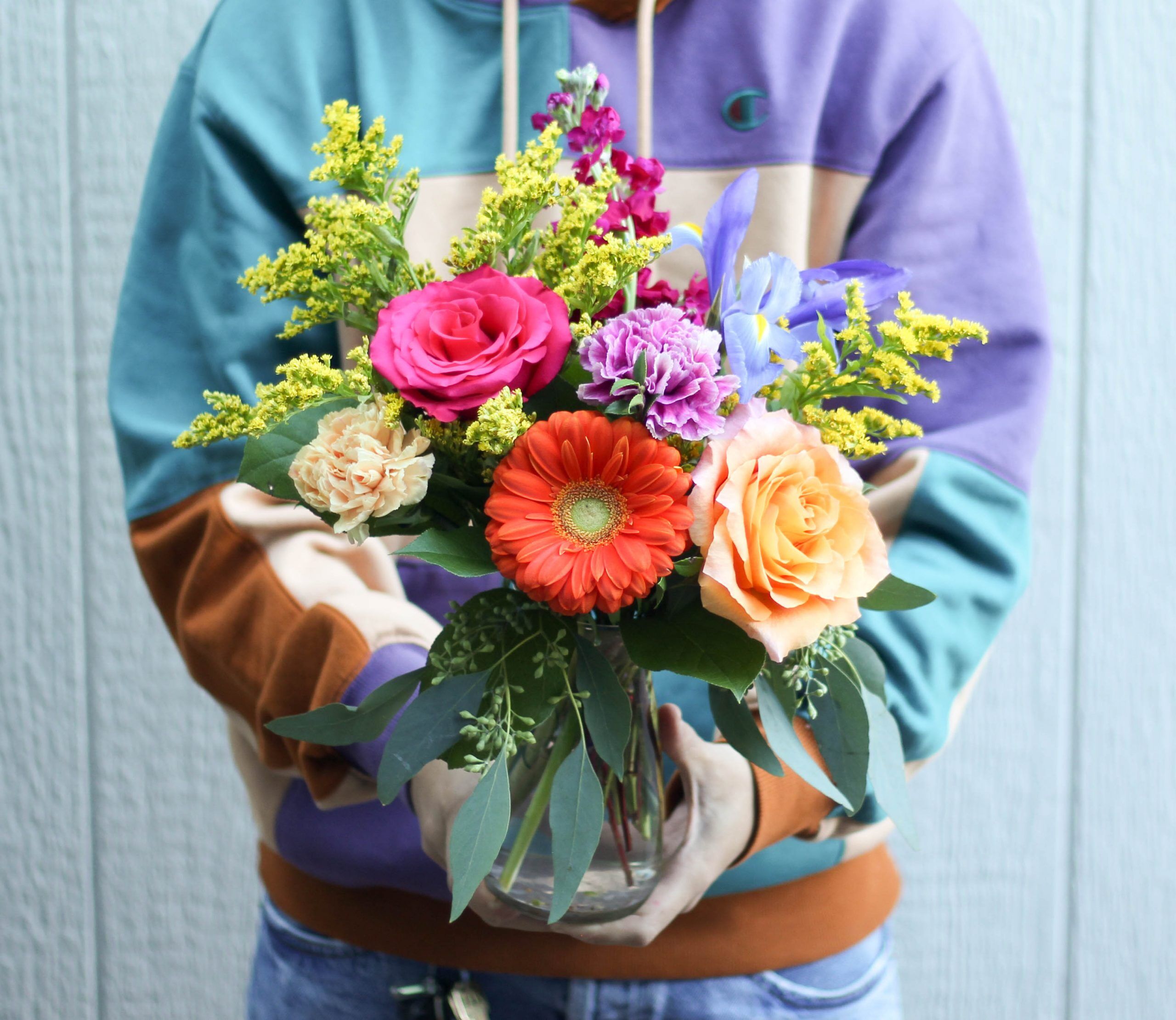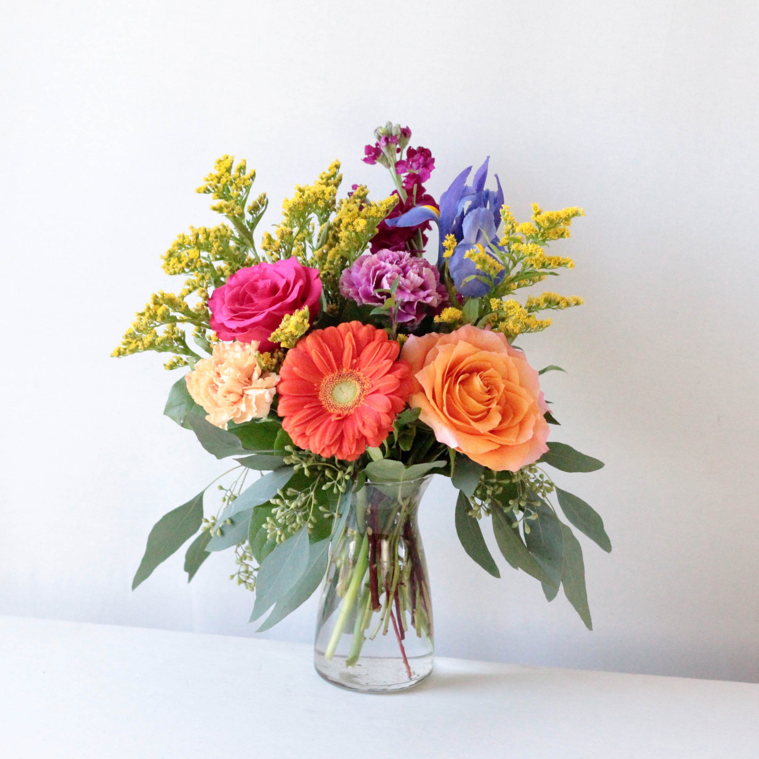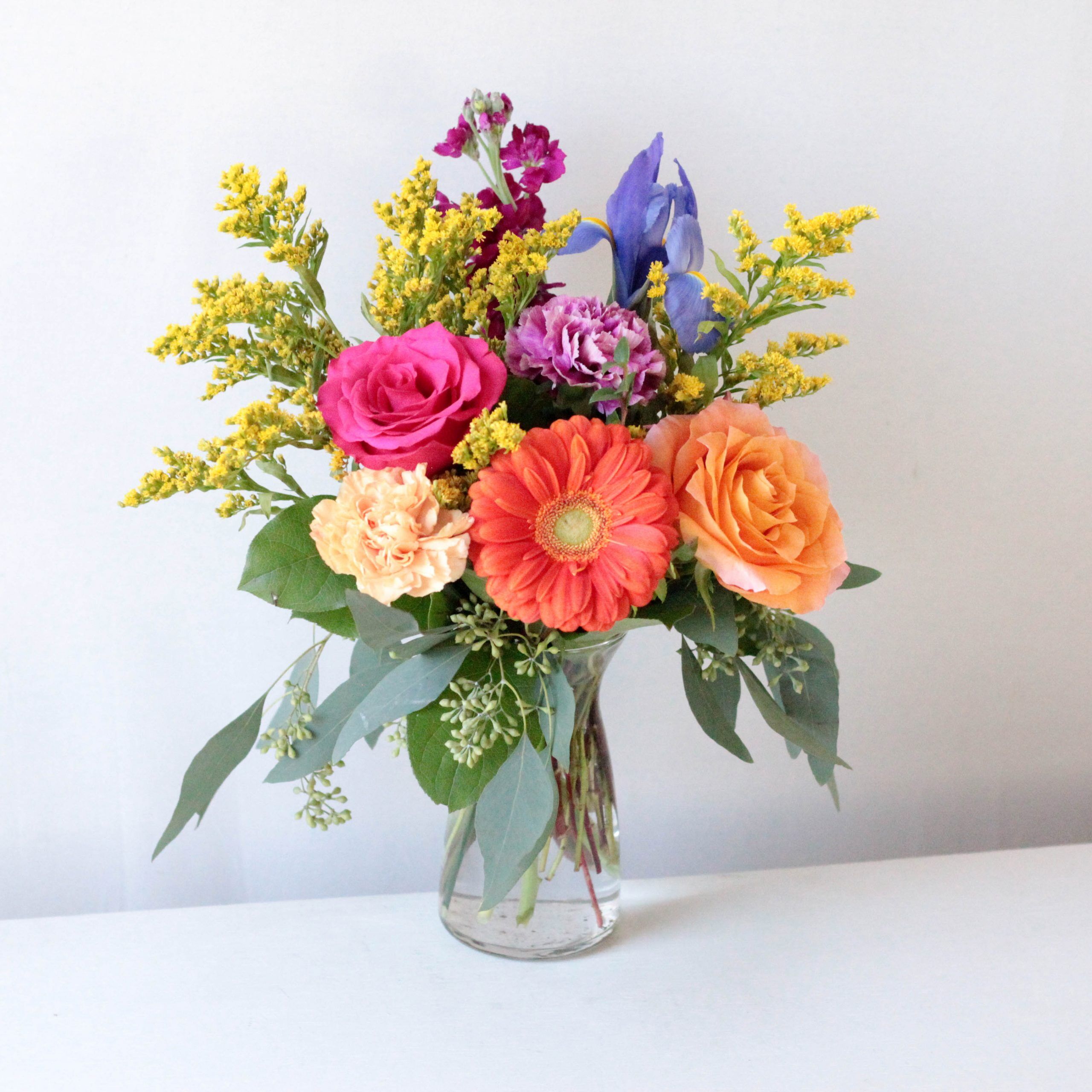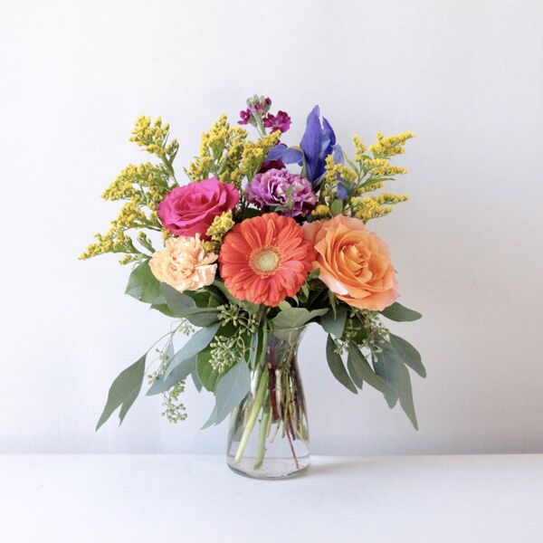 A fun combination of fresh spring cuts and bright color pops dance in a clear glass jar.