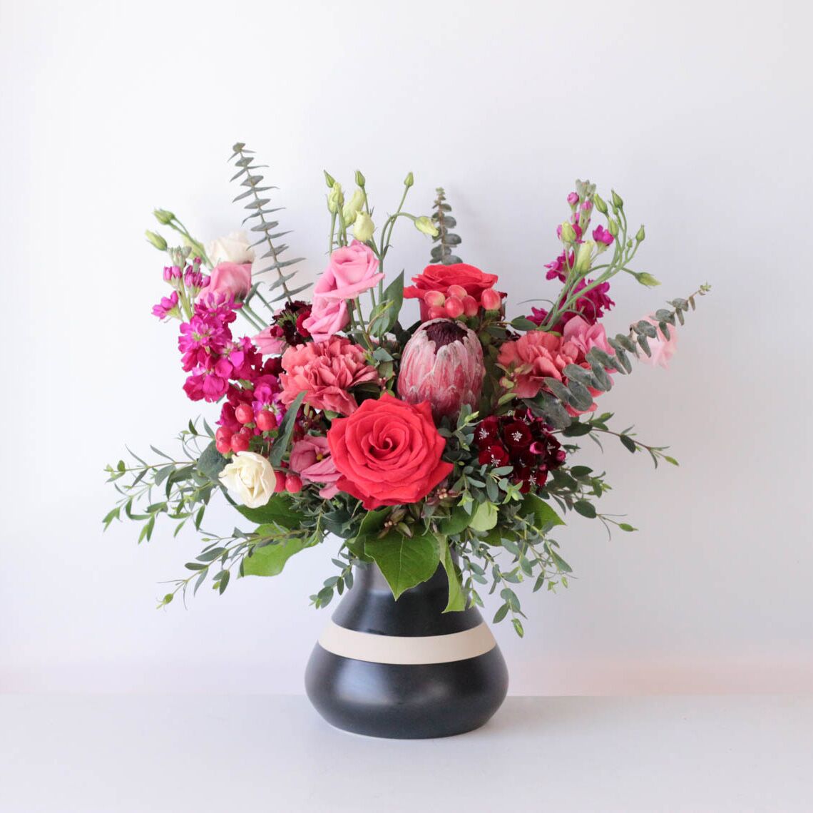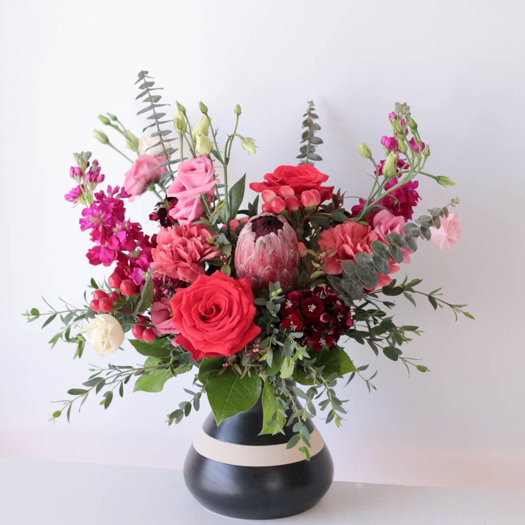 You’ll give yourself a pink mustache when you take a big drink of this gorgeous arrangement! Fruit Punch features a very berry combo of flowers featuring a pink ice protea, dark orange roses, fuchsia stock, dianthus, and more.