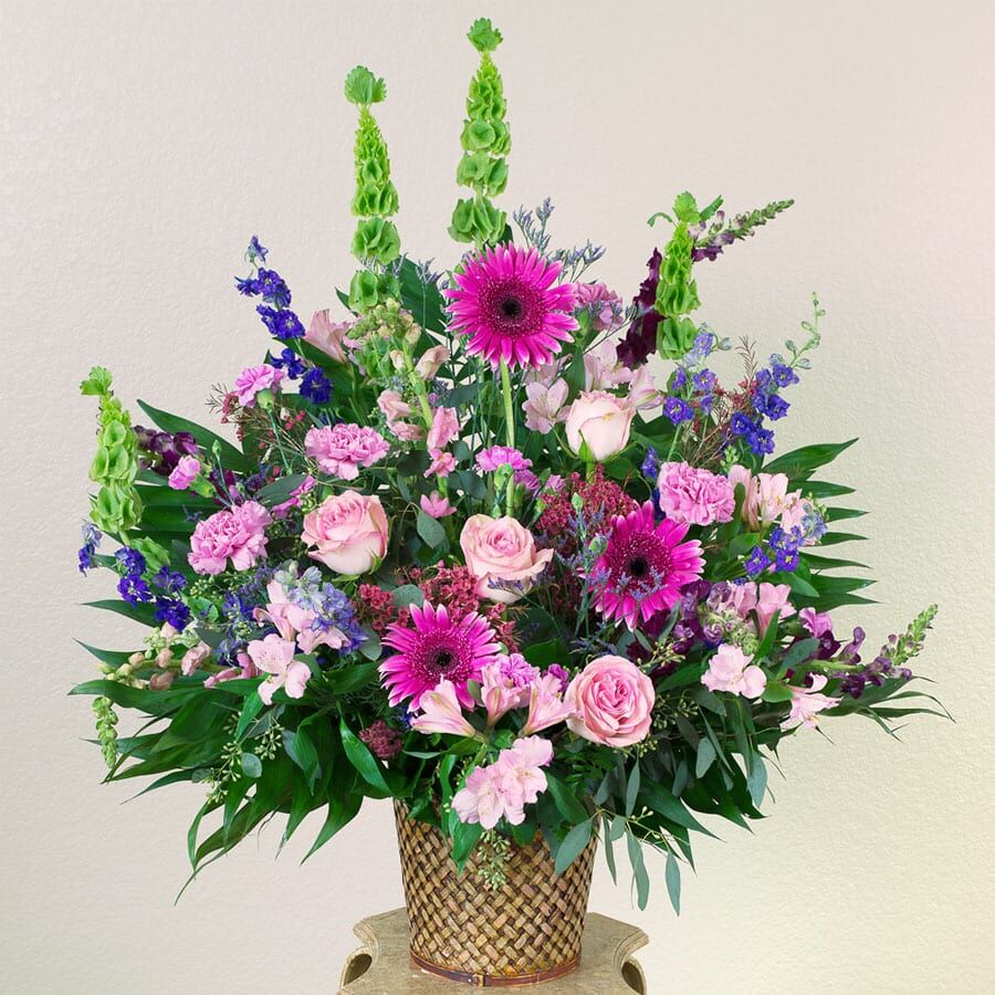 A lovely basket of spring blooms in varying shades of pink, peach, lavender and mauve delivered in a wicker basket. Arrangement measures approx. 30″ W x 30″ H