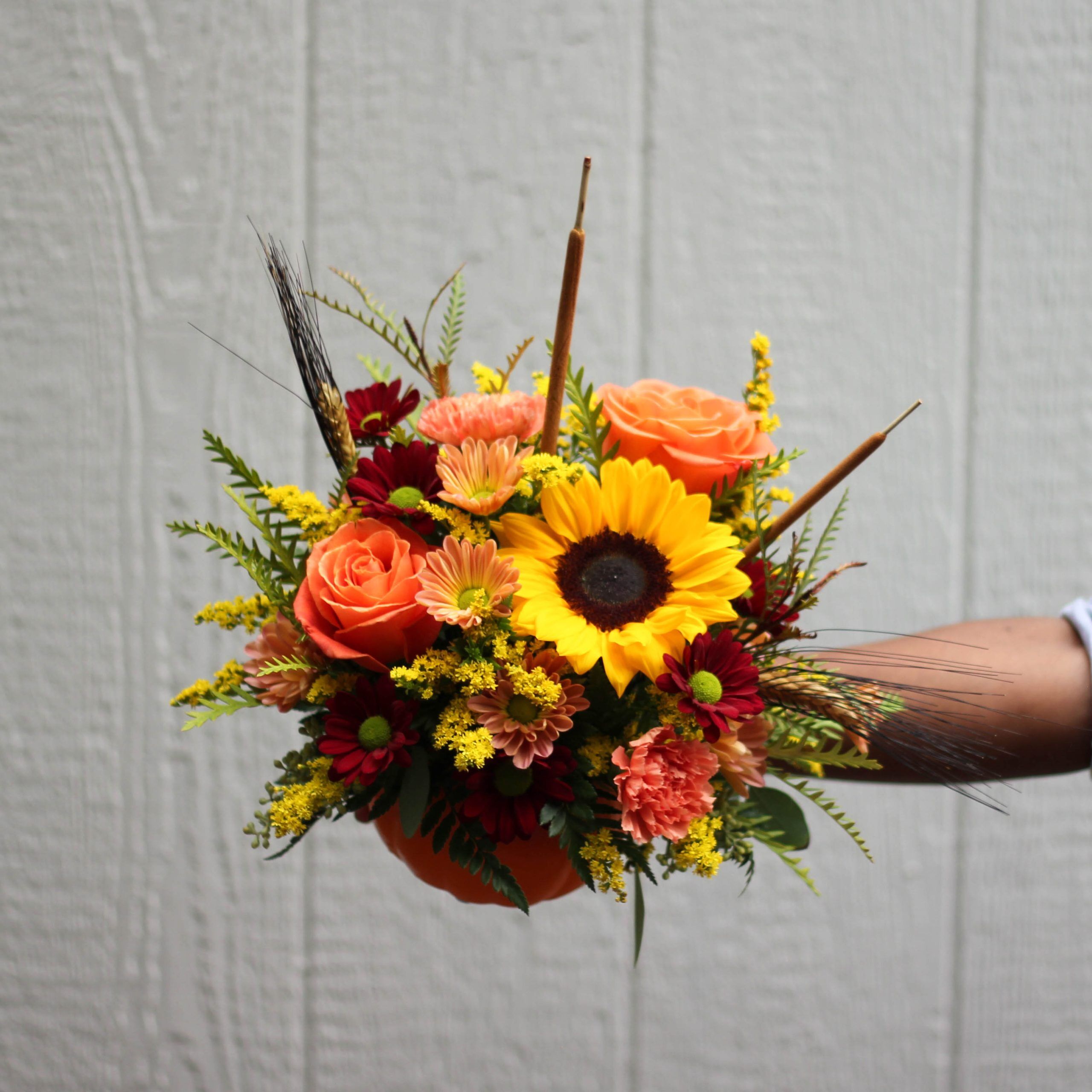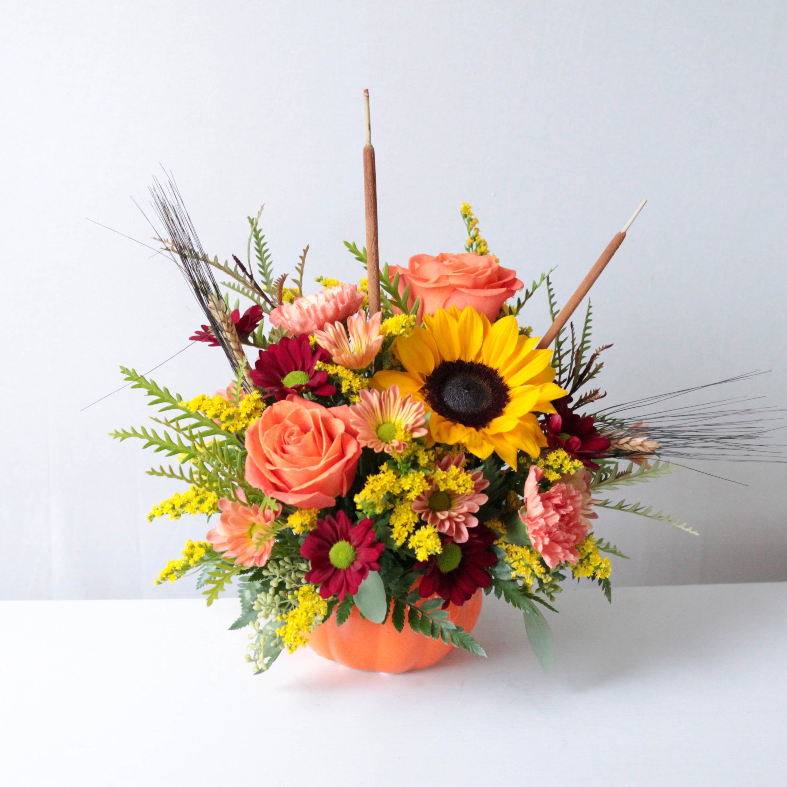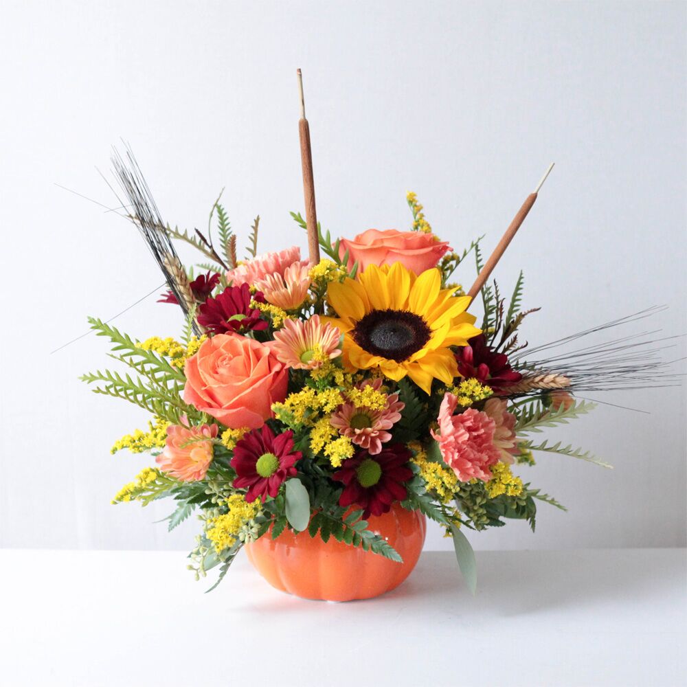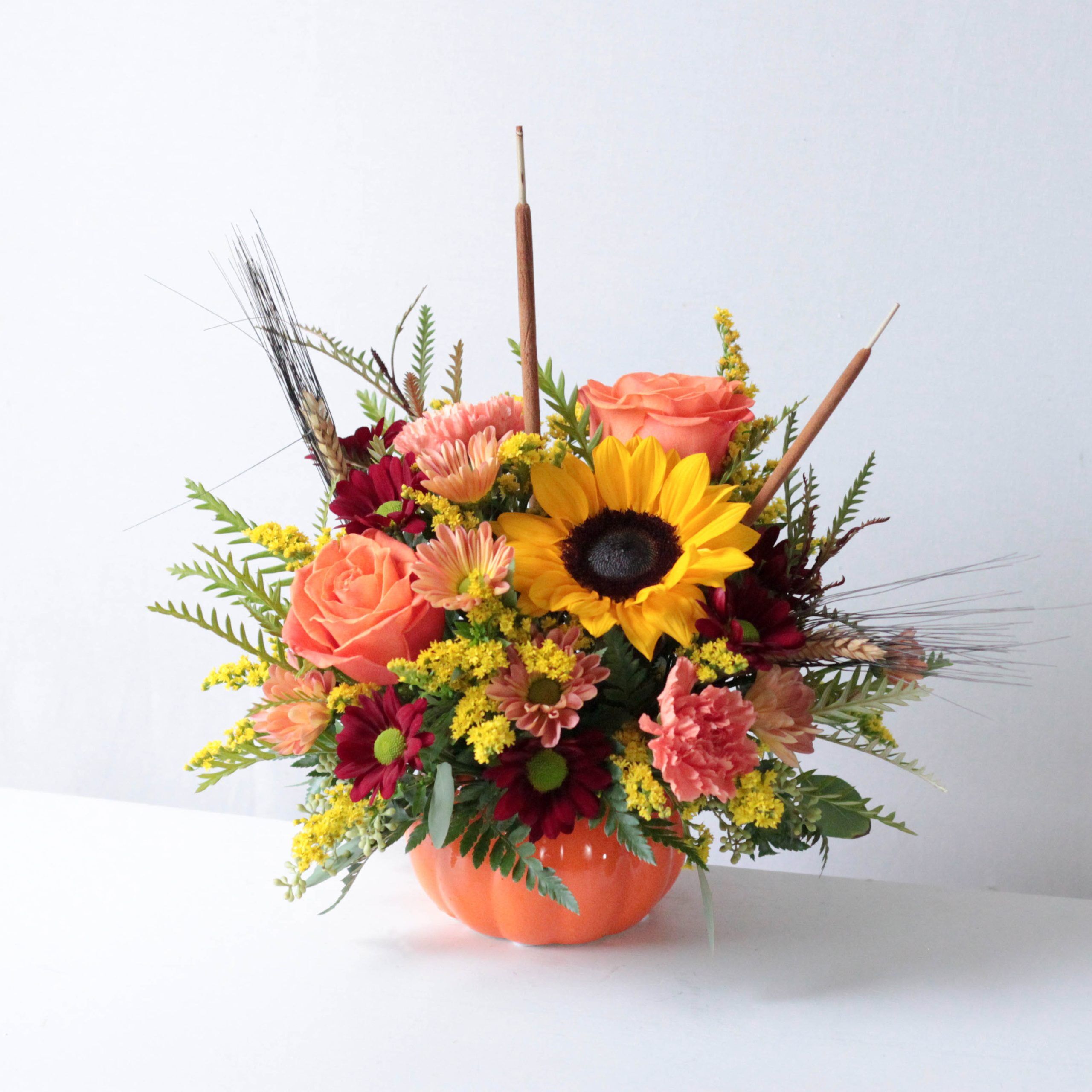 Arranged in a ceramic pumpkin; Arrangement measures approx. 13″ W x 11″ H