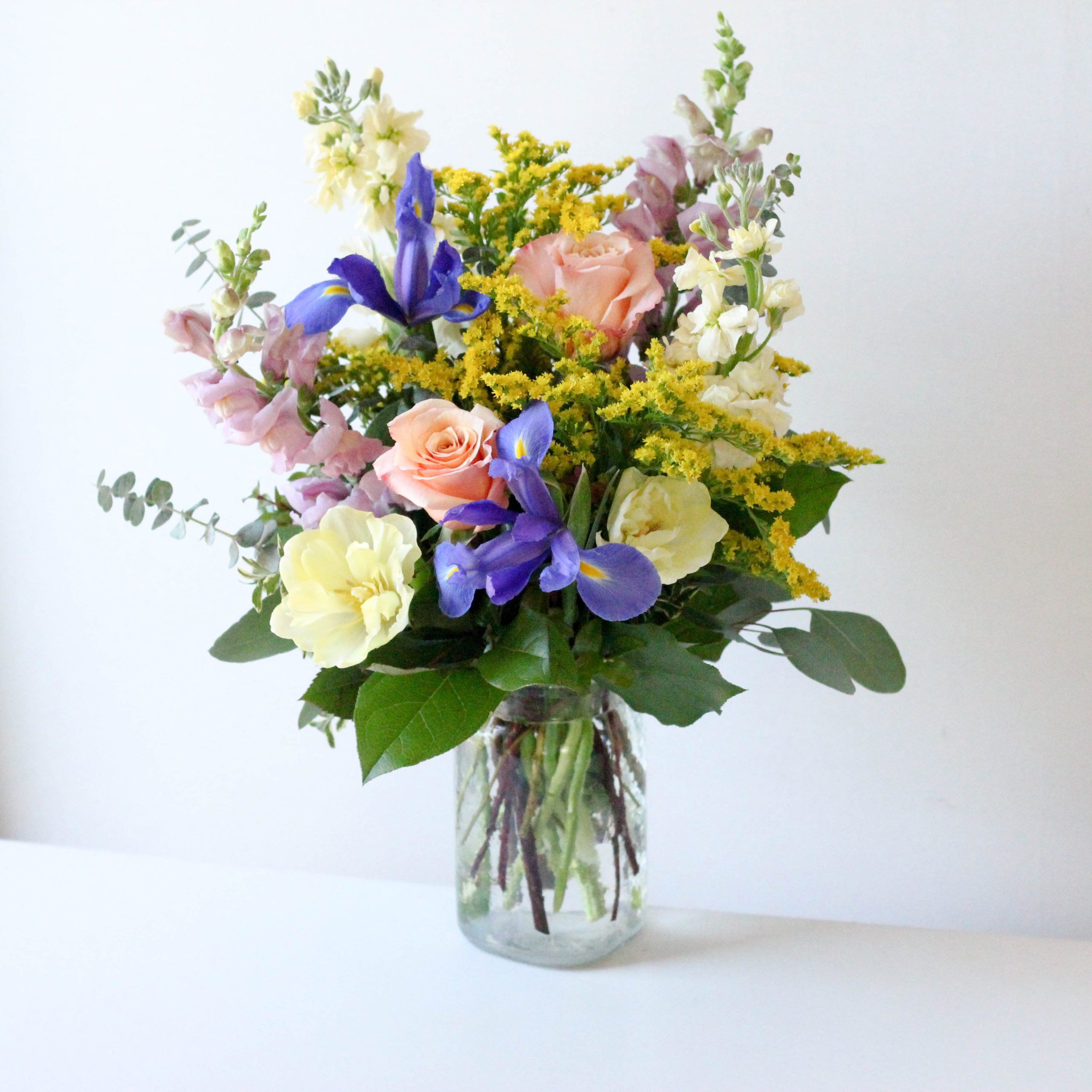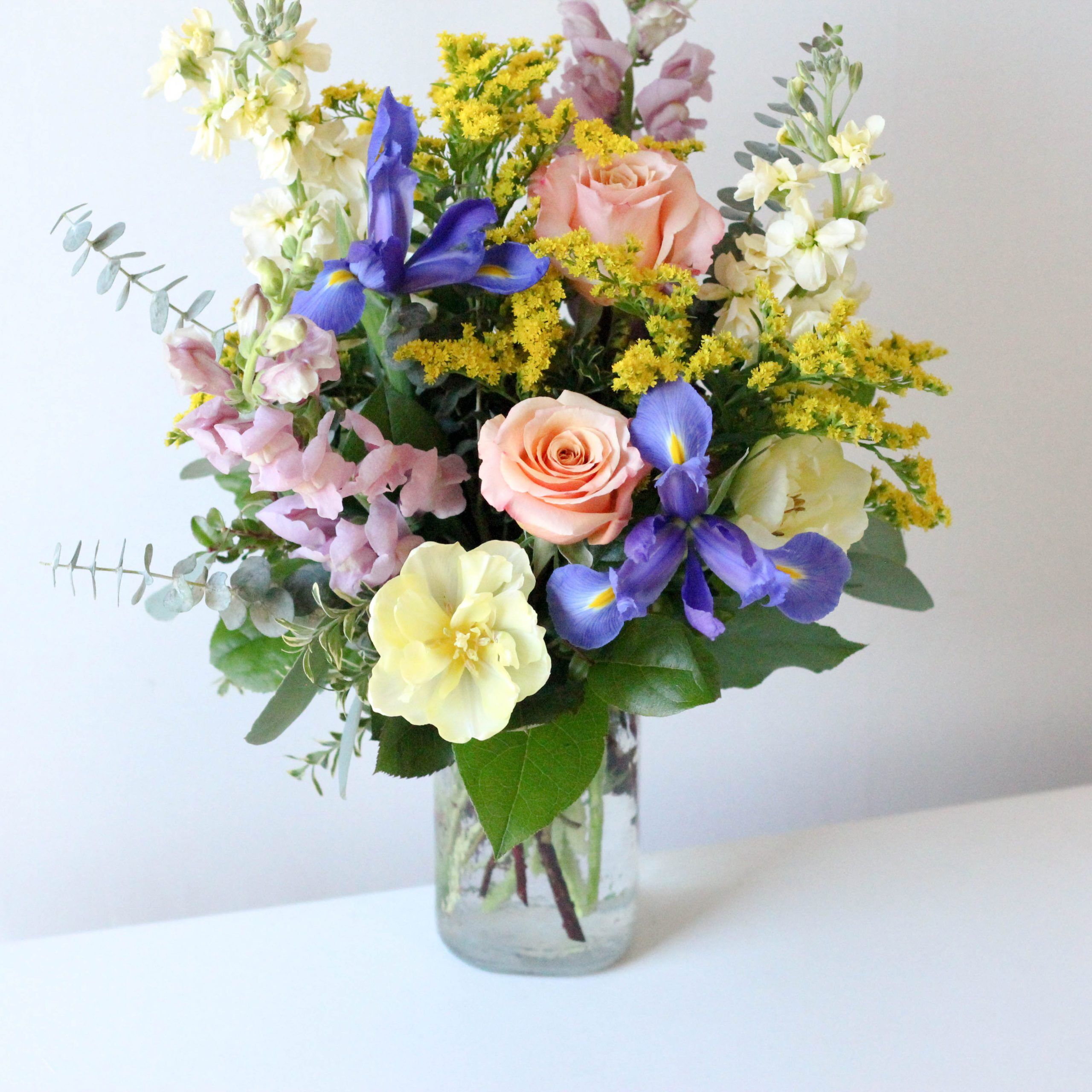 Roses, tulips and iris dance among snapdragons and happy seasonal fillers.
