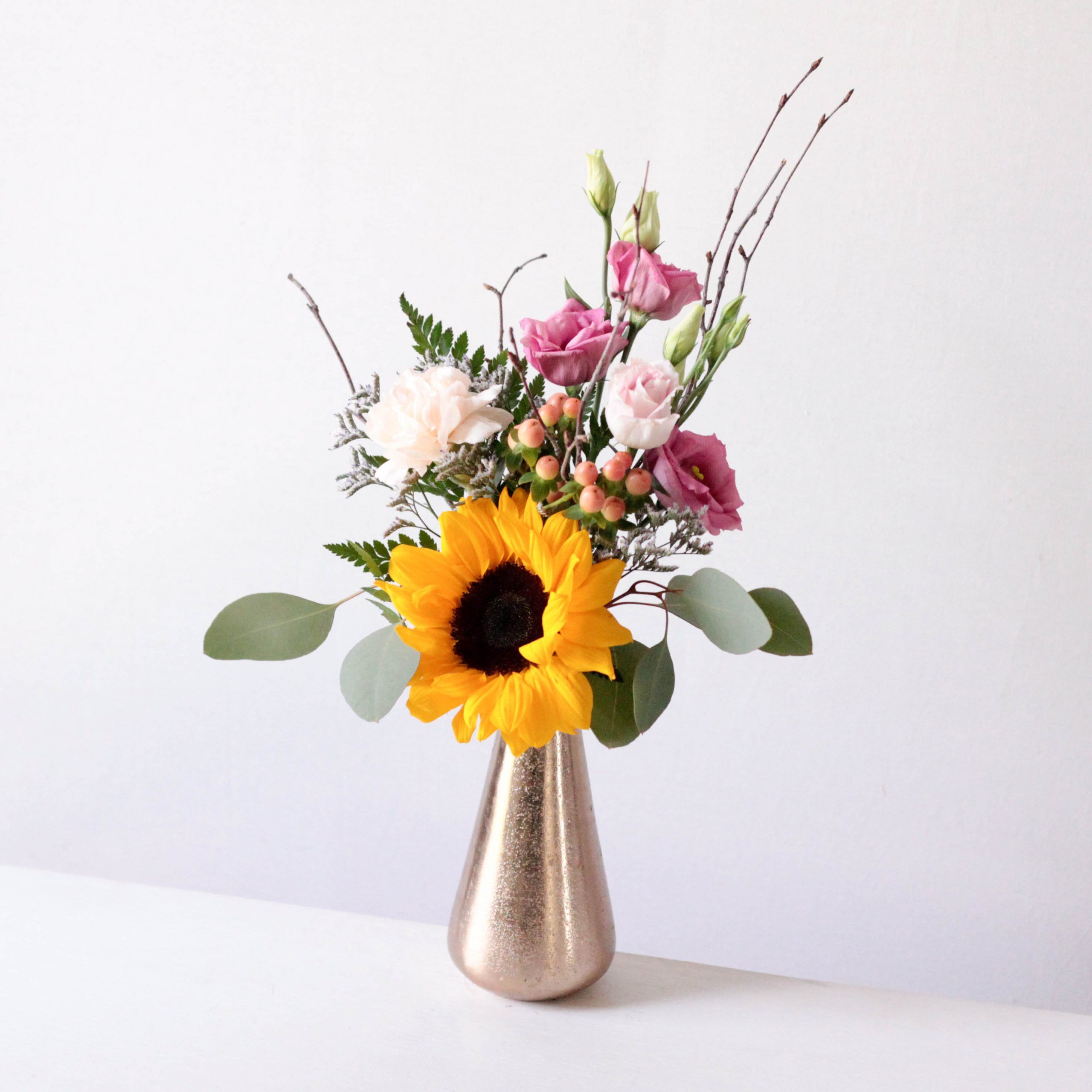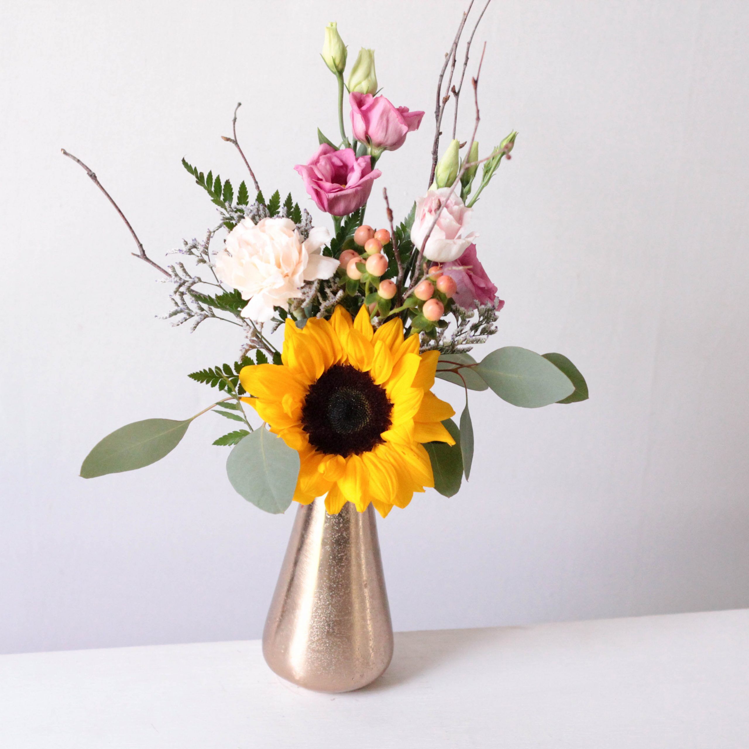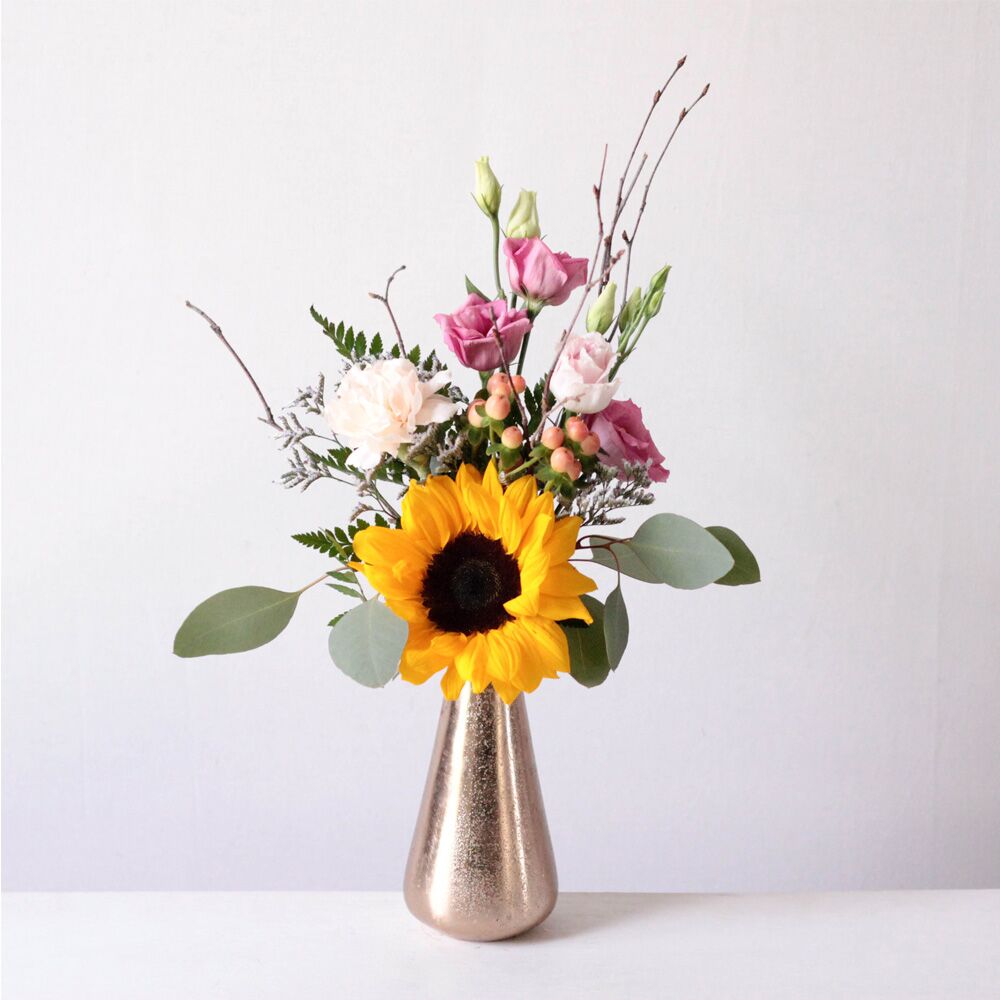 A sunflower, carnations, lisianthus, and hypericum with Birch Branch accents, dance together in a unique Lyric vase.