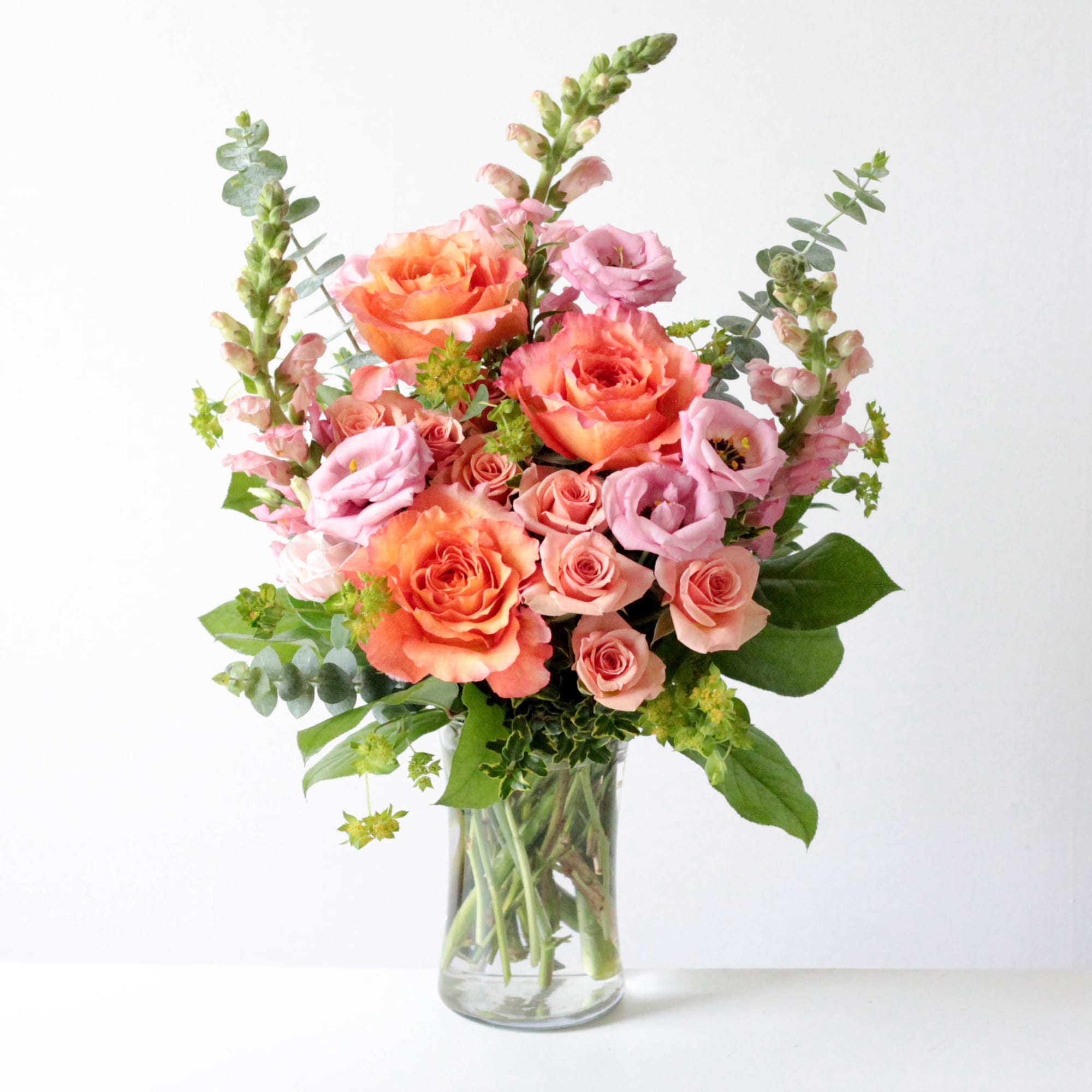 A juicy display of sensational Free Spirit roses adorned by sweetheart roses, lisianthus and snapdragons.