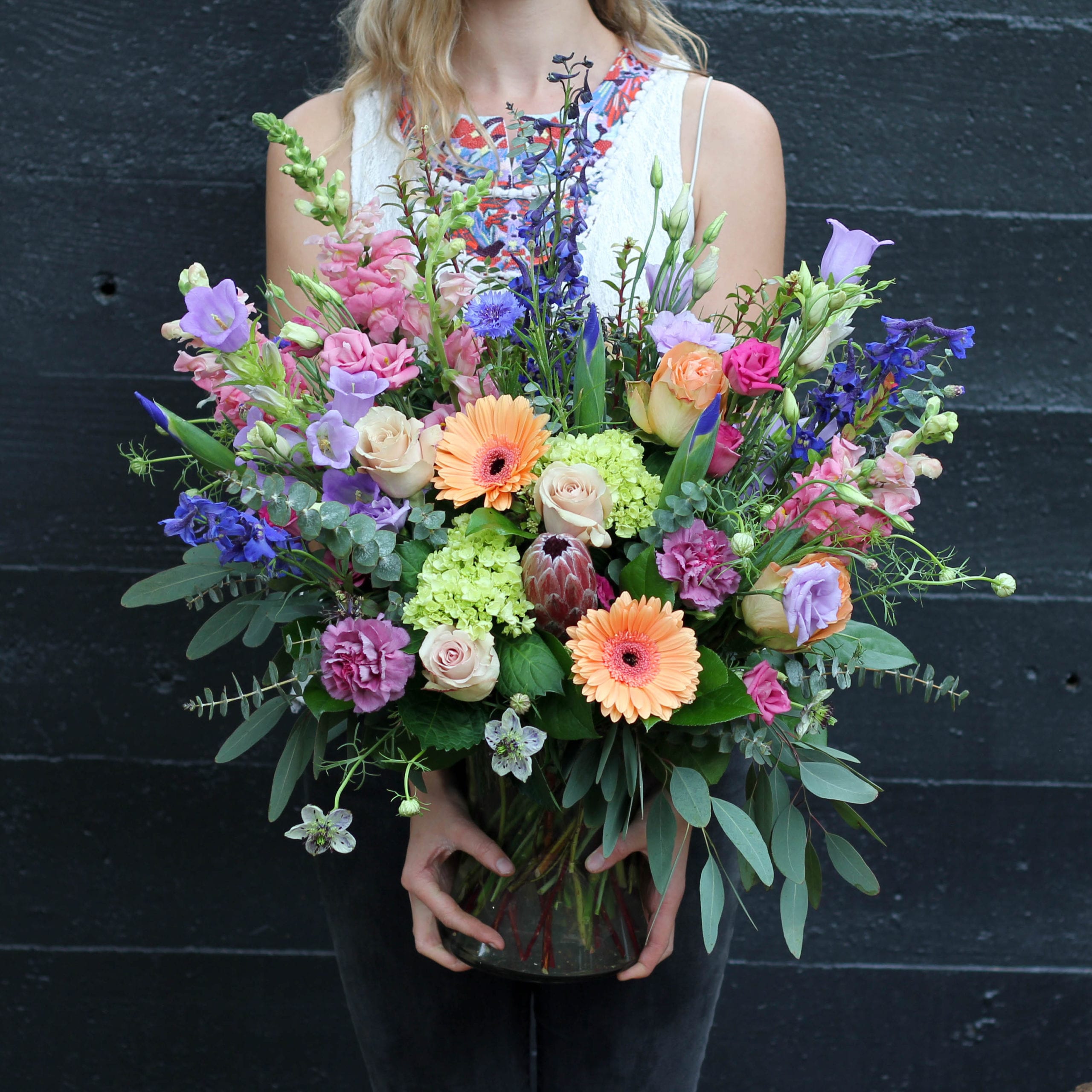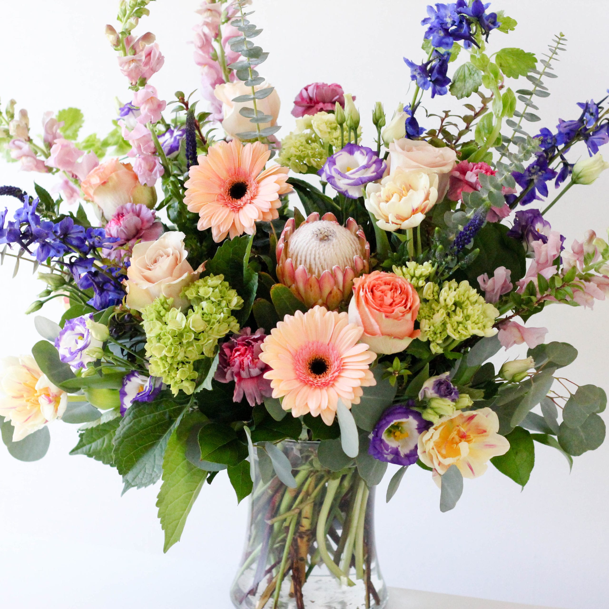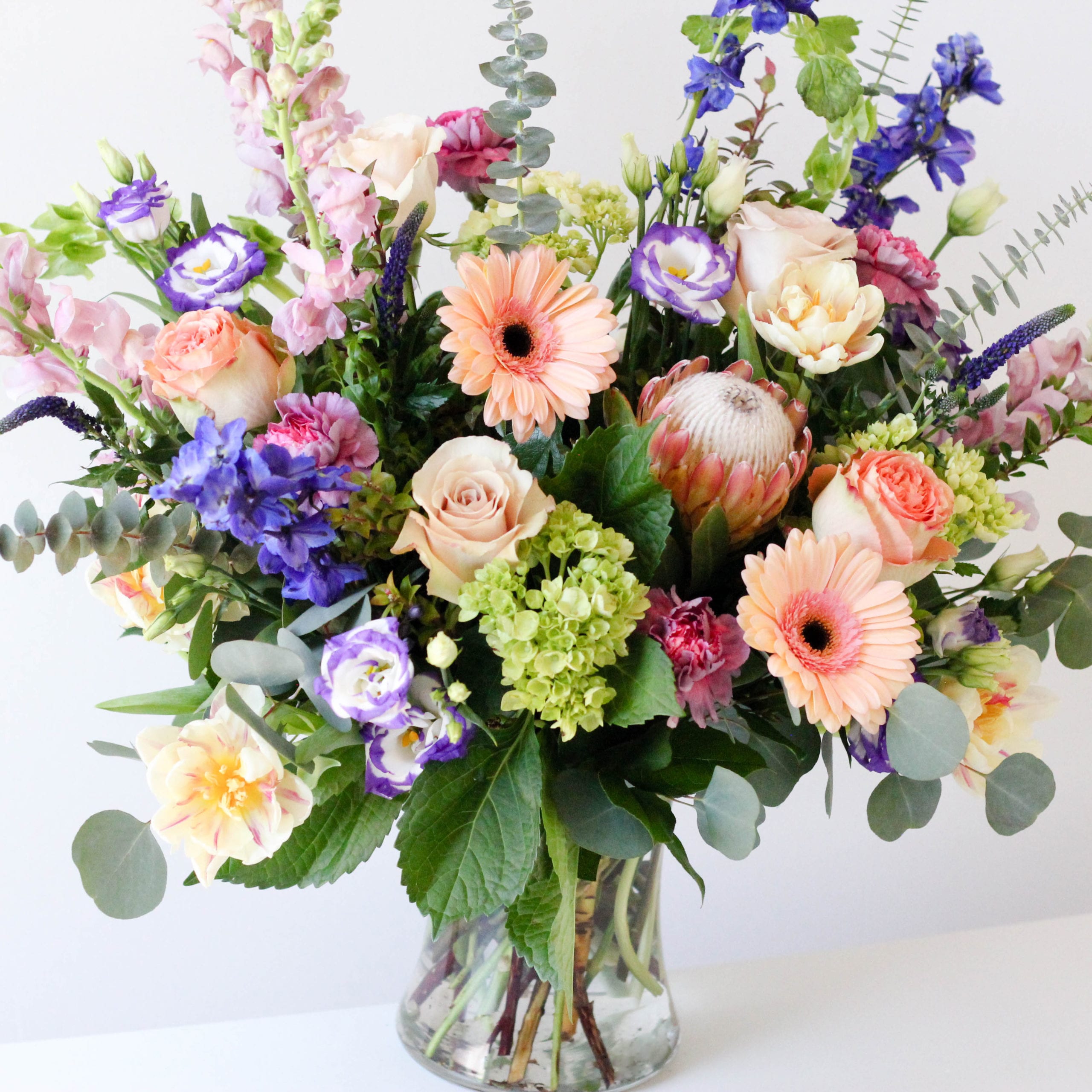 An array of fresh cut roses, hydrangea, delphinium, carnations, snap dragons, tulips, Bells of Ireland and lisianthus in a bed of eucalyptus and greens.