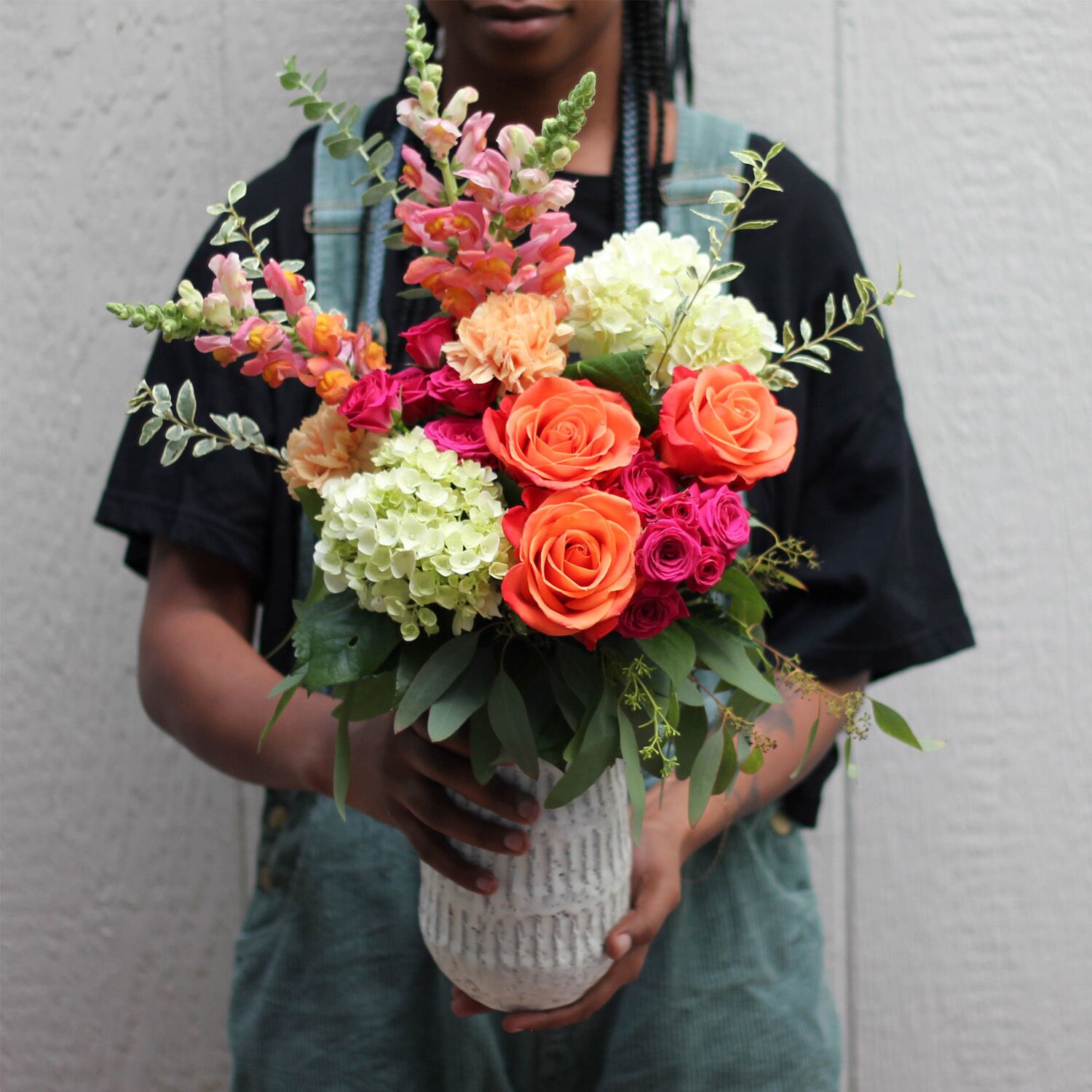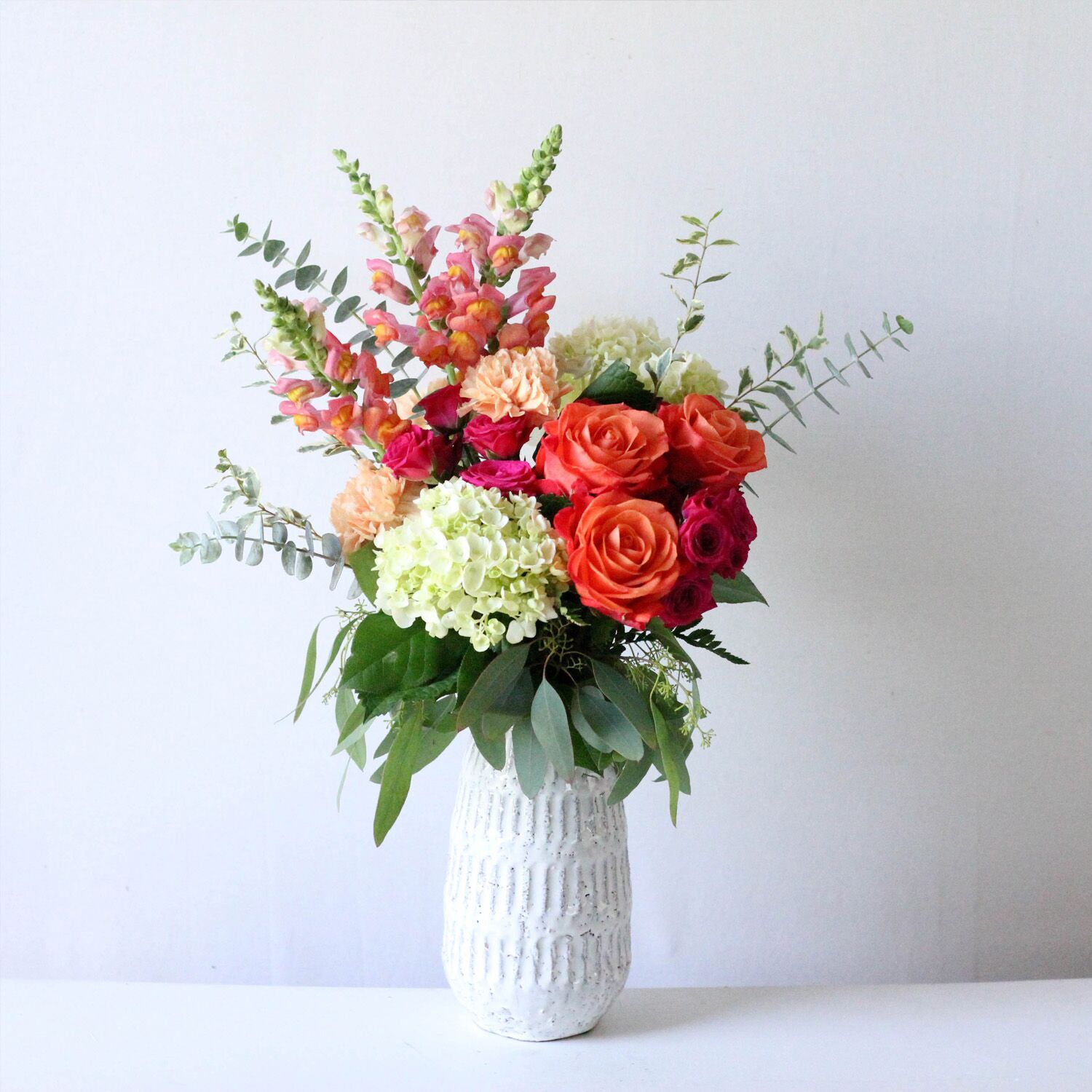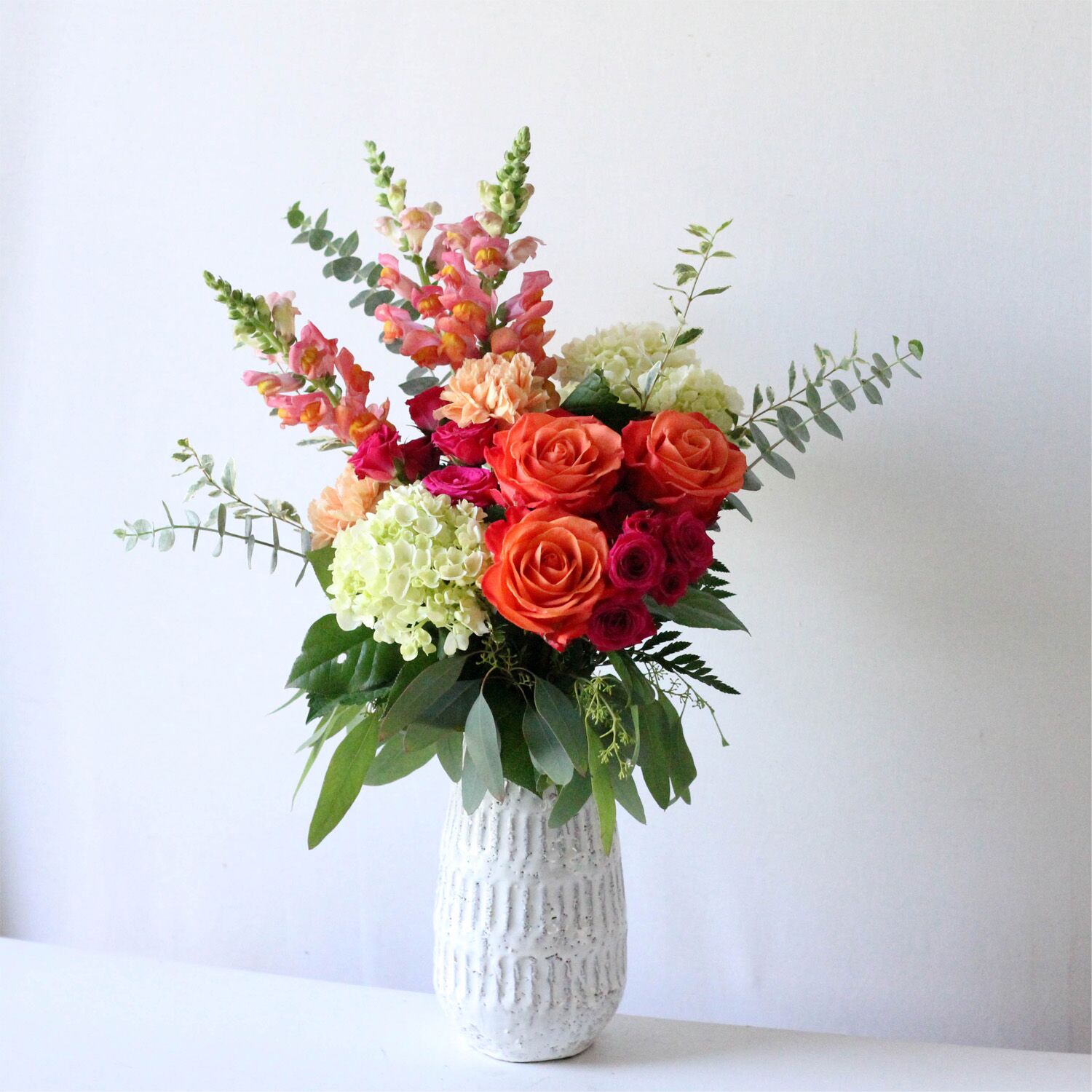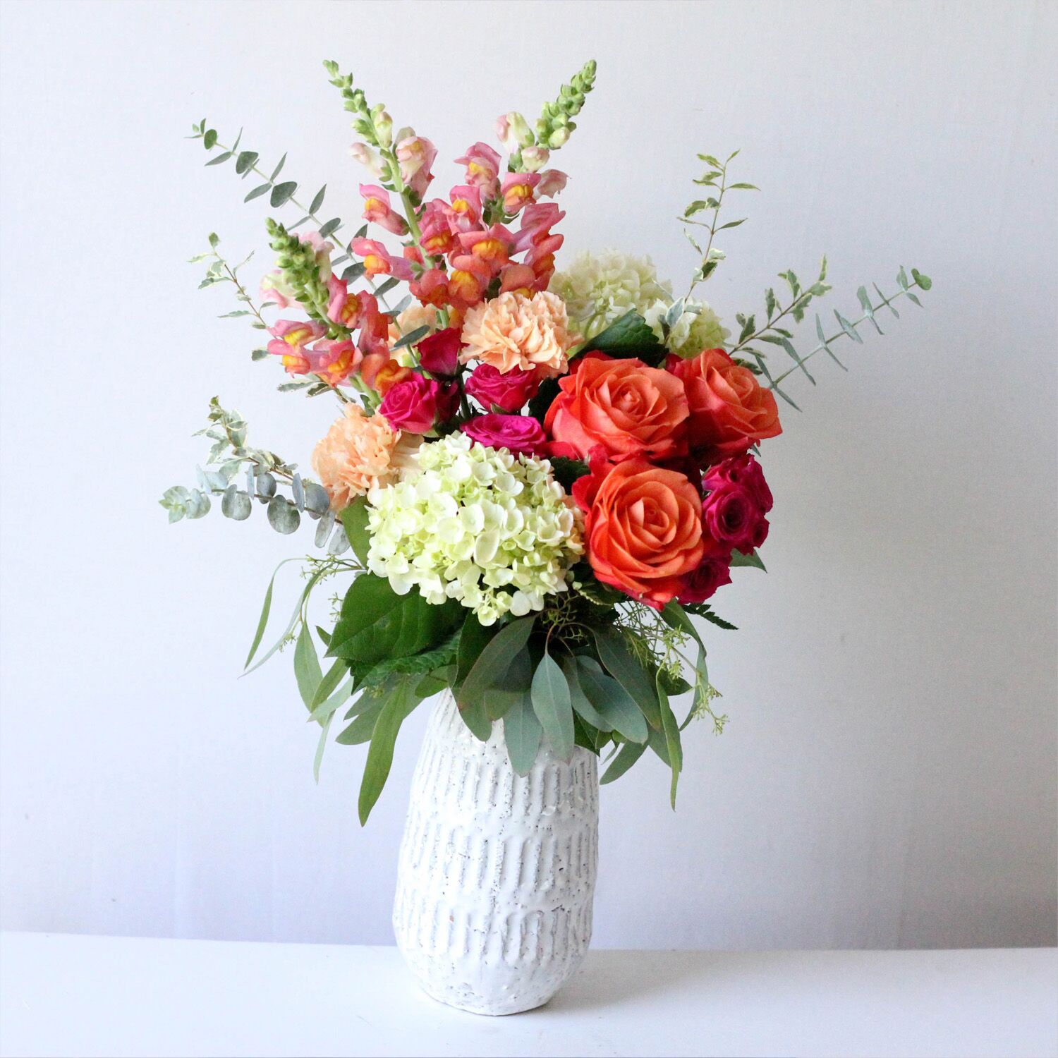The etched, white ceramic Kanab vase holds a beautiful mix of roses, spray roses, Snapdragons, carnations, and mini green hydrangeas, all dancing together.