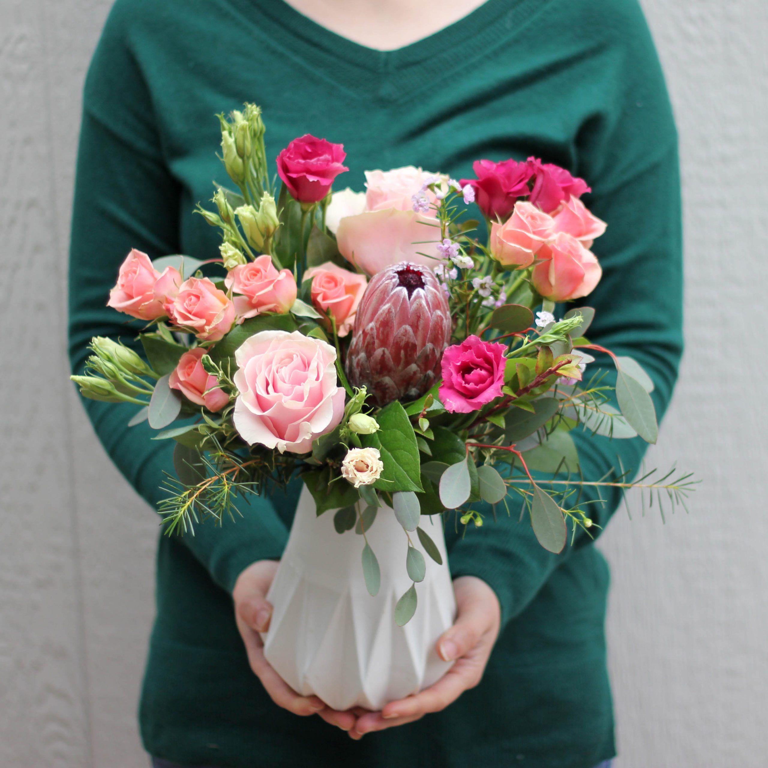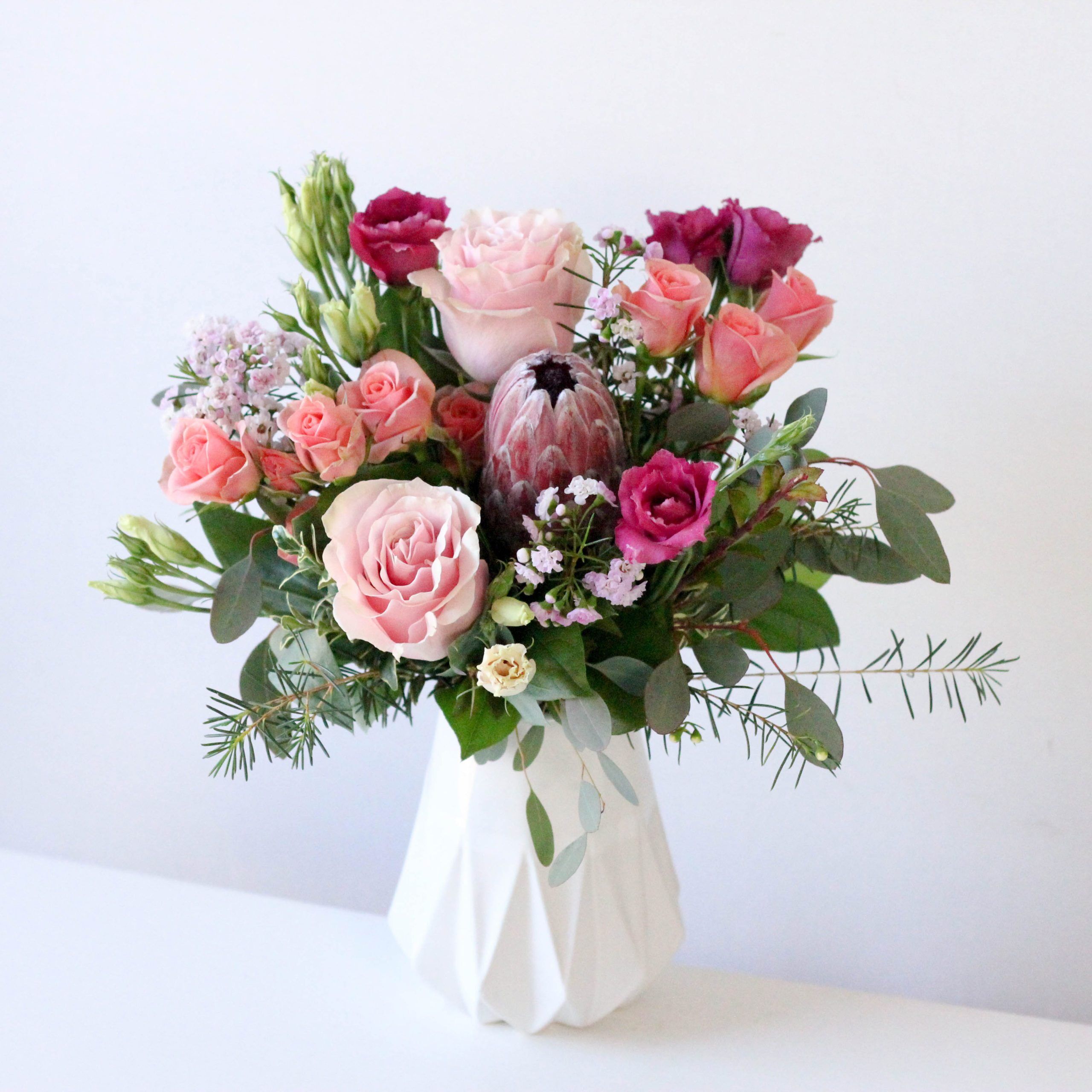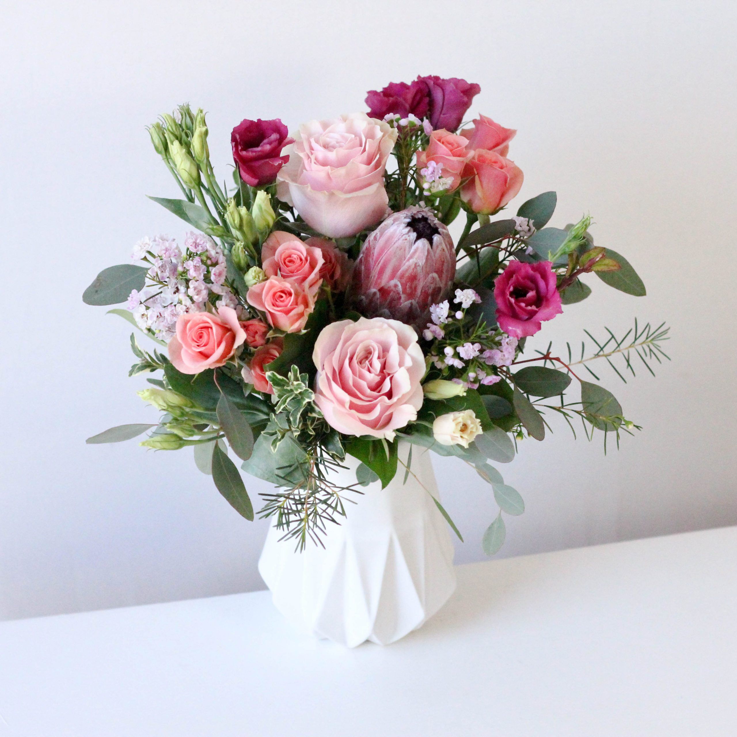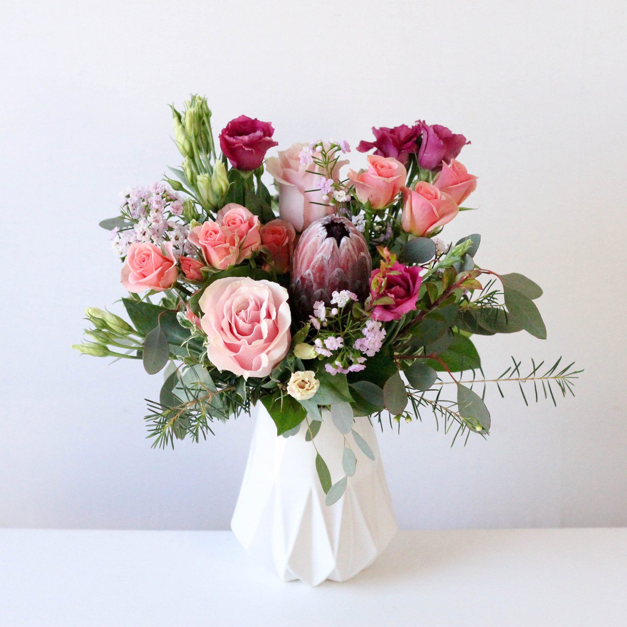 Serene sunset colors indicative of a vacation destination. Fresh roses, princess protea, spray roses and lisianthus in a bed of seasonal greens.