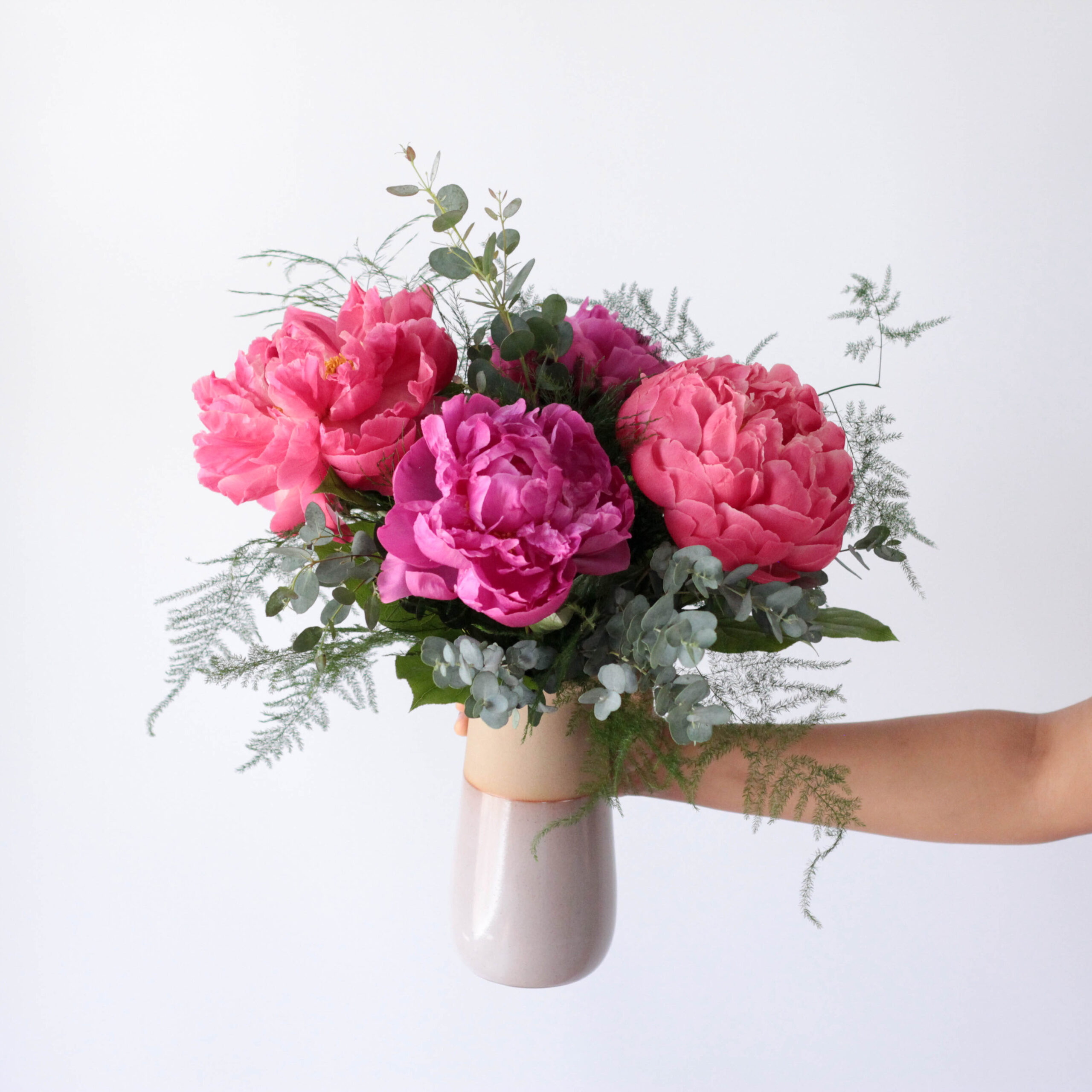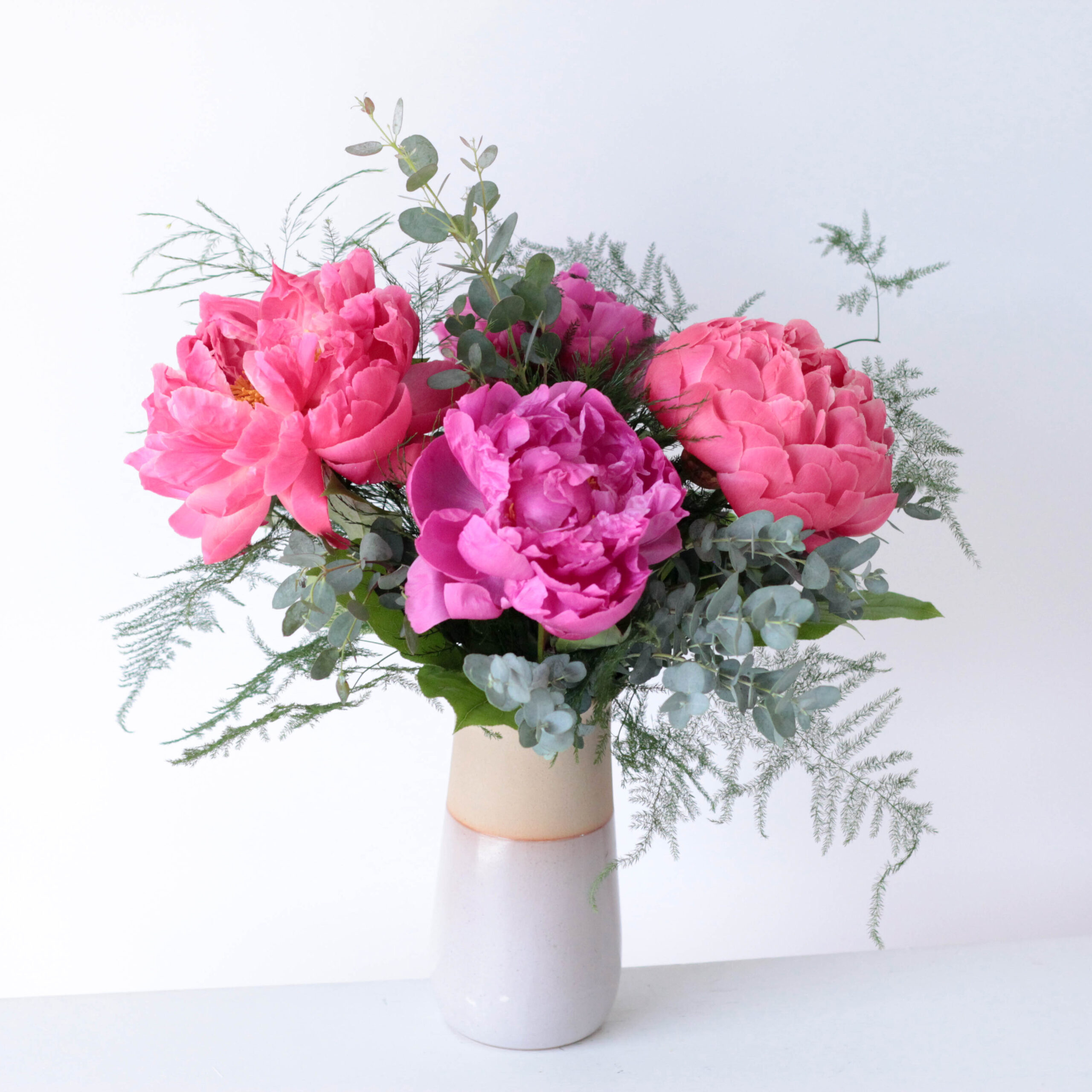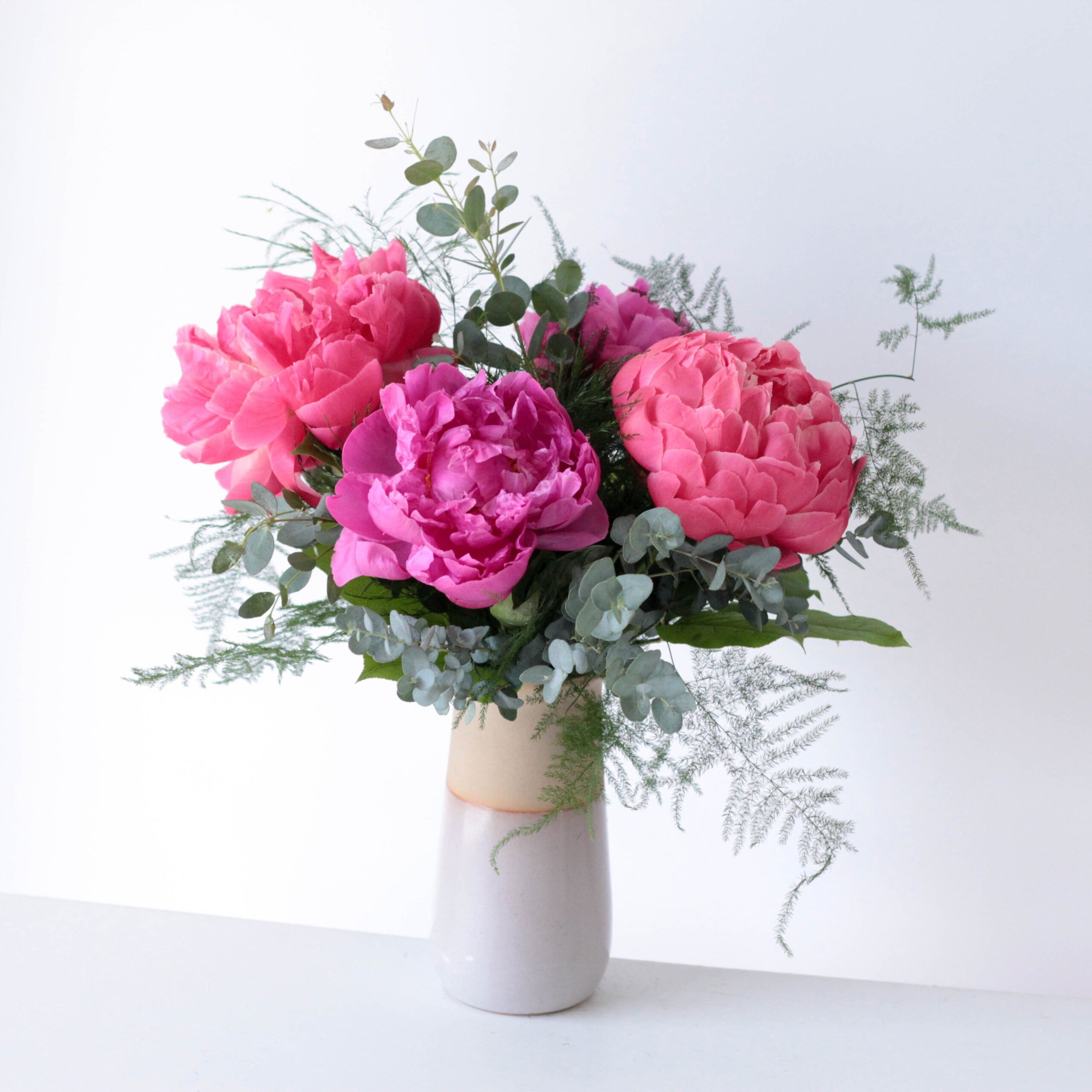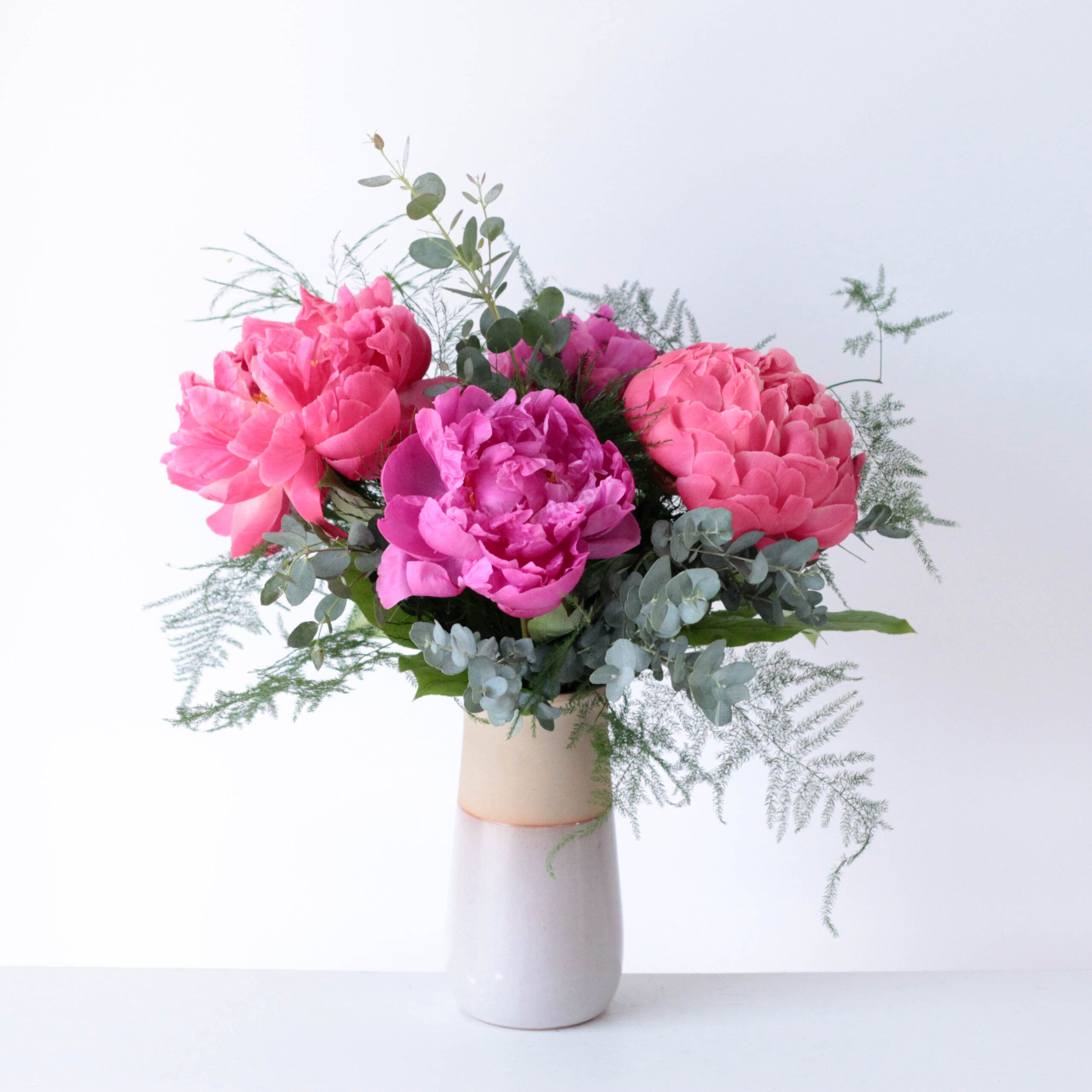 Designed in a classic ceramic vase, this elegant arrangement features four lush peonies surrounded by fresh greenery. A timeless display of beauty and simplicity.