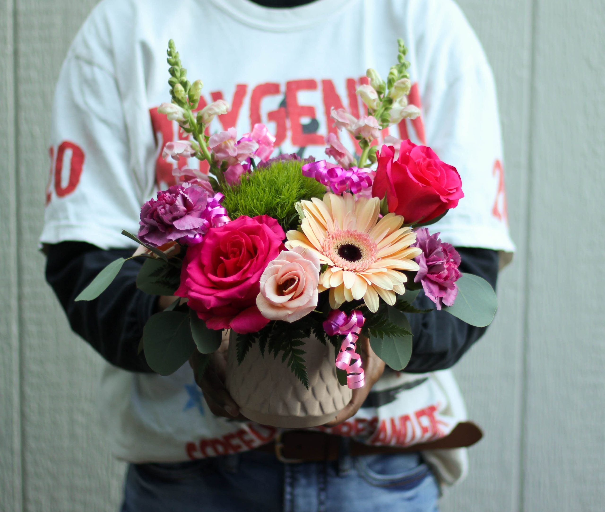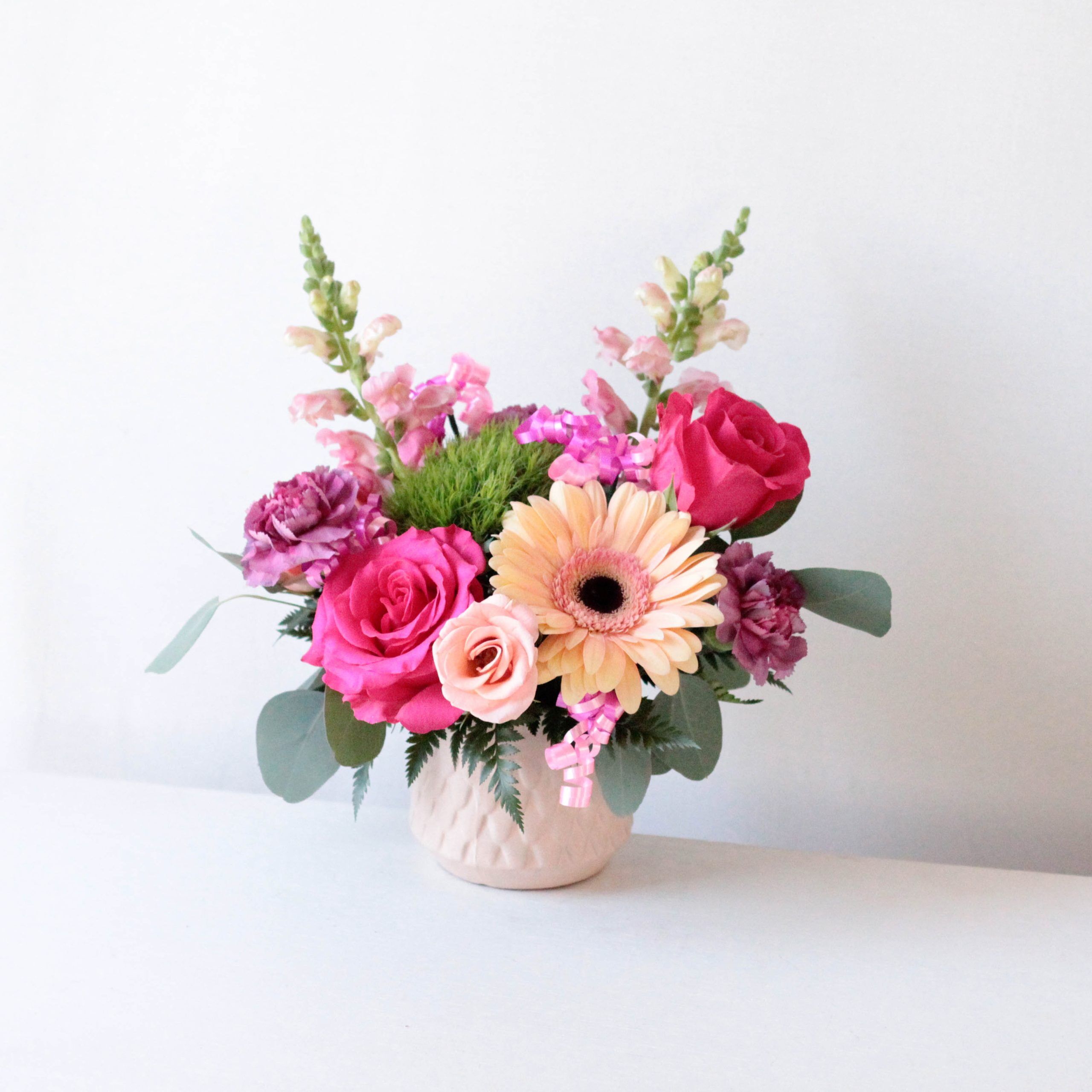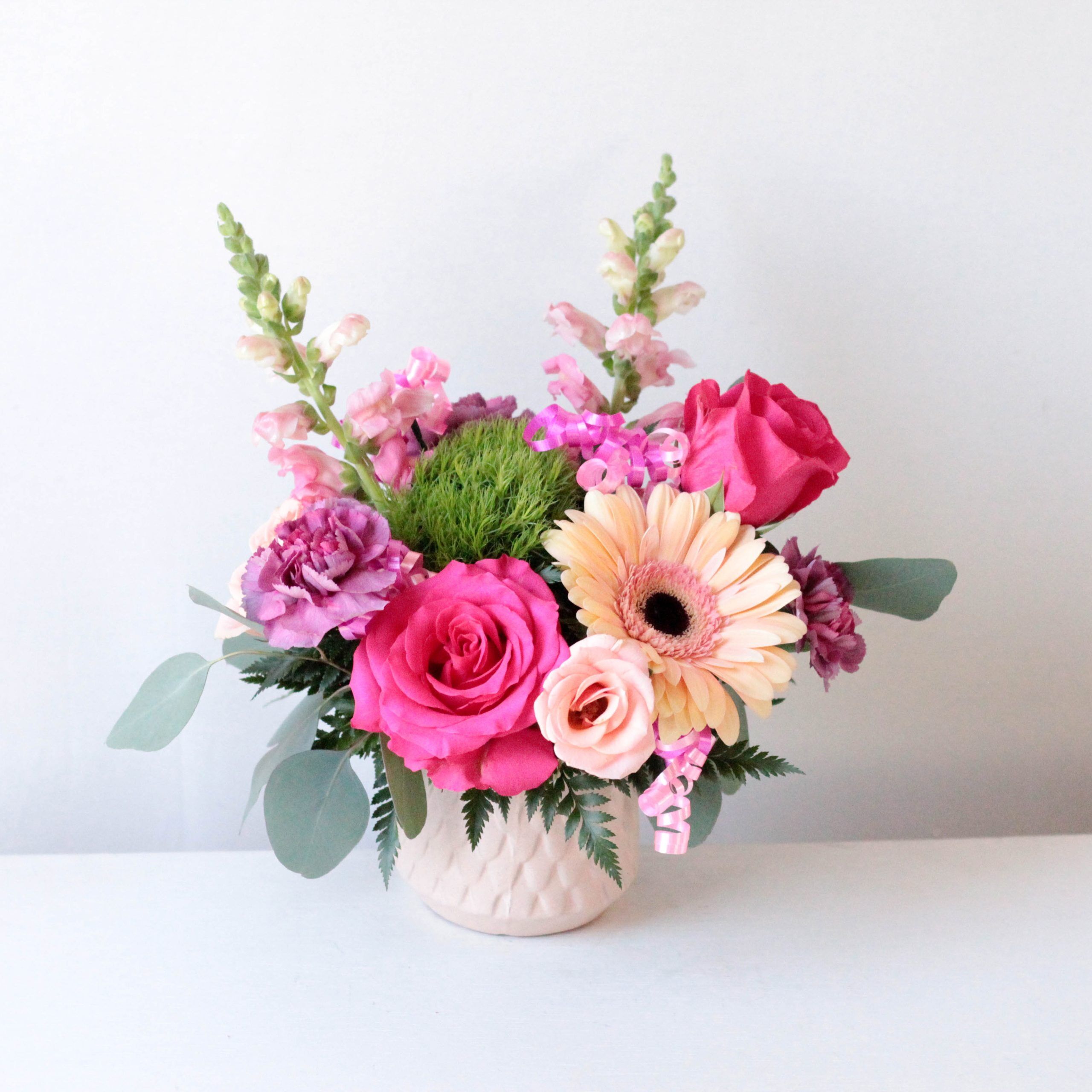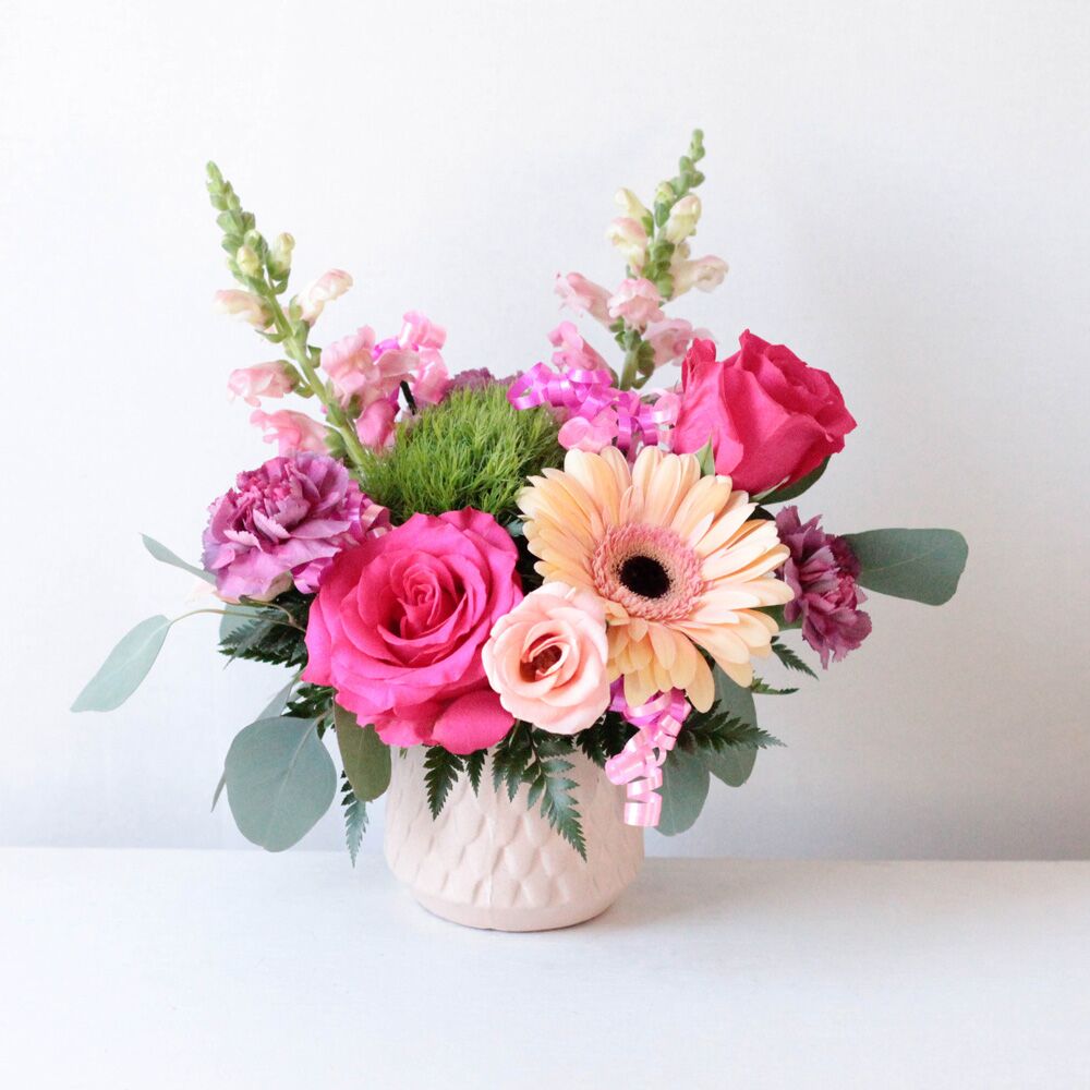Delivered in a pink, scale pattern ceramic vase; Arrangement measures approx. 10″ W x 11″ H