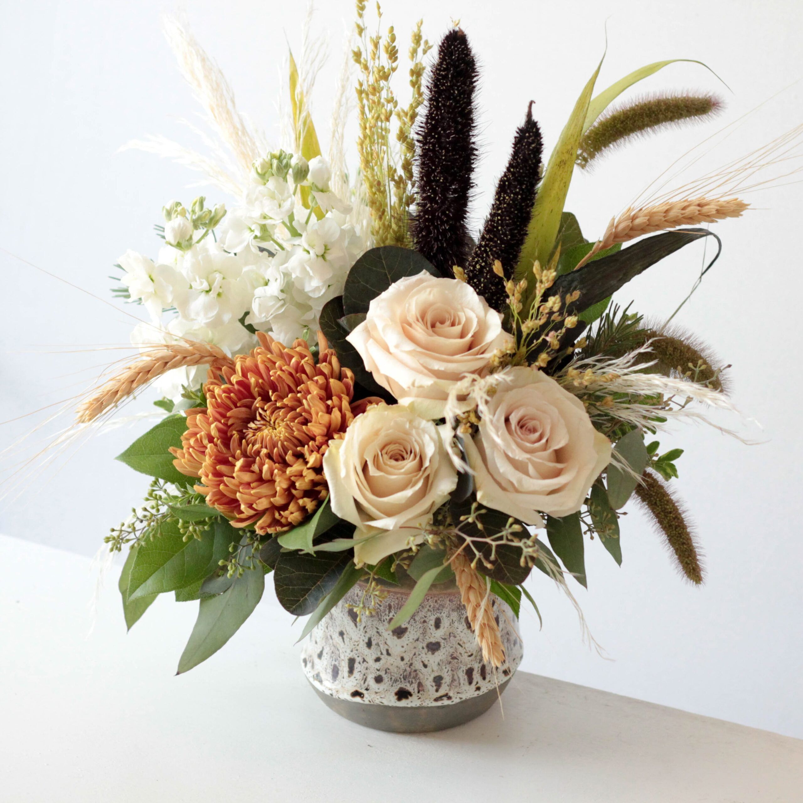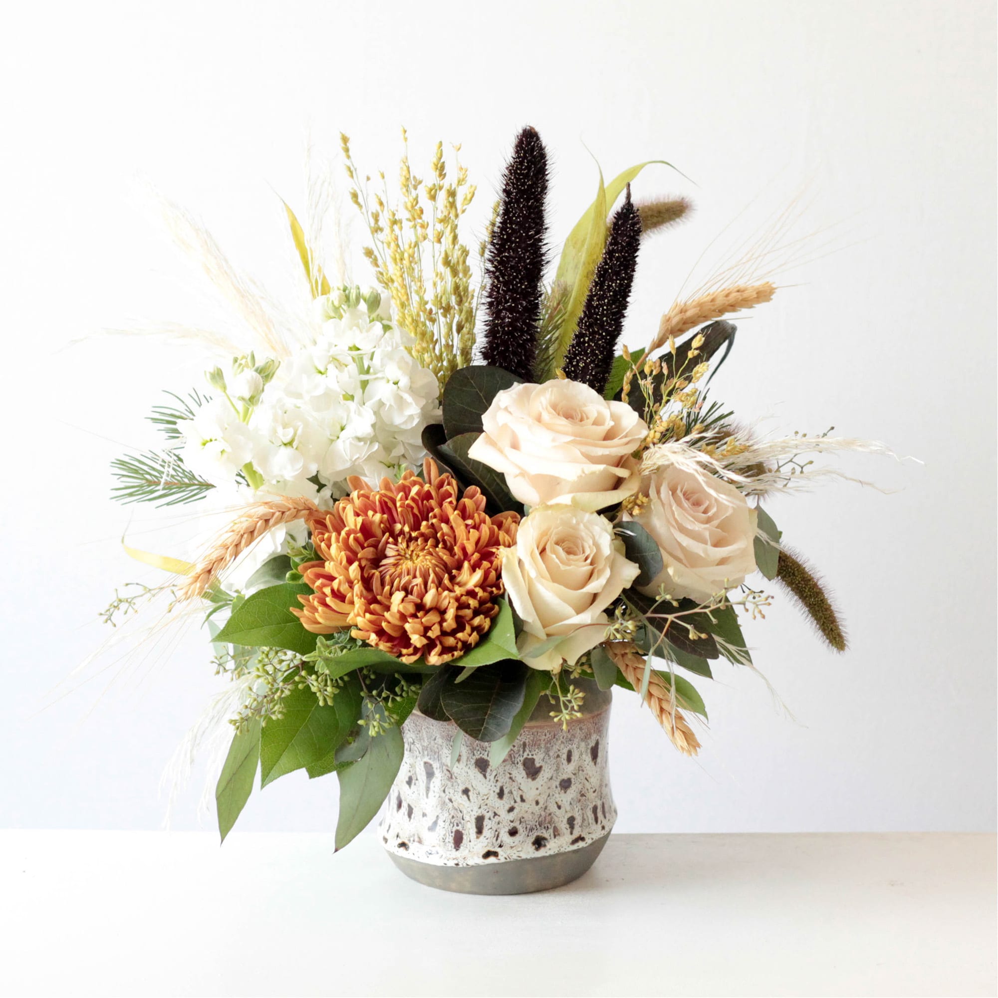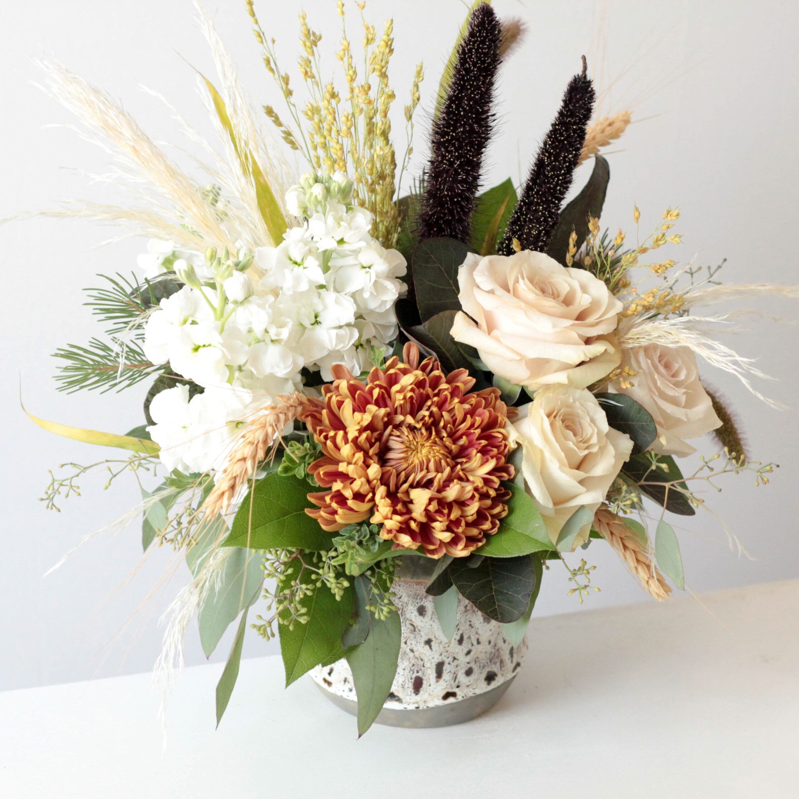 Delivered in a ceramic Paola pot; Arrangement measures approx. 11″ W x 11″ H