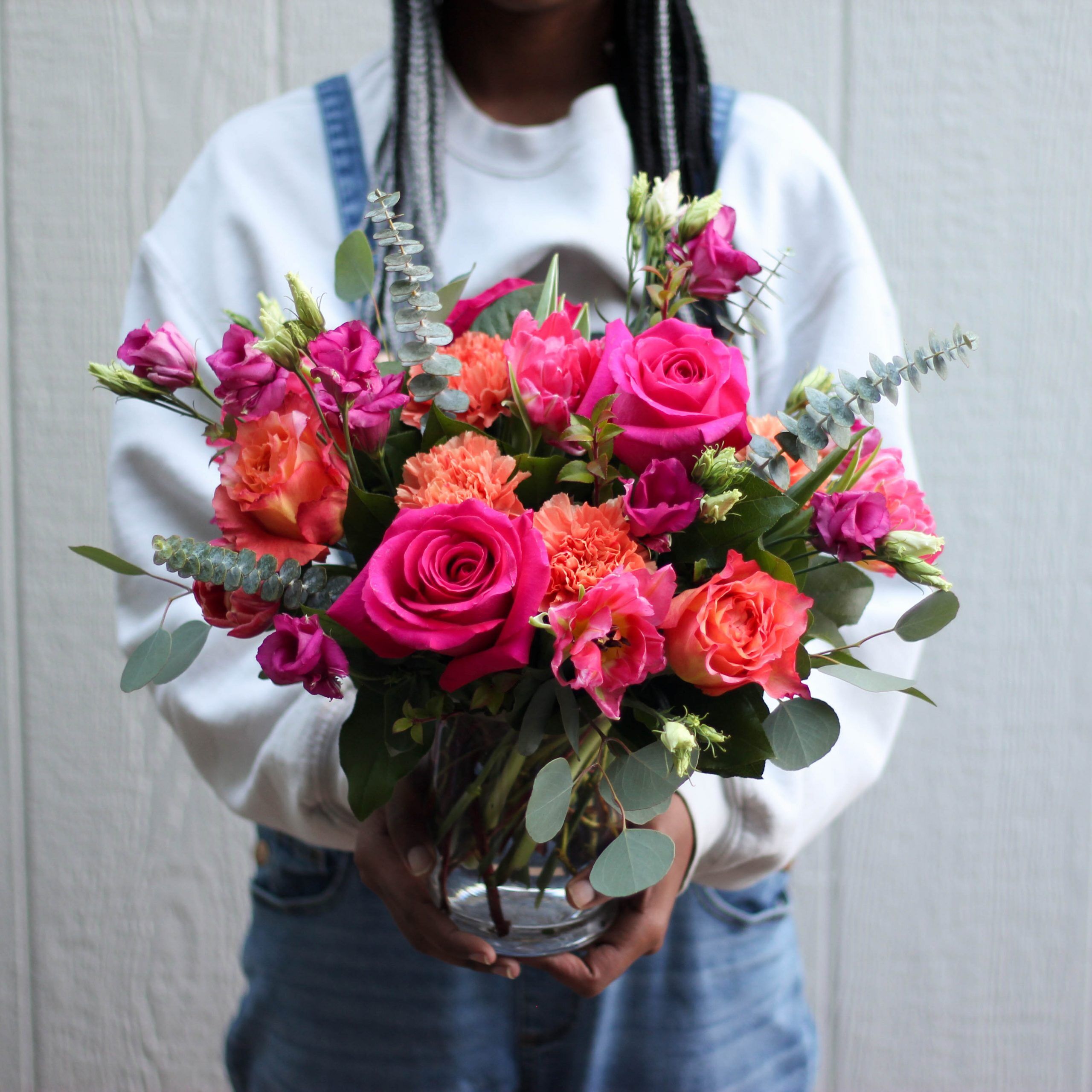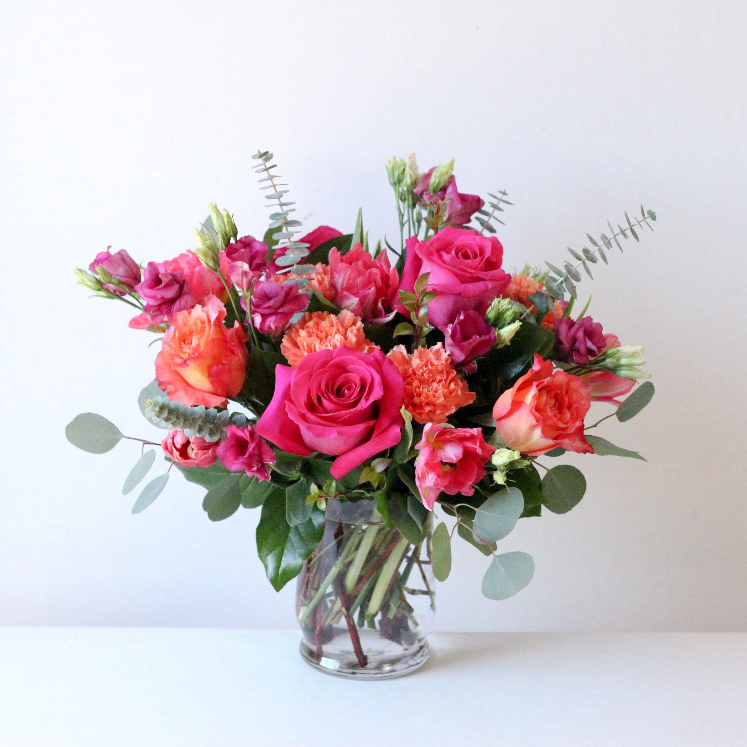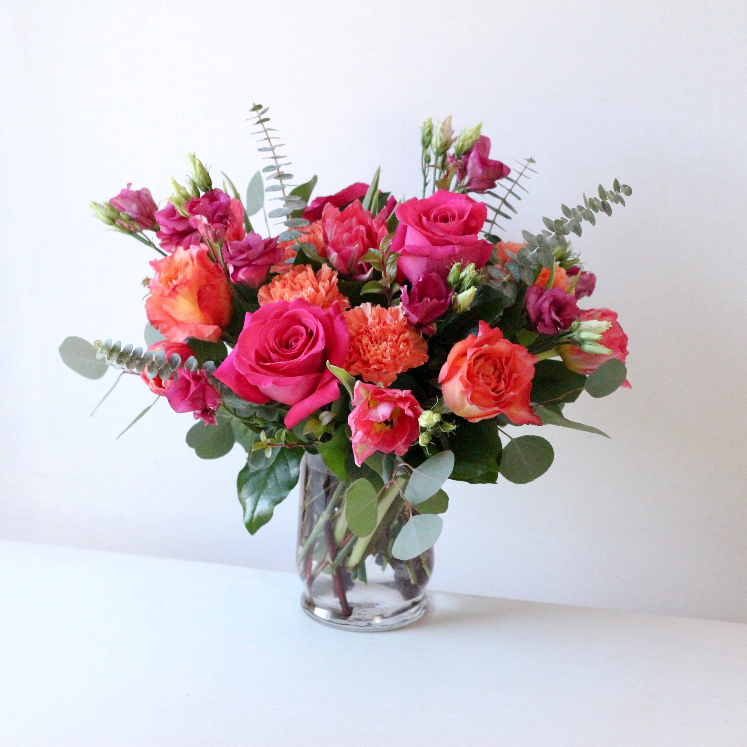 A party in a vase! Six, bright, beautiful roses, carnations, lisianthus, and tulips dance together among a bed of seasonal accents and greens.