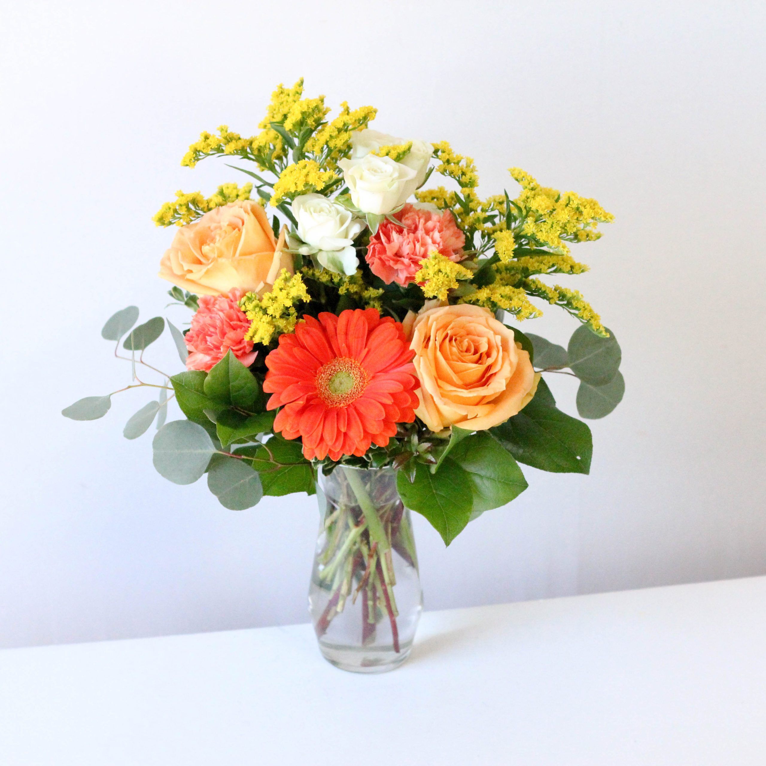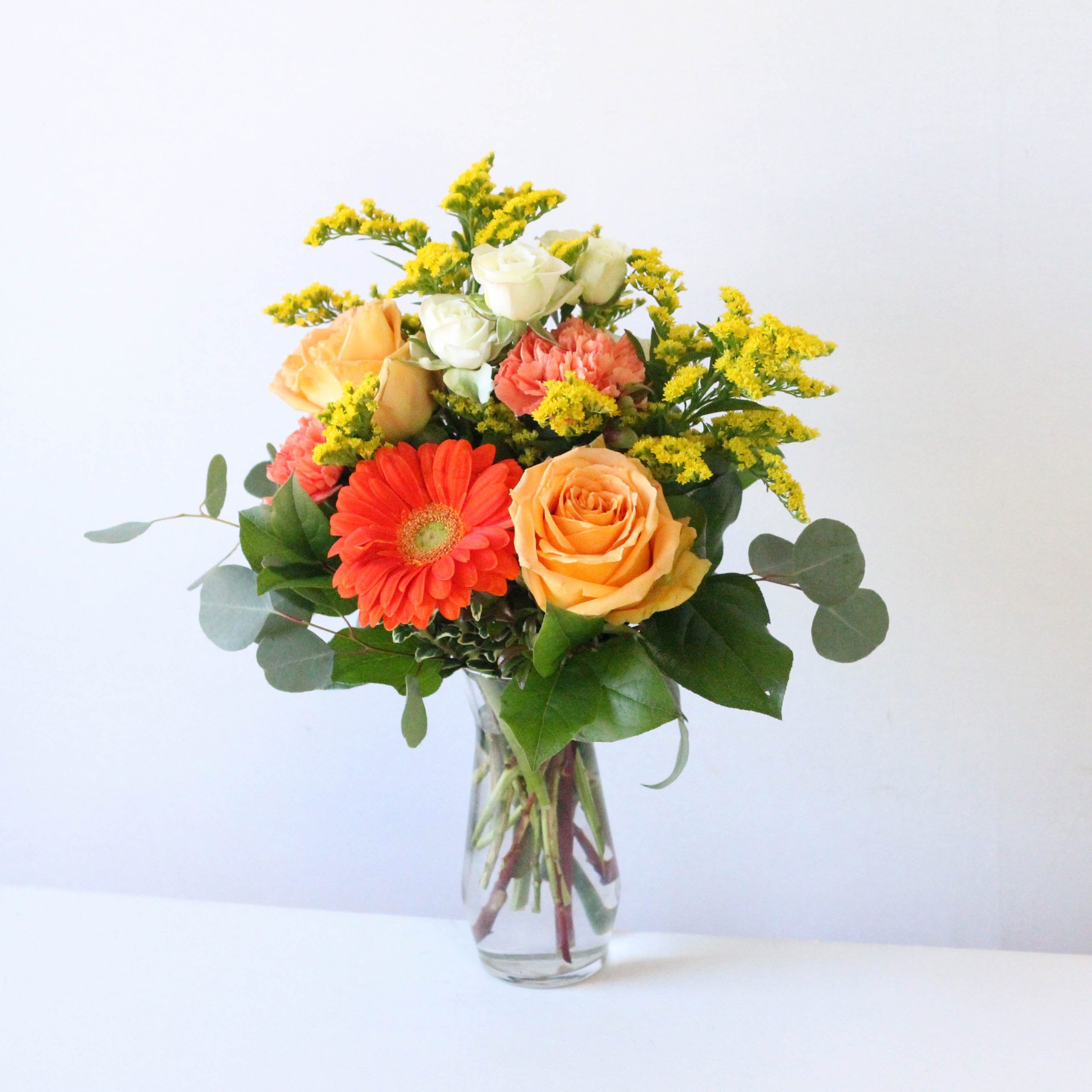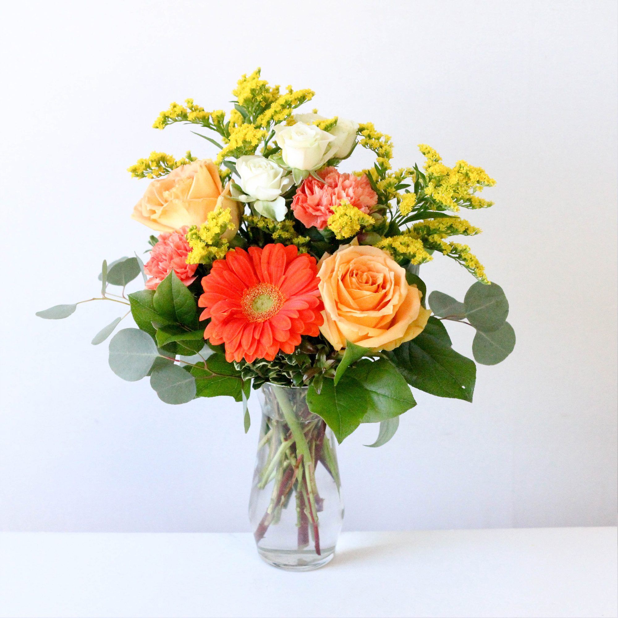Arranged in a clear glass vase; Arrangement stands approx. 10″ W x 14″ H