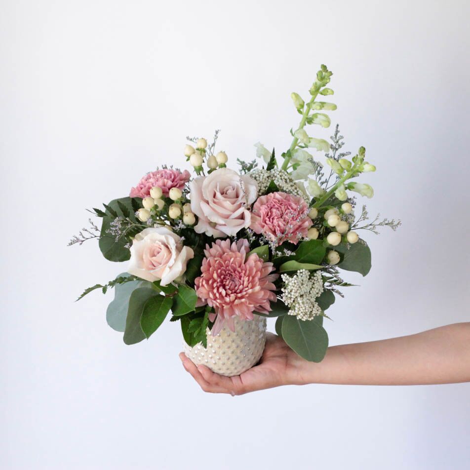 You’ll be clutching your pearls when you receive this baddie! She’s a beauty featuring soft pink roses, cremones, and snapdragons.