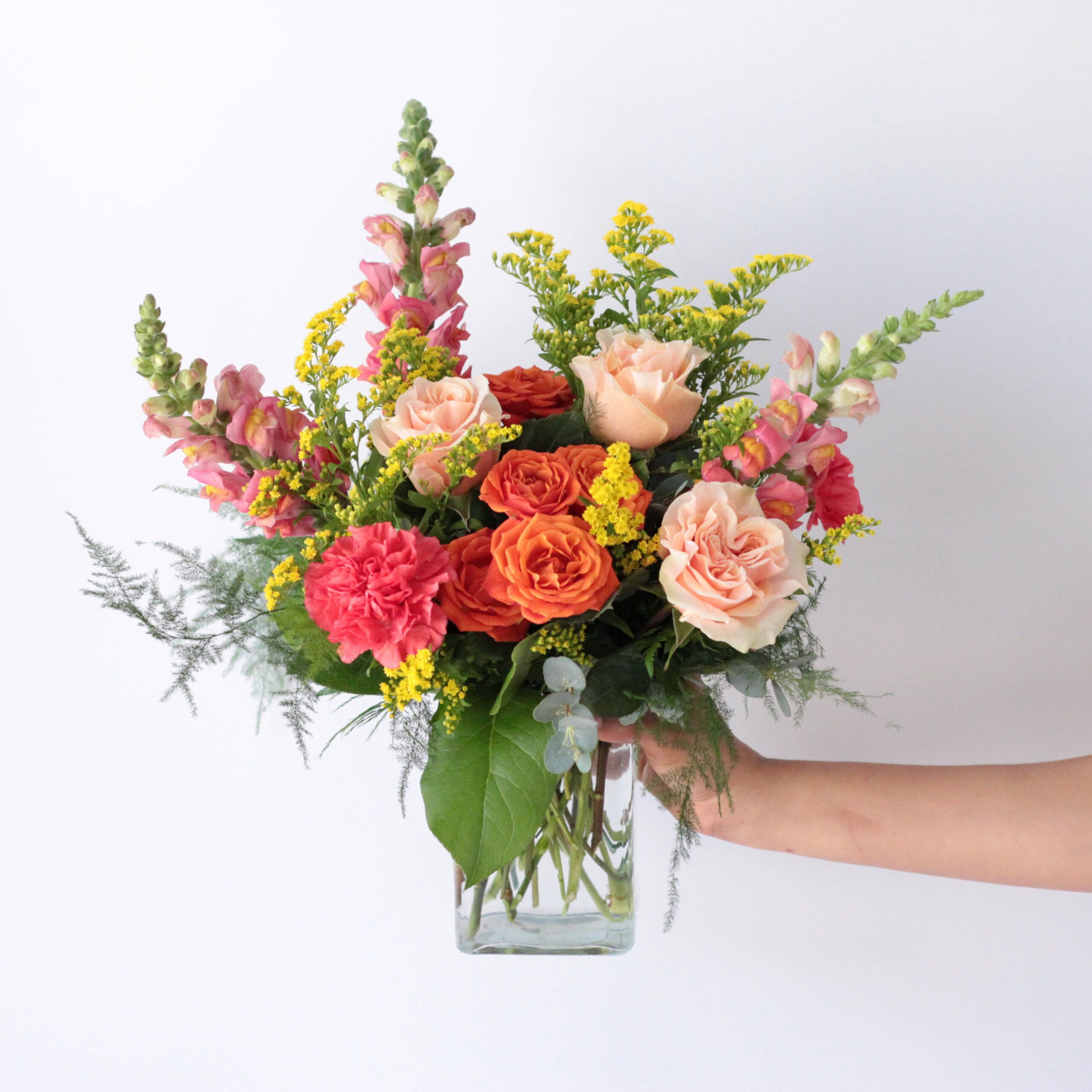 Feeling thirsty? This bright arrangement in tasty citrus hues will quench their thirst for a color burst! Snapdragons, roses, and more are designed in a clear, glass vase and will surely guarantee you a sip sip.
