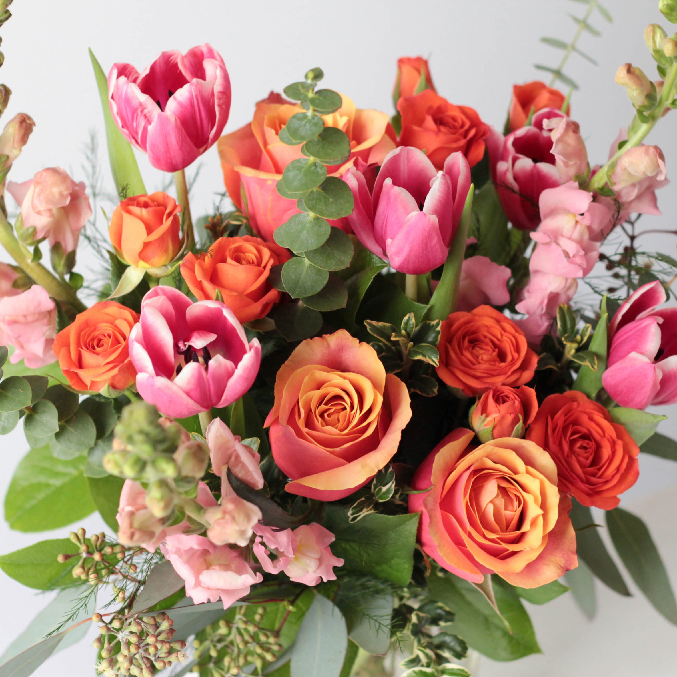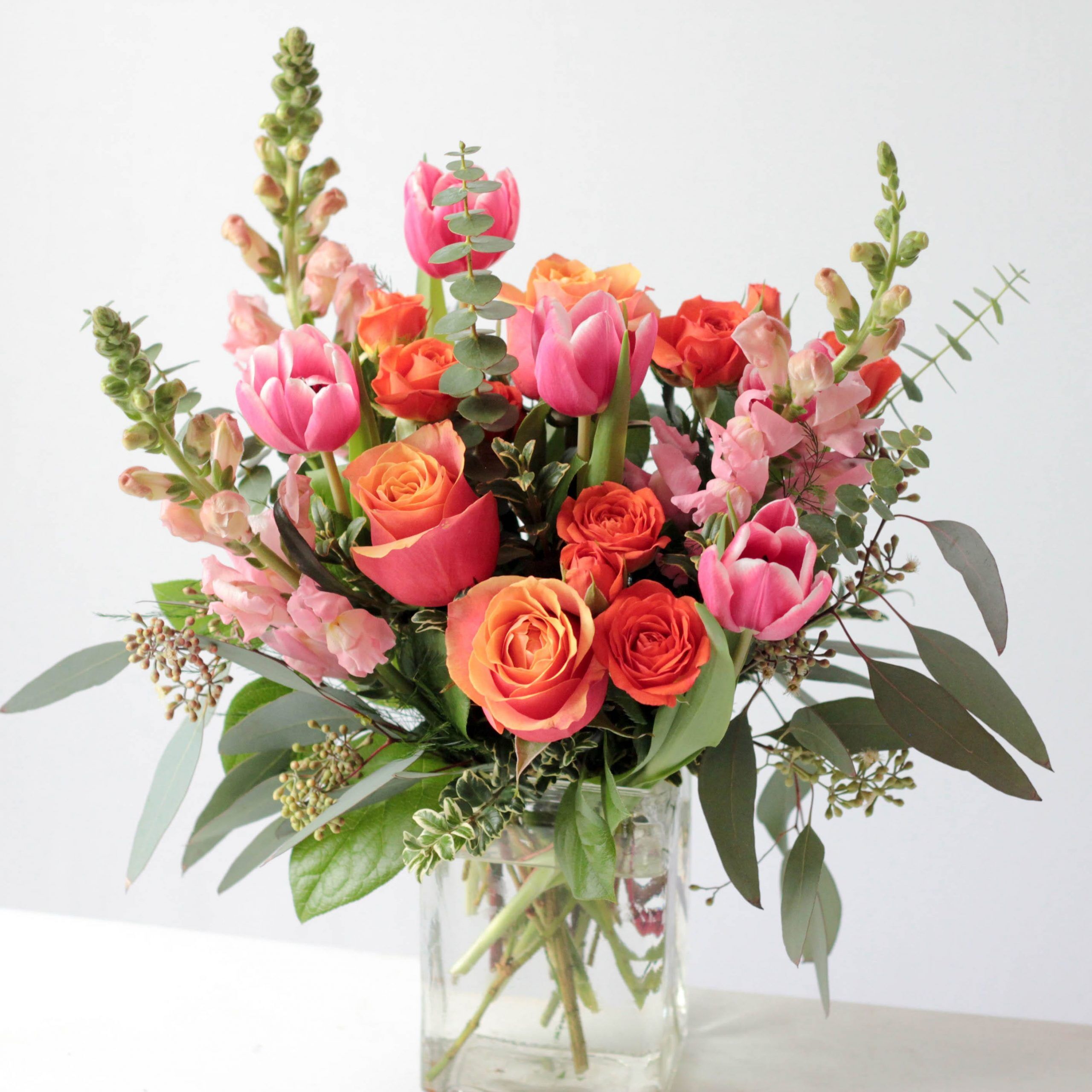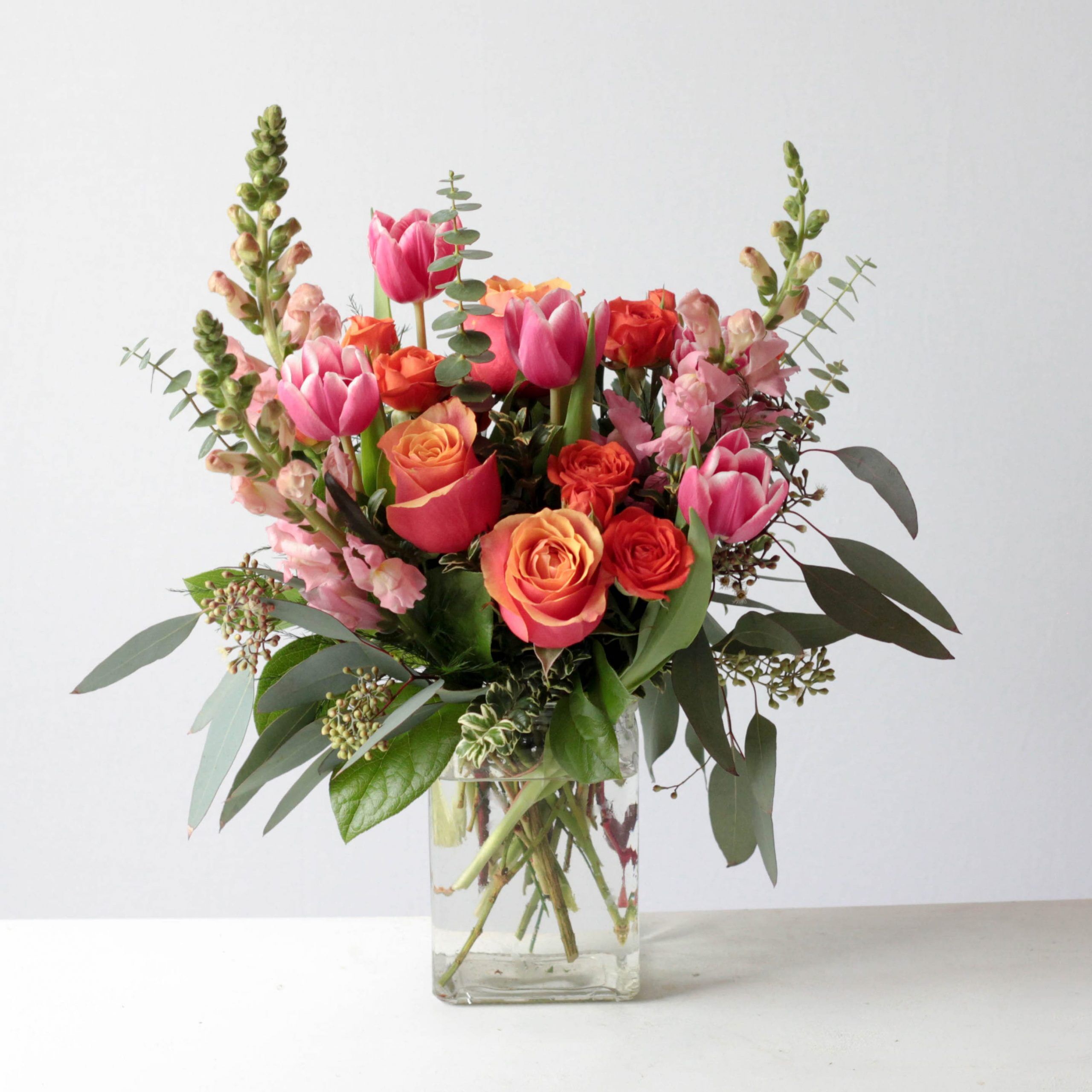 Roses, spray roses, tulips and snapdragons are delivered in a clear glass vase.