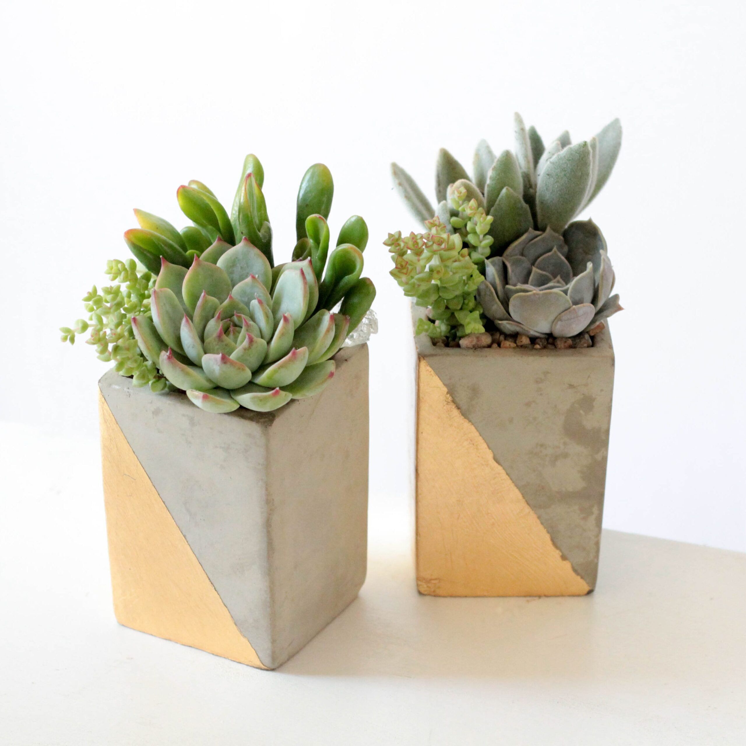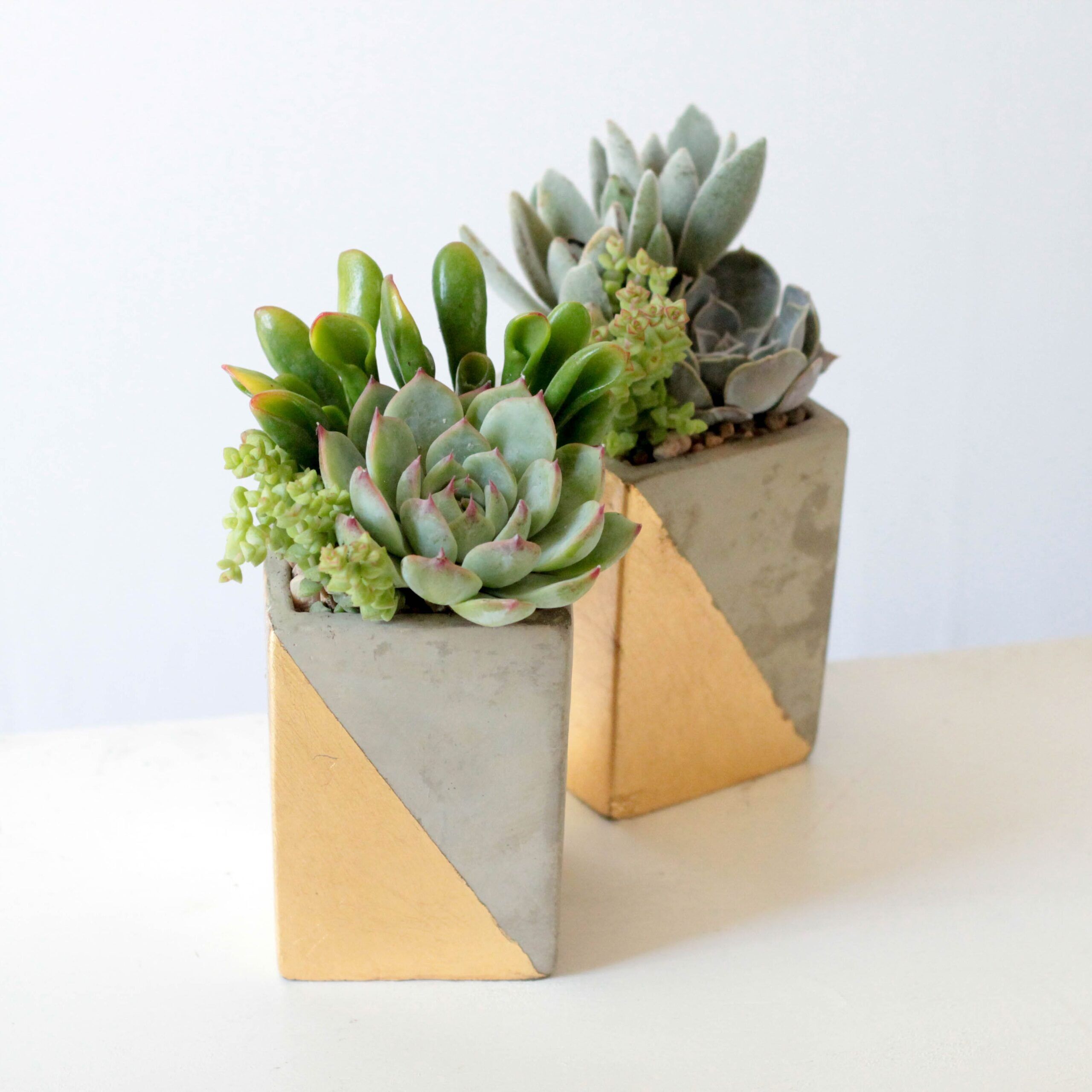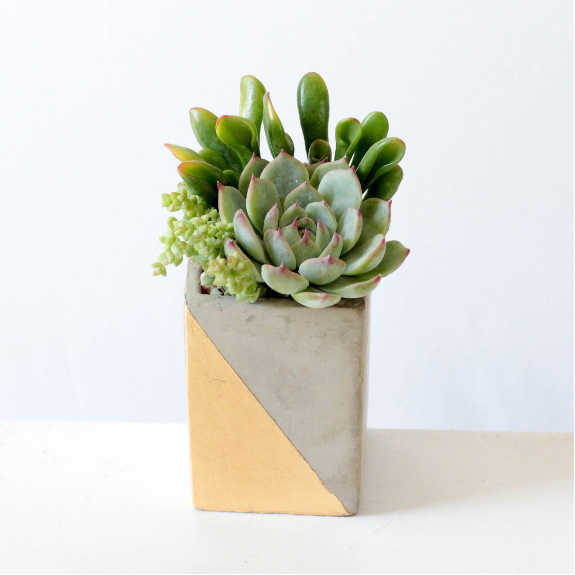 A succulent garden consisting of a variety of several 2″ and 4″ succulents planted in a lovely, gold stained concrete planter.