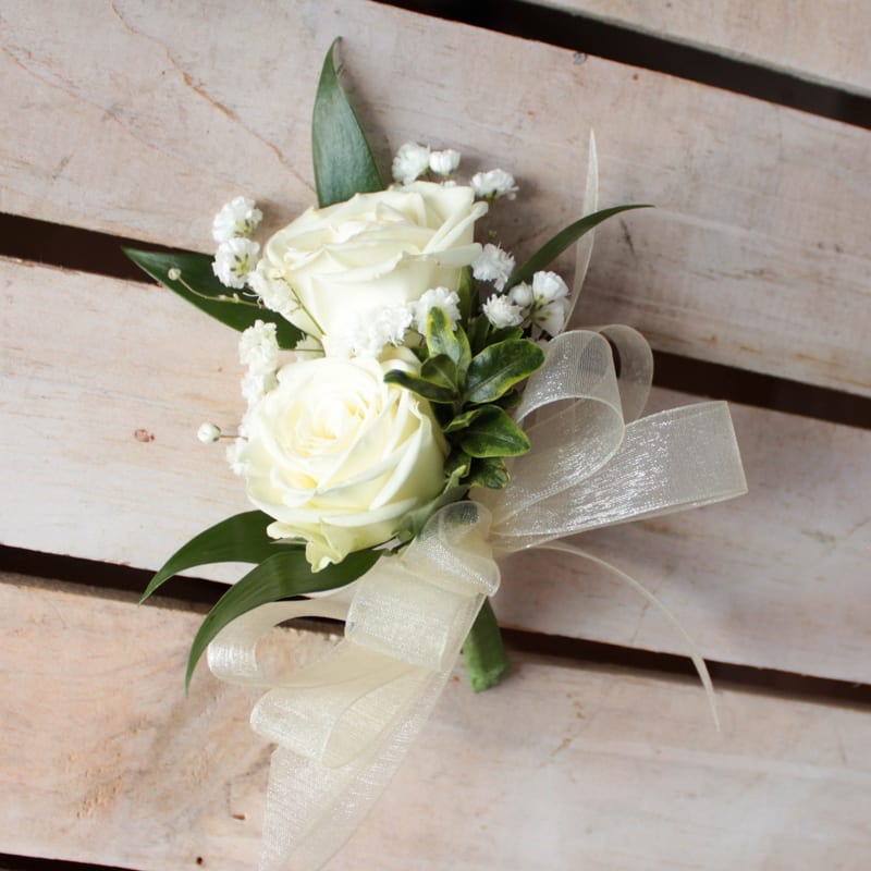 Two spray roses accented by greens, filler and a coordinating bow. Attachment pins are included.