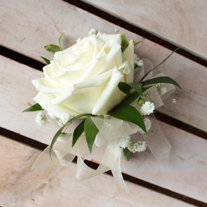 A single rose accented by greens, filler and a coordinating bow. Attachment pins are included.