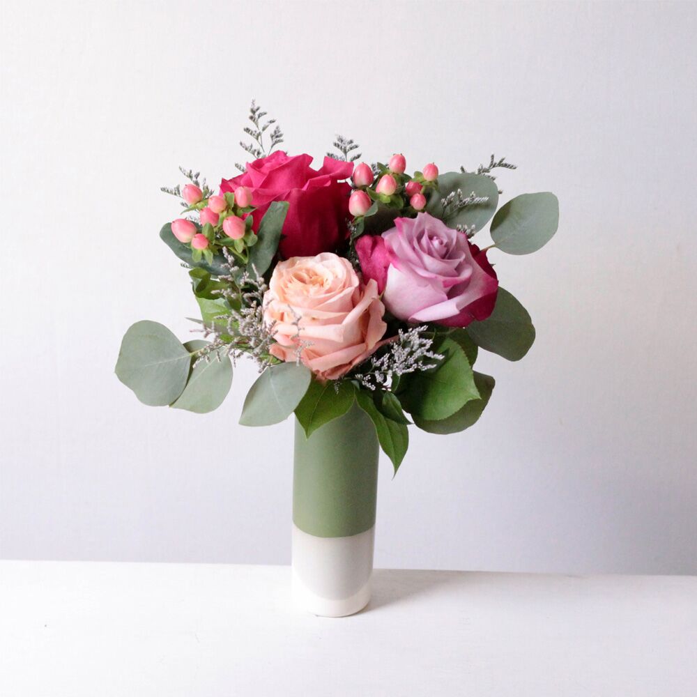Spread a bit of sunshine when they get this lovely arrangement of three roses in coordinating colors with light filler and greens.