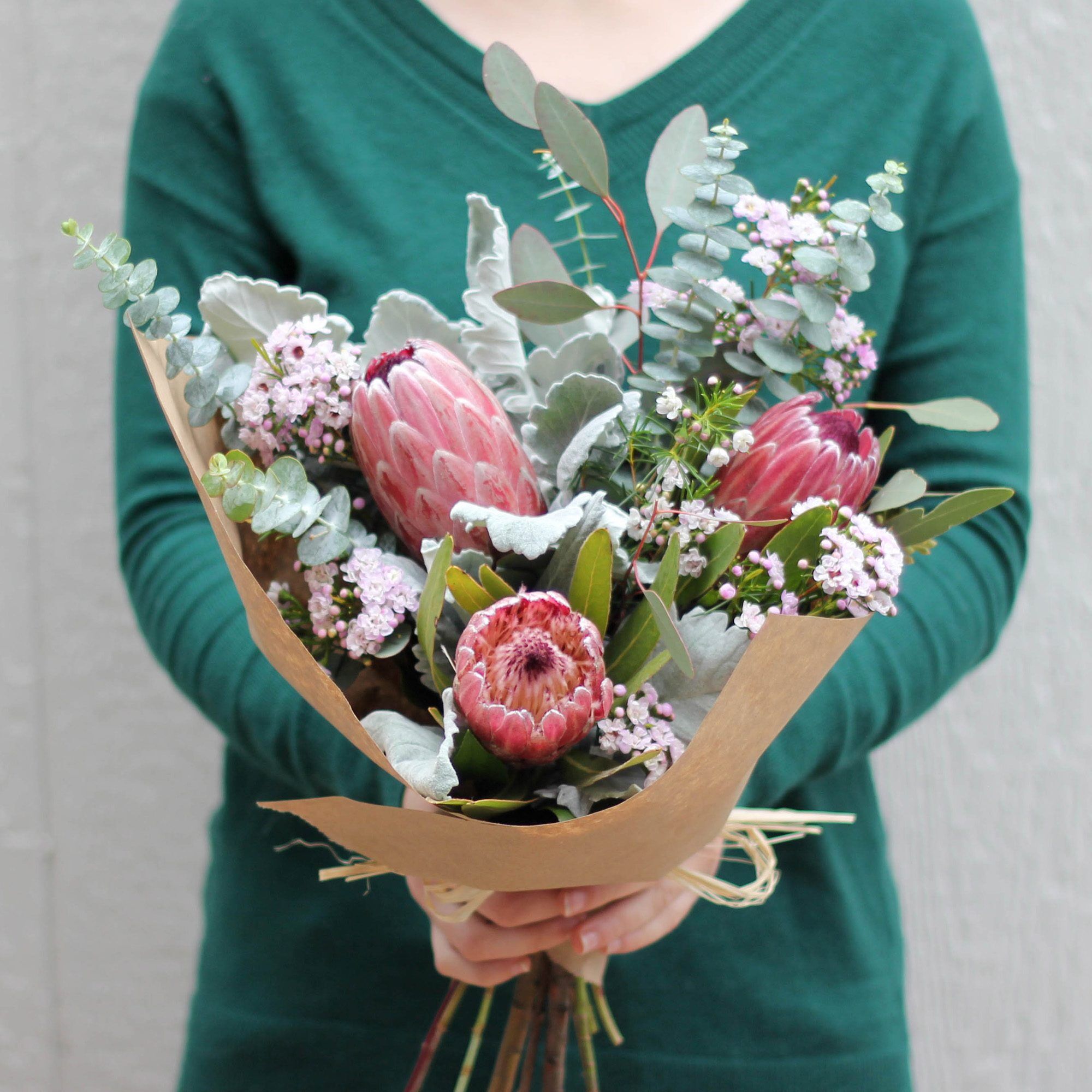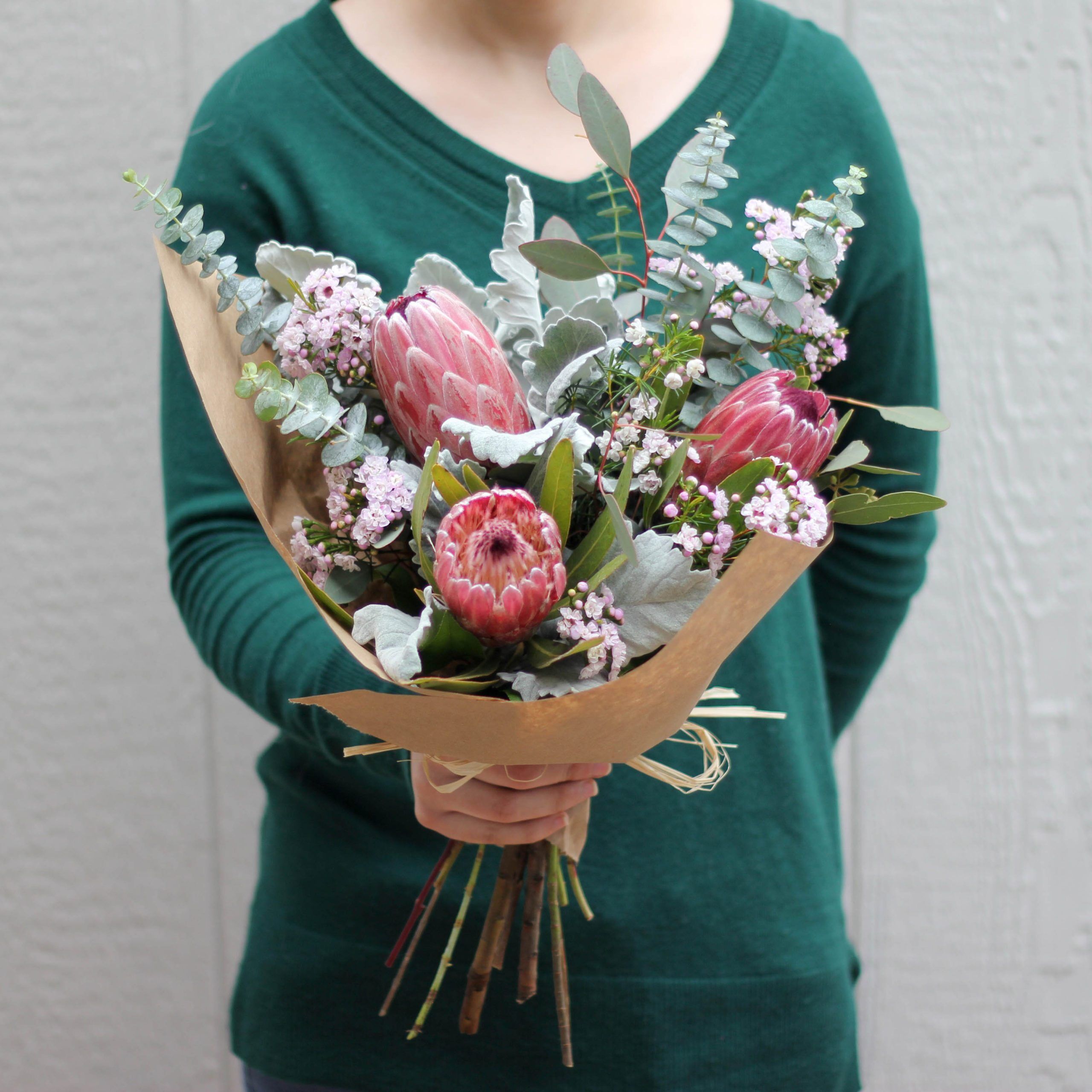Starting Price incudes: Three stems of pink protea, eucalyptus, greens and filler.