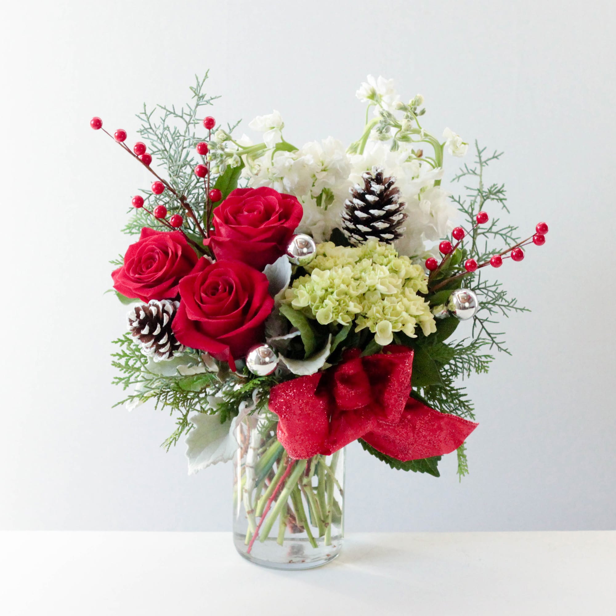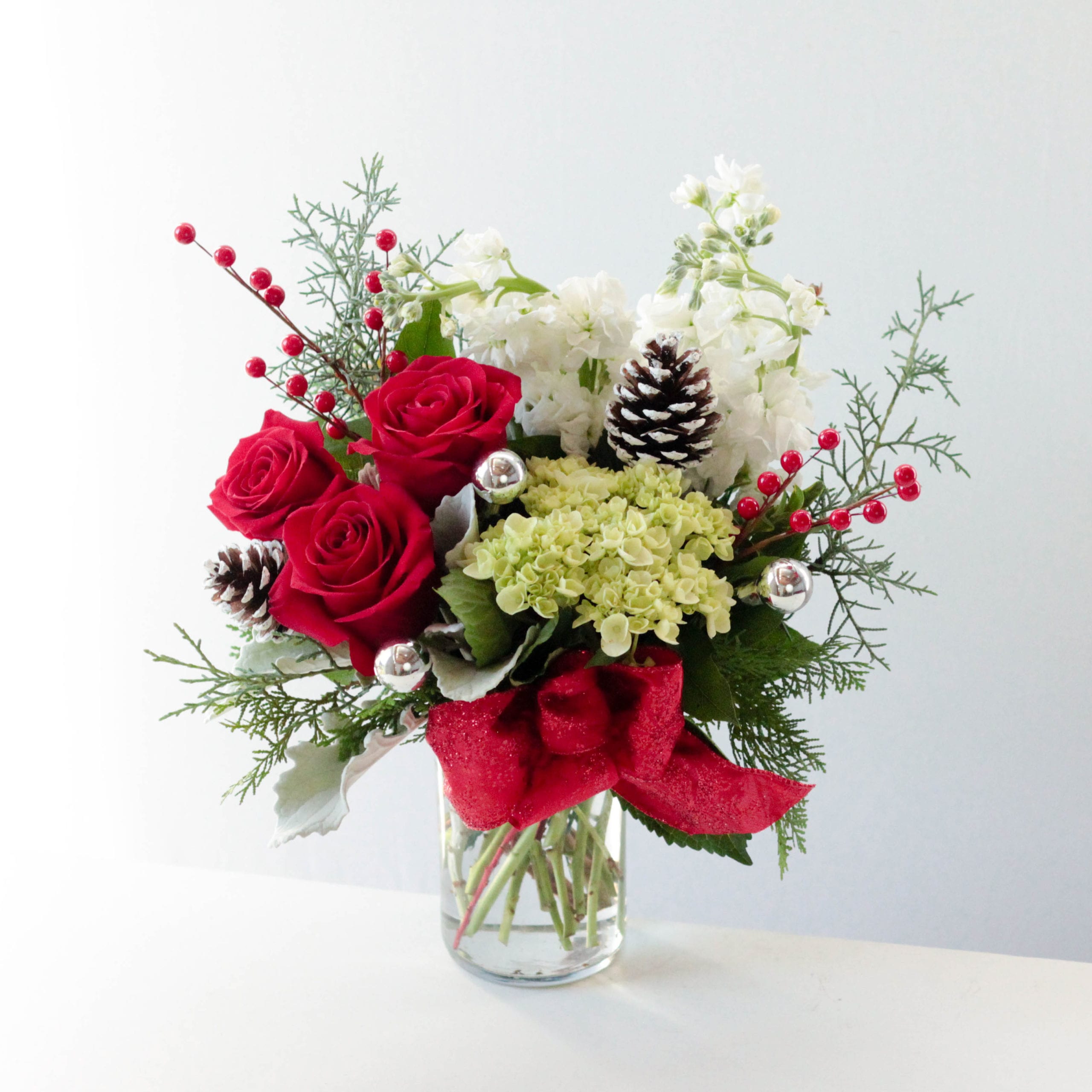 Three bright red roses, vibrant green mini hydrangea and fragrant white stock are artfully arranged in a lovely design adorned by seasonal greens, fillers and holiday ting.