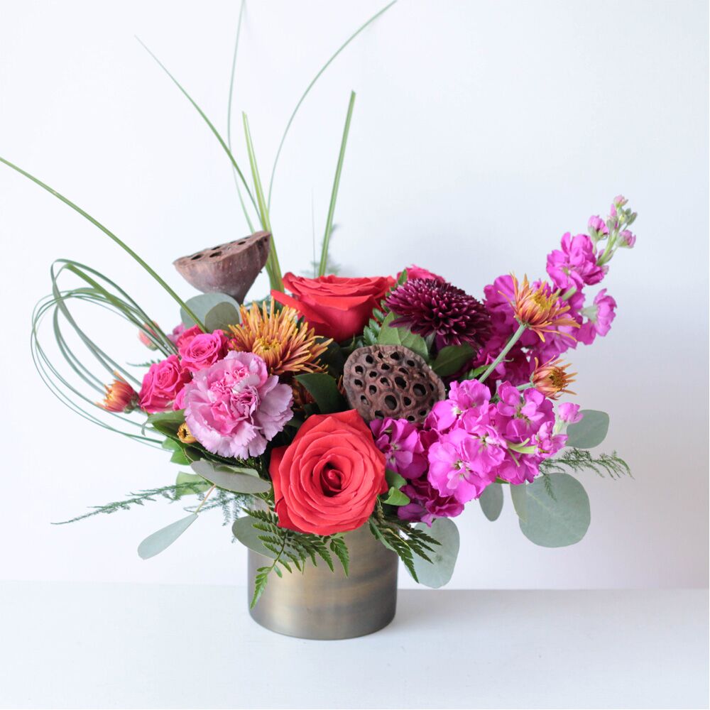 This passionate arrangement has deep tones of purples, pinks, and plums, displayed by fresh-cut blooms.