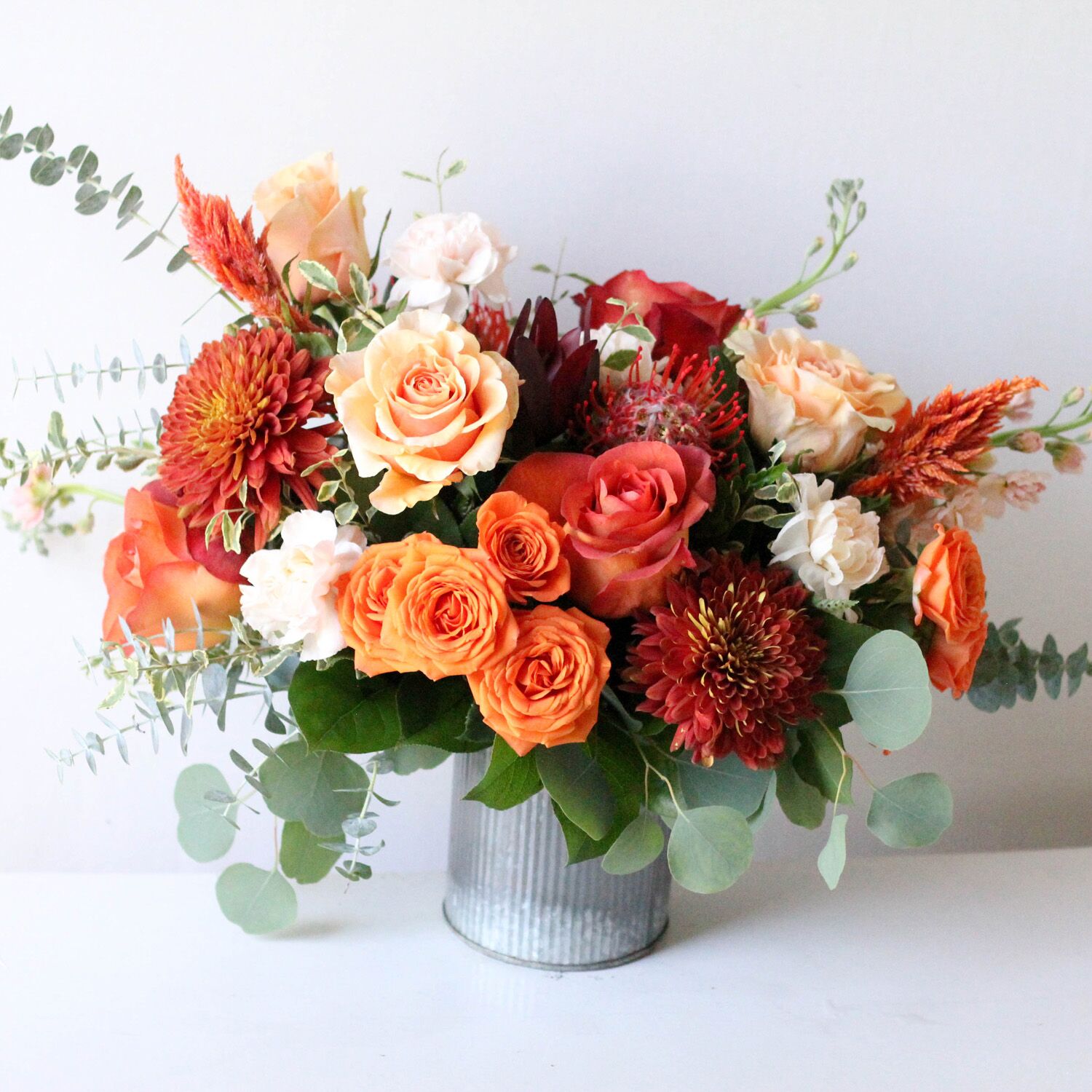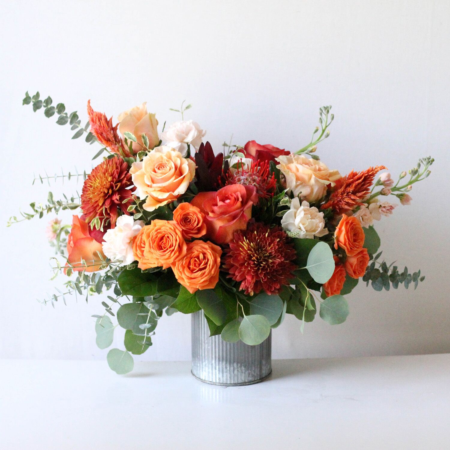 A lovely arrangement that will send them on their way to a great day! Rust-colored Coffee Break roses are surrounded by pin-cushion protea, carnations, and spray roses arranged in a rustic tin pot to create a warm and charming aesthetic.