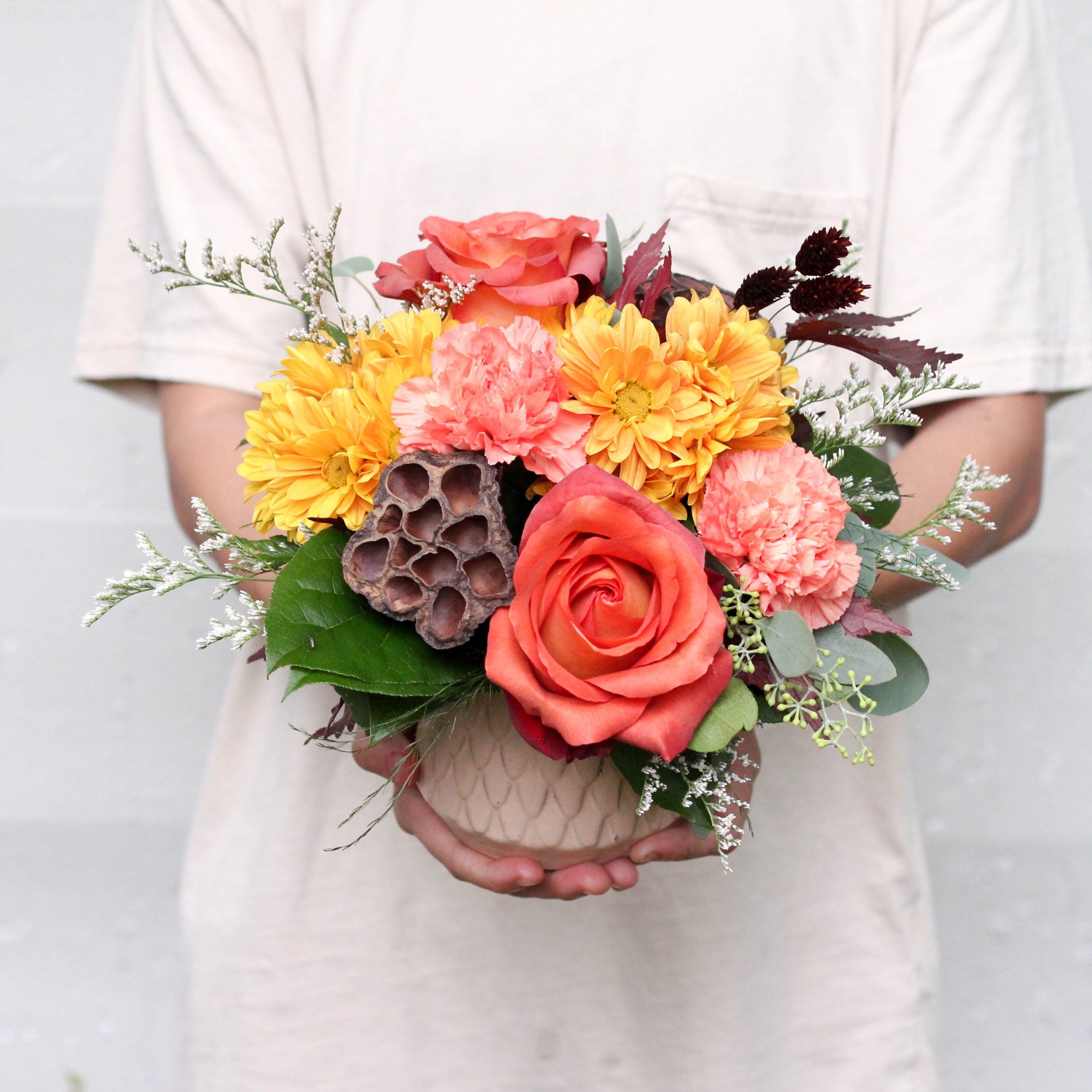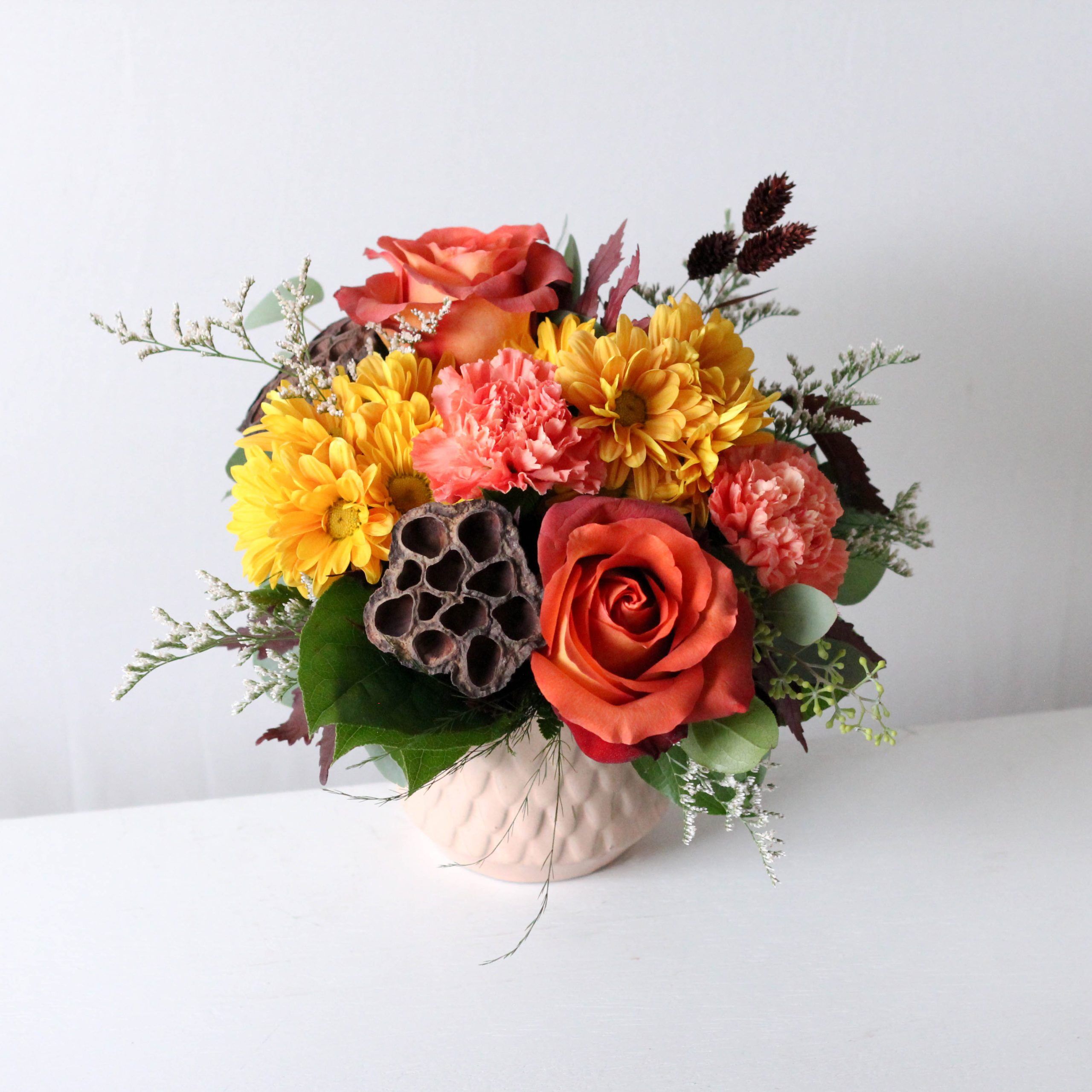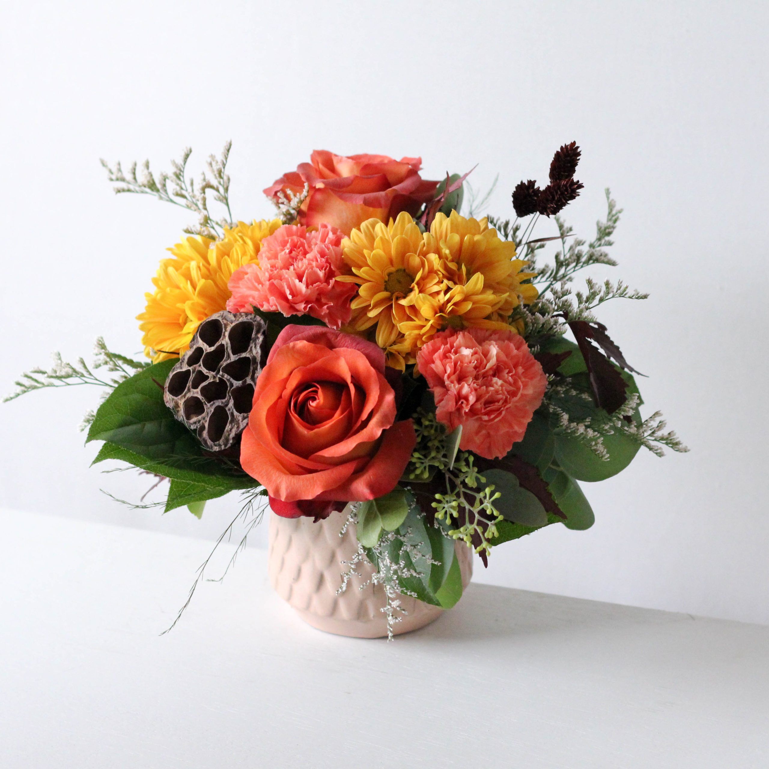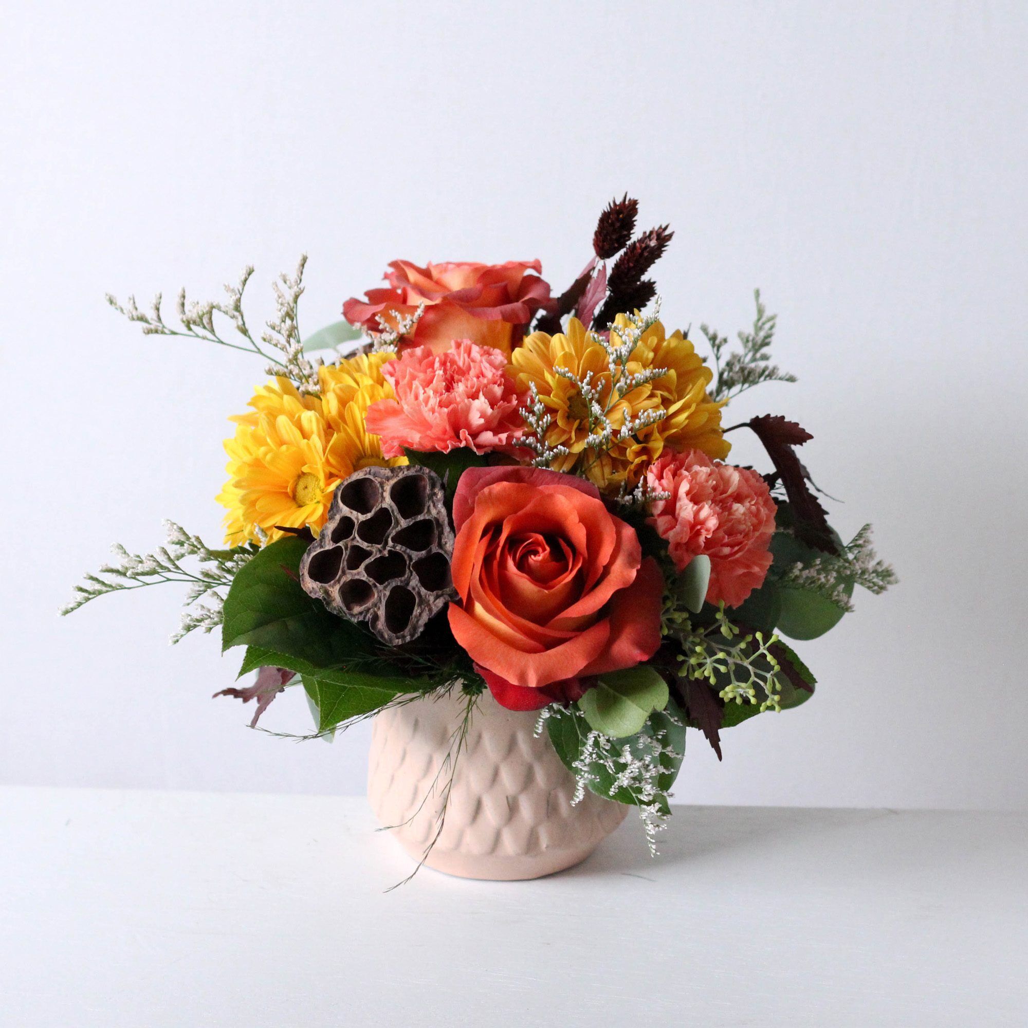 Fall mums, roses and autumnal foliage in a keep ceramic mermaid vase.